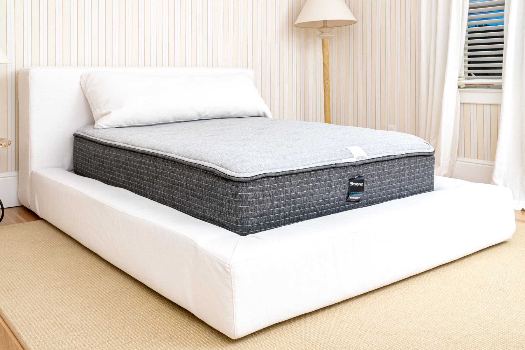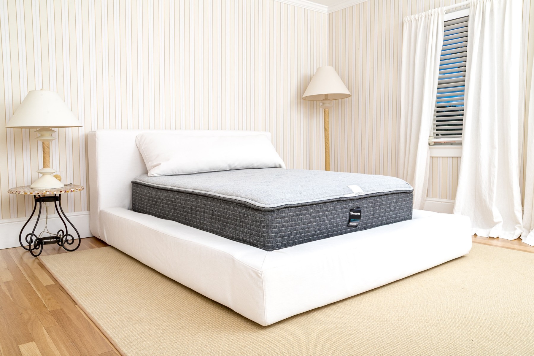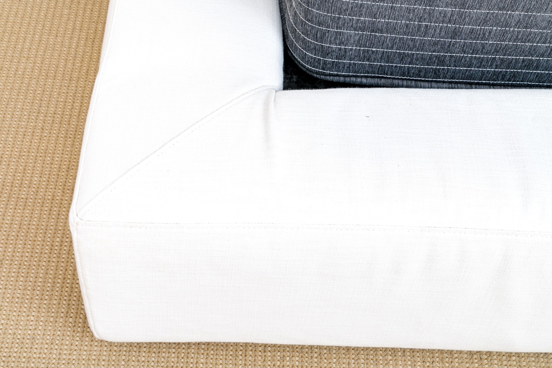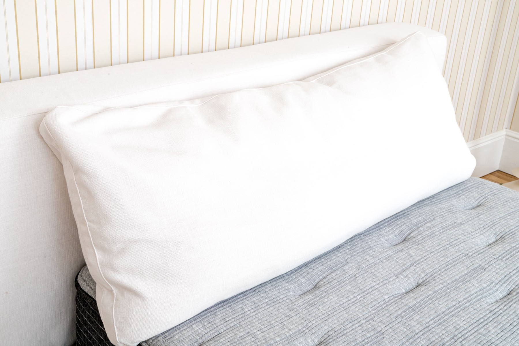 Handsomely upholstered in a white-cream hued upholstery with a straight headboard and minimalistic base.