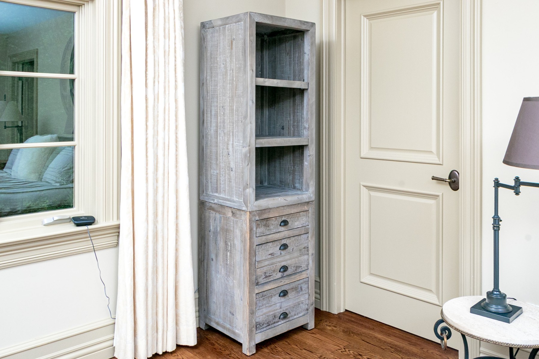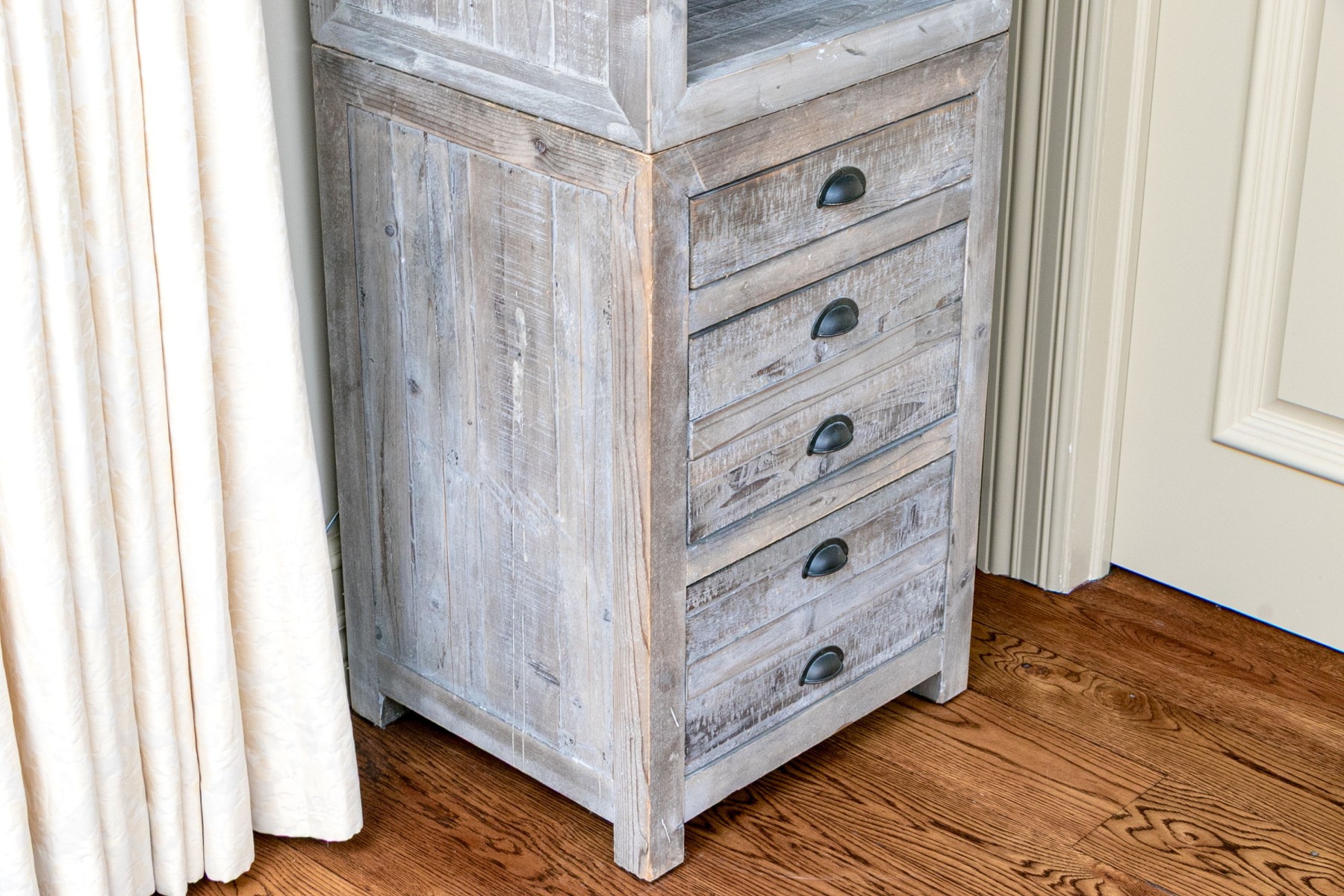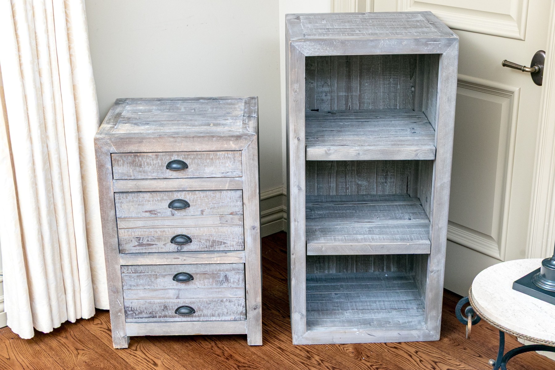 A stylish contemporary cabinet with a versatile design in two pieces, perfect for stacking or for use as a shelf and end table. The upper body sports two wood shelves, while the lower case holds five drawers with black metal cup pull handles. Finished in a beautifully rustic gray washed hue.