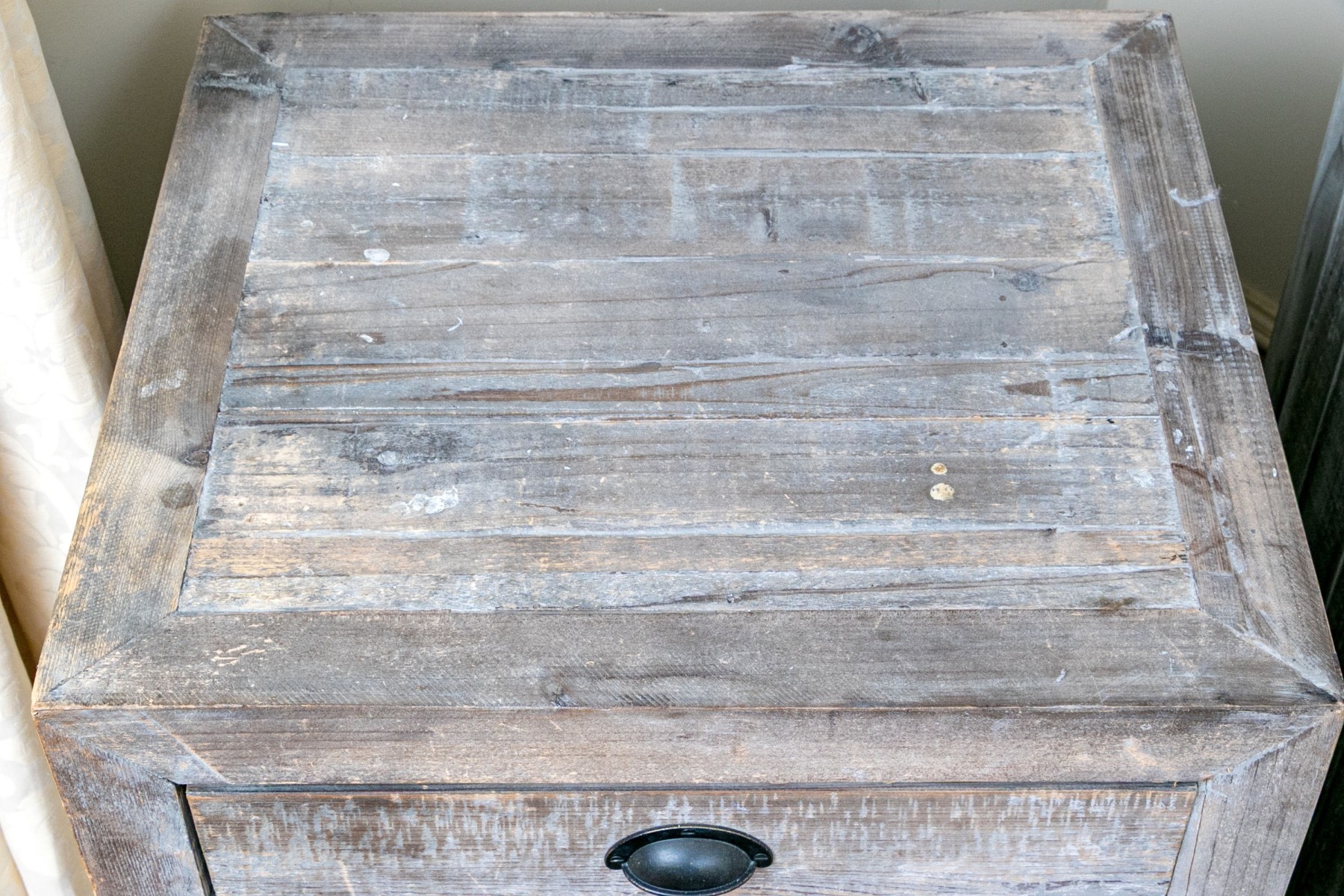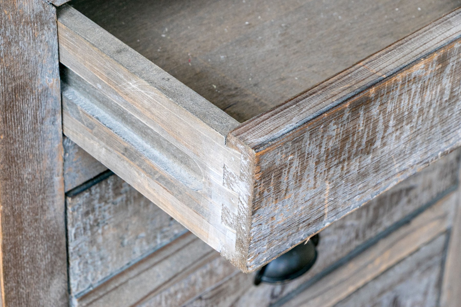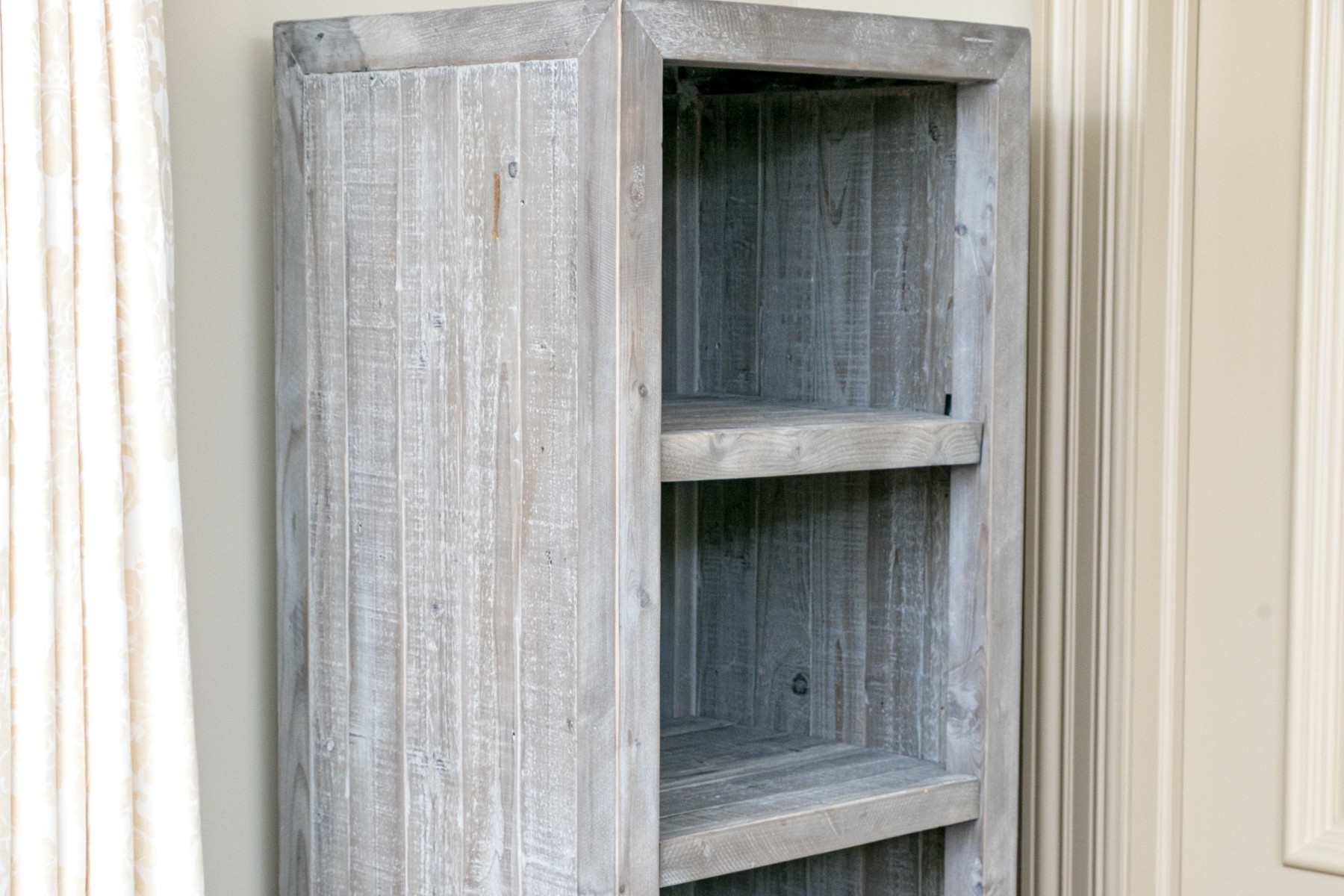 A stylish contemporary cabinet with a versatile design in two pieces, perfect for stacking or for use as a shelf and end table. The upper body sports two wood shelves, while the lower case holds five drawers with black metal cup pull handles. Finished in a beautifully rustic gray washed hue.