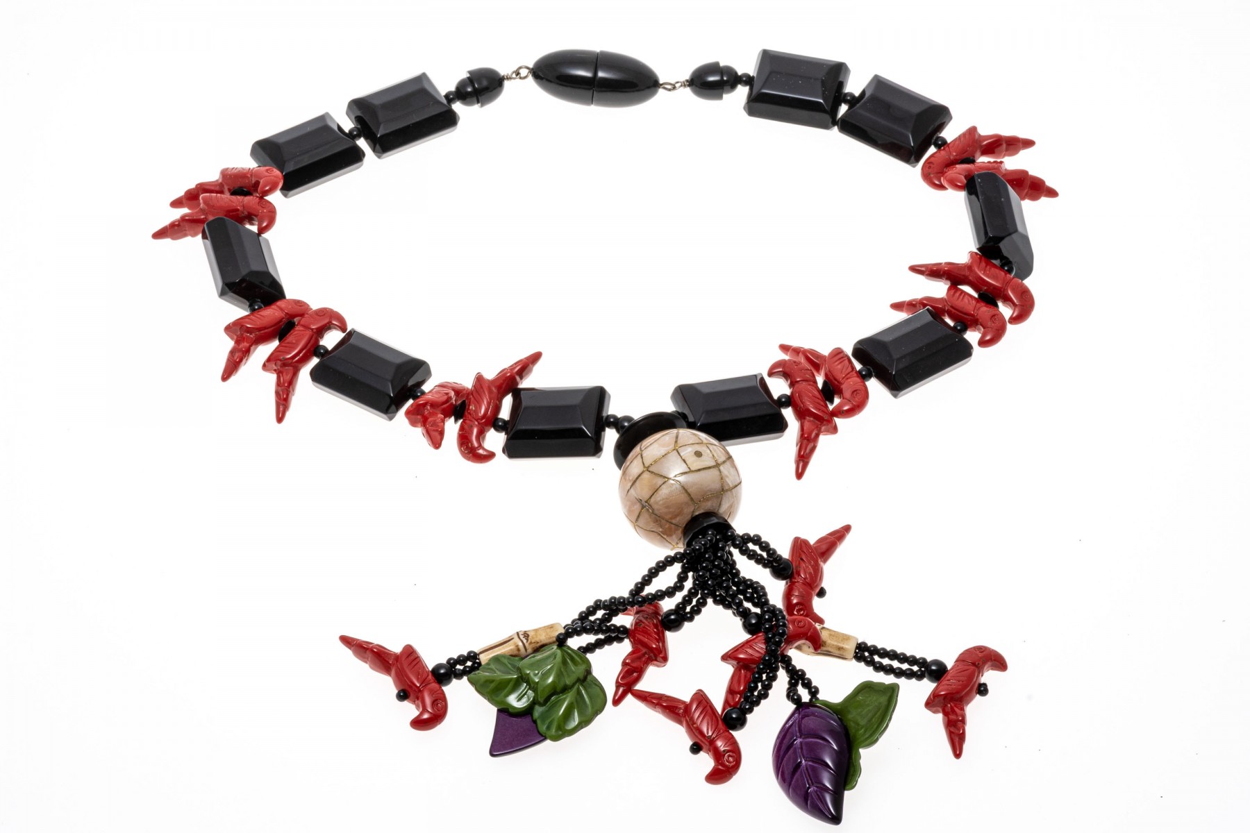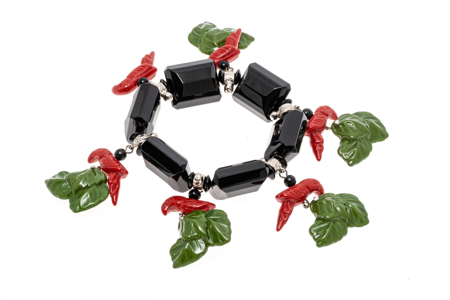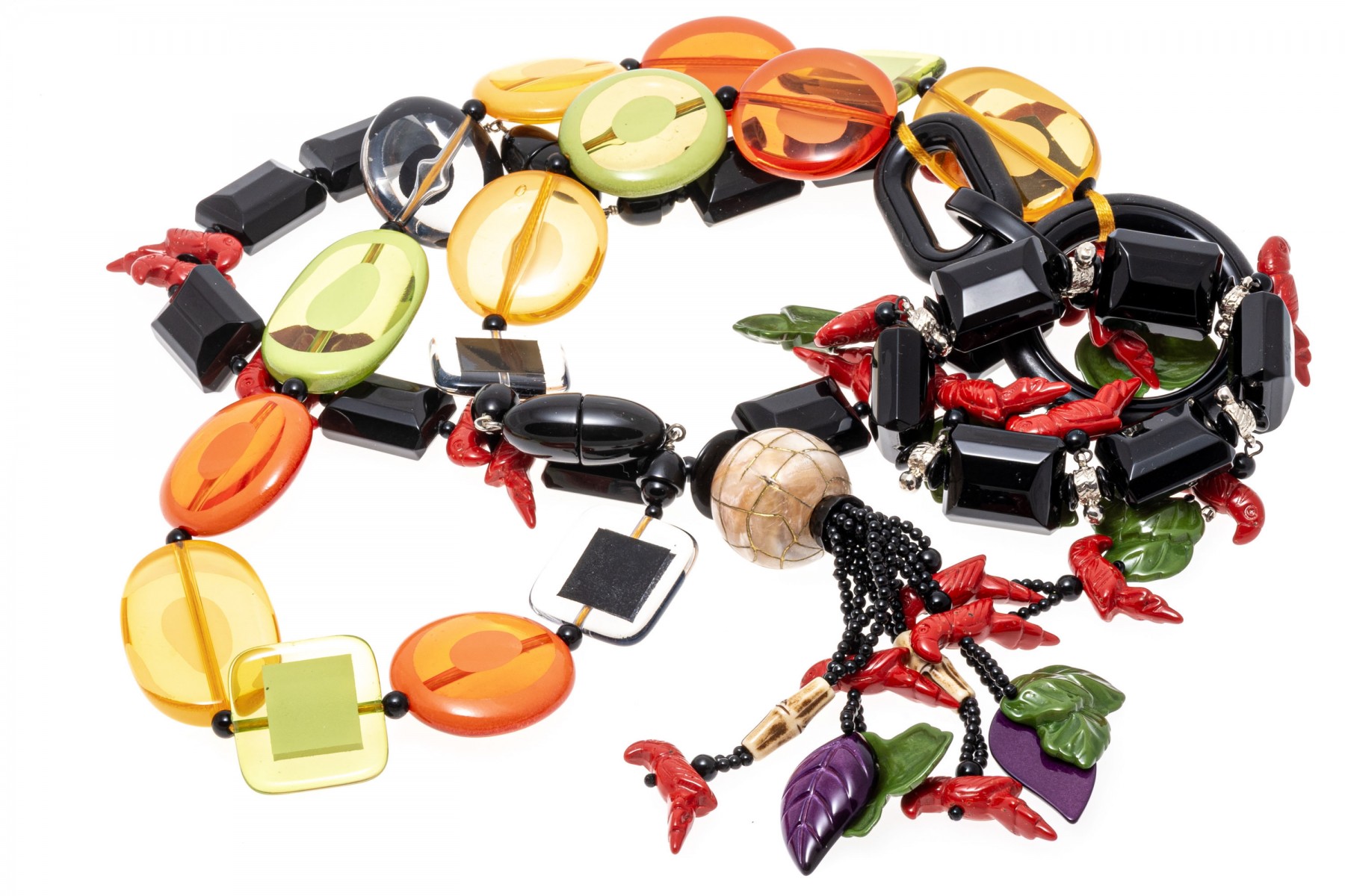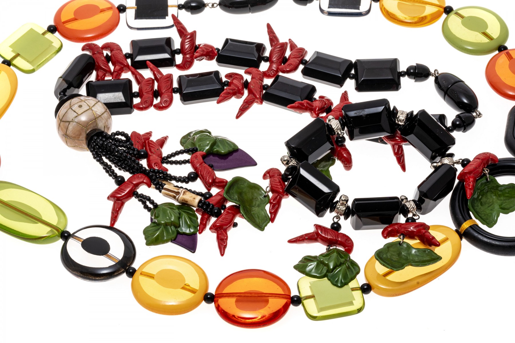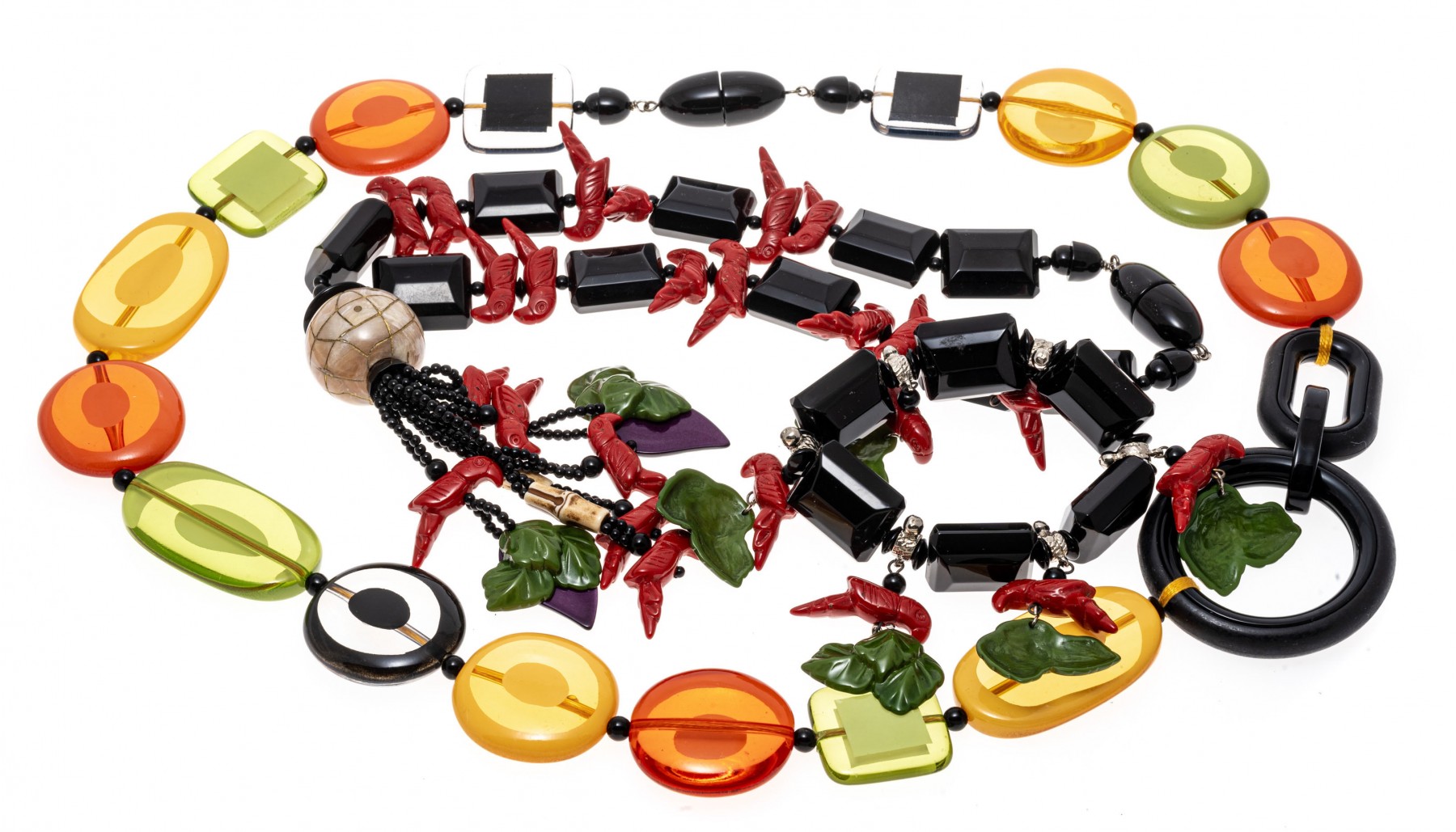 Retro fashion jewelry. Two necklaces with large colorful beads and carved parrot with leaves. A bracelet also has beads of parrots and leaves. Snap clasps of necklaces, bracelet stretches.