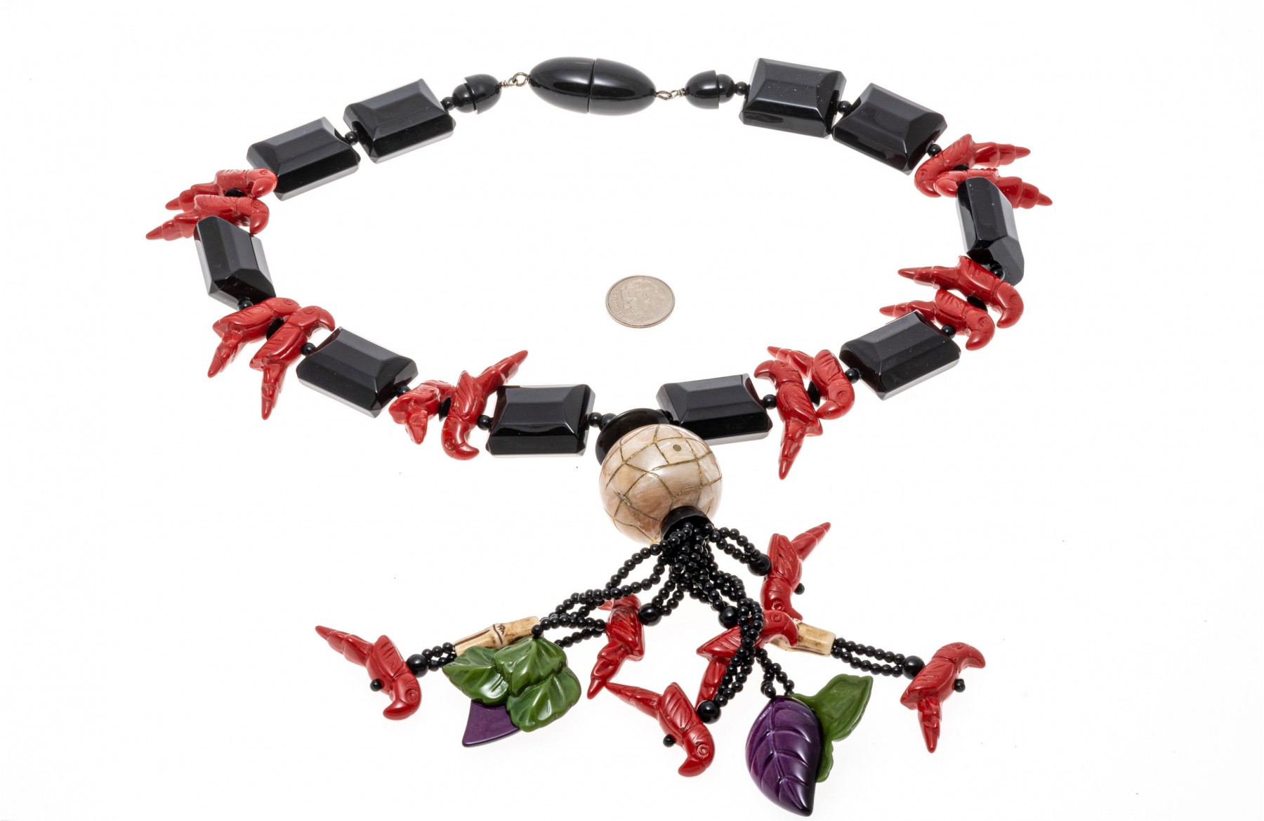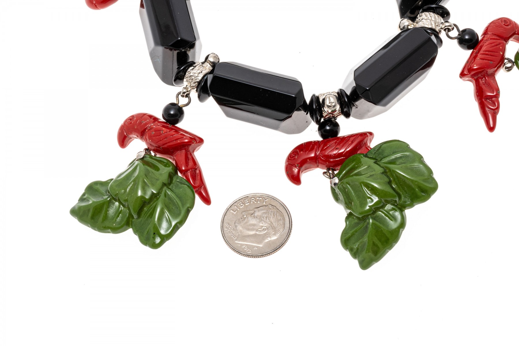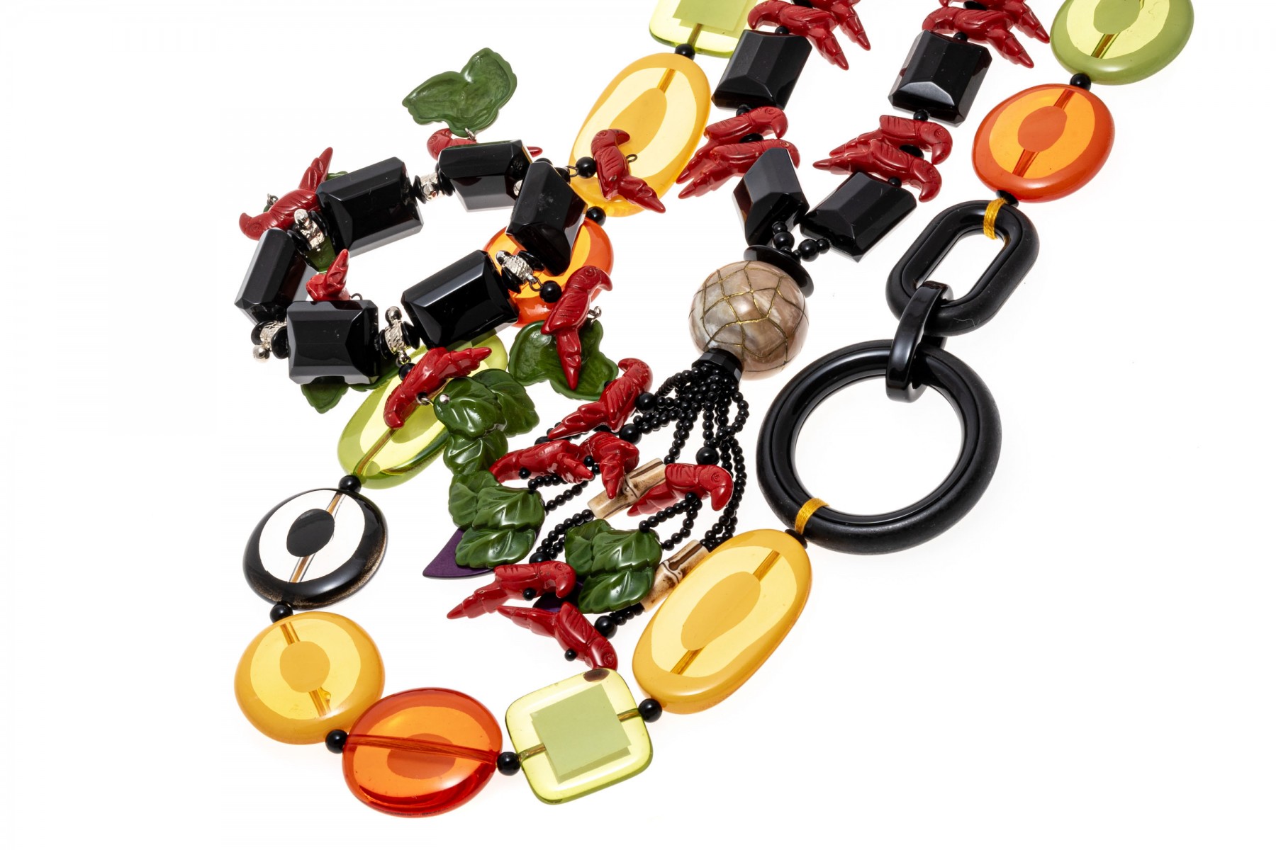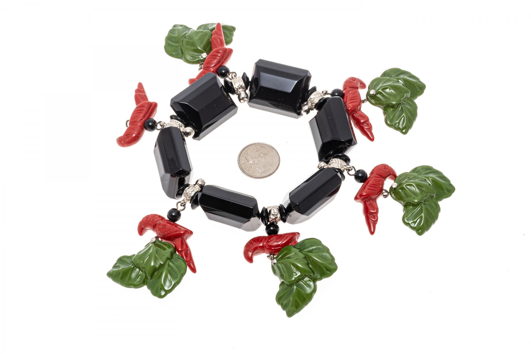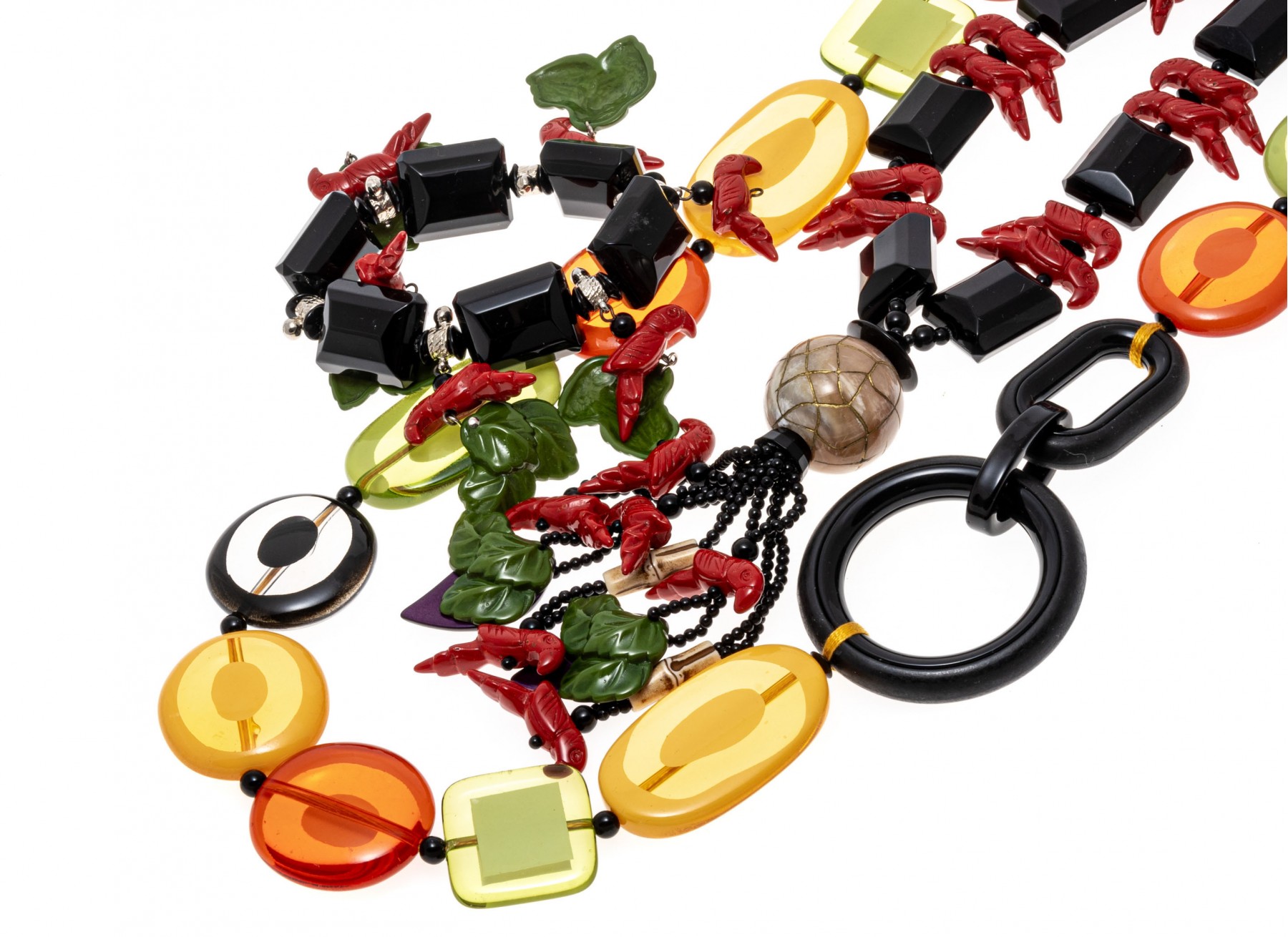 Retro fashion jewelry. Two necklaces with large colorful beads and carved parrot with leaves. A bracelet also has beads of parrots and leaves. Snap clasps of necklaces, bracelet stretches.