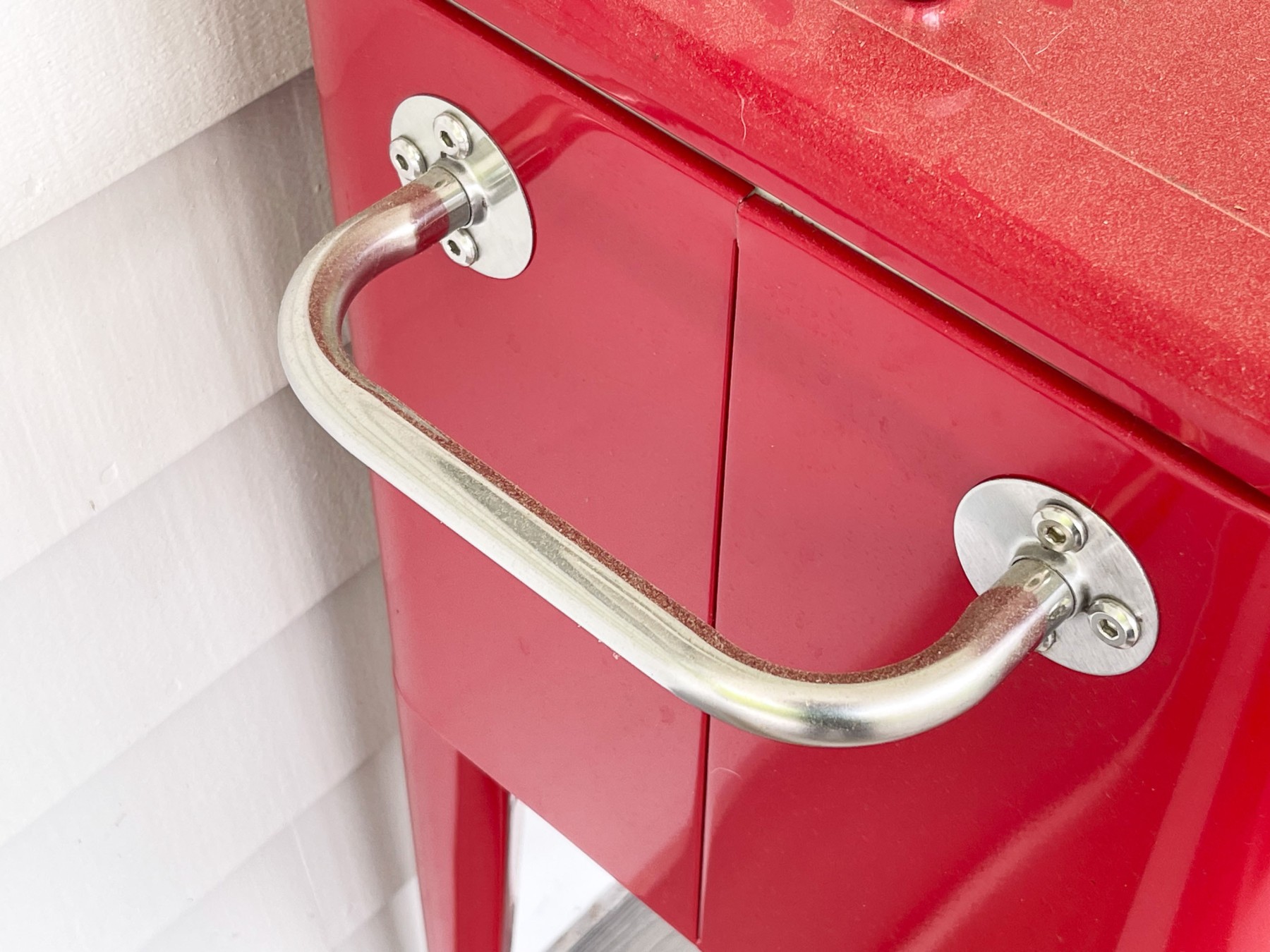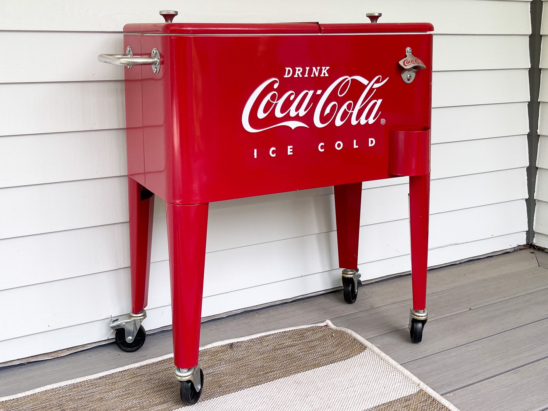 A fabulous retro style Coca-Cola branded cooler on casters in iconic red.