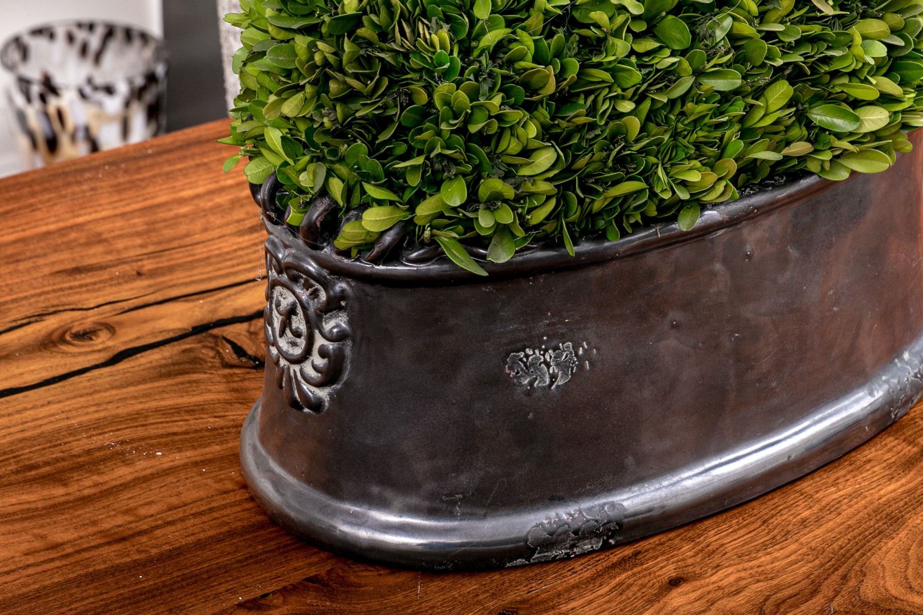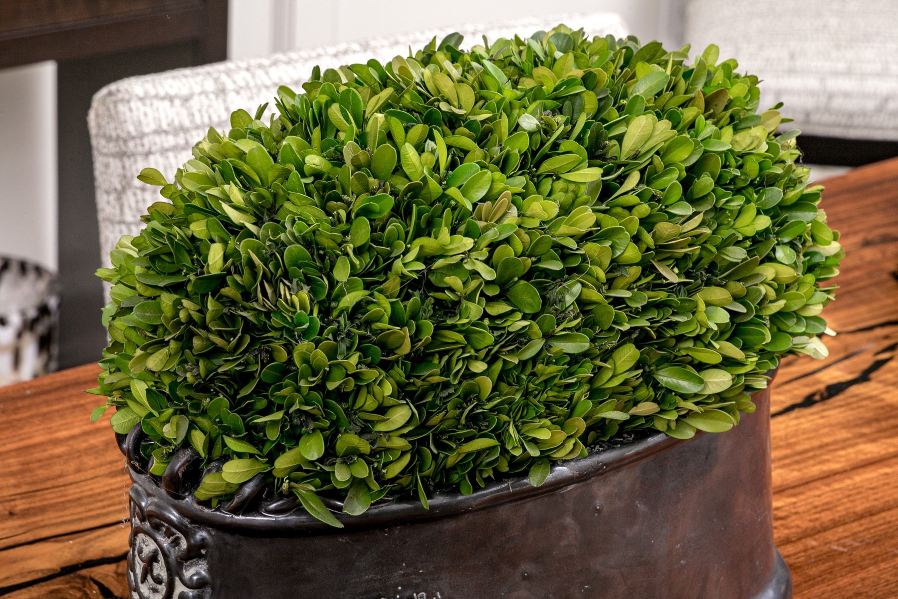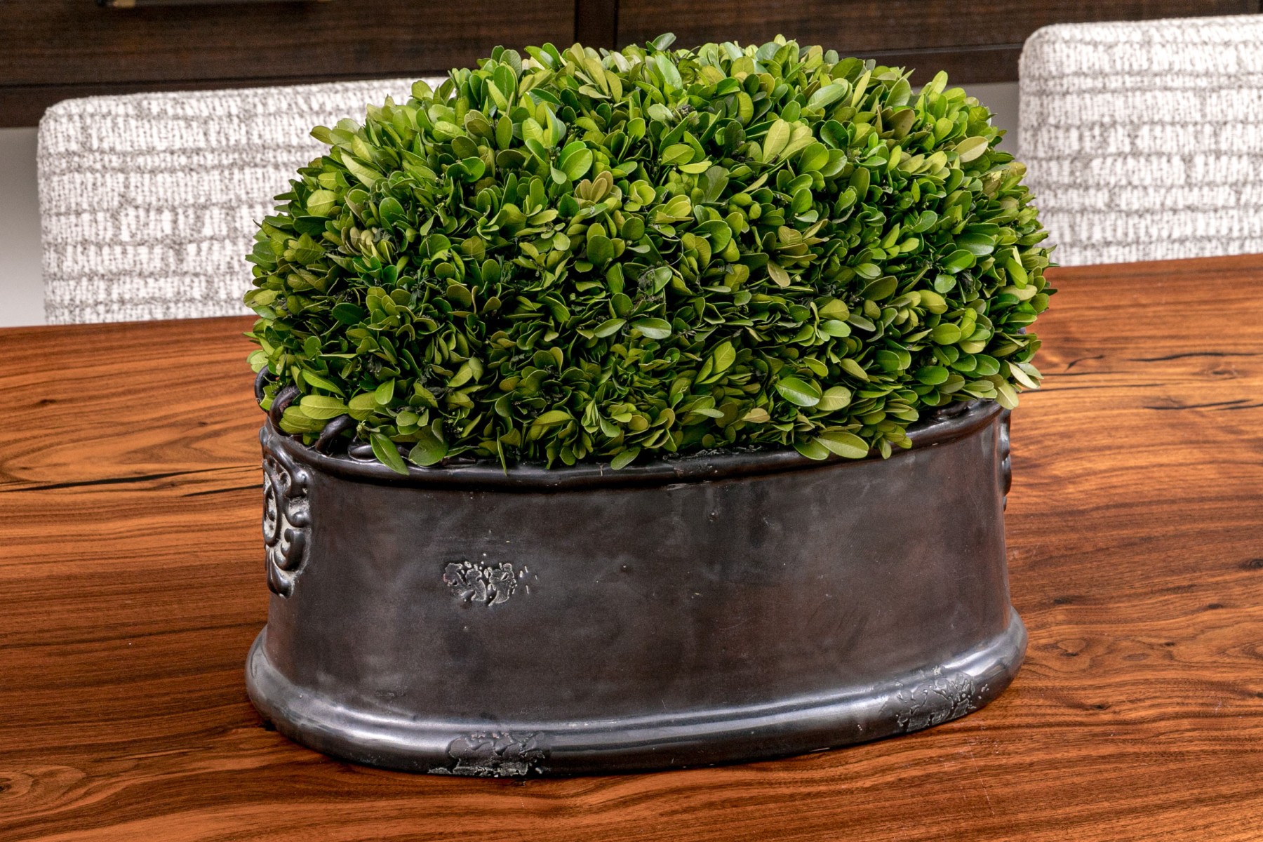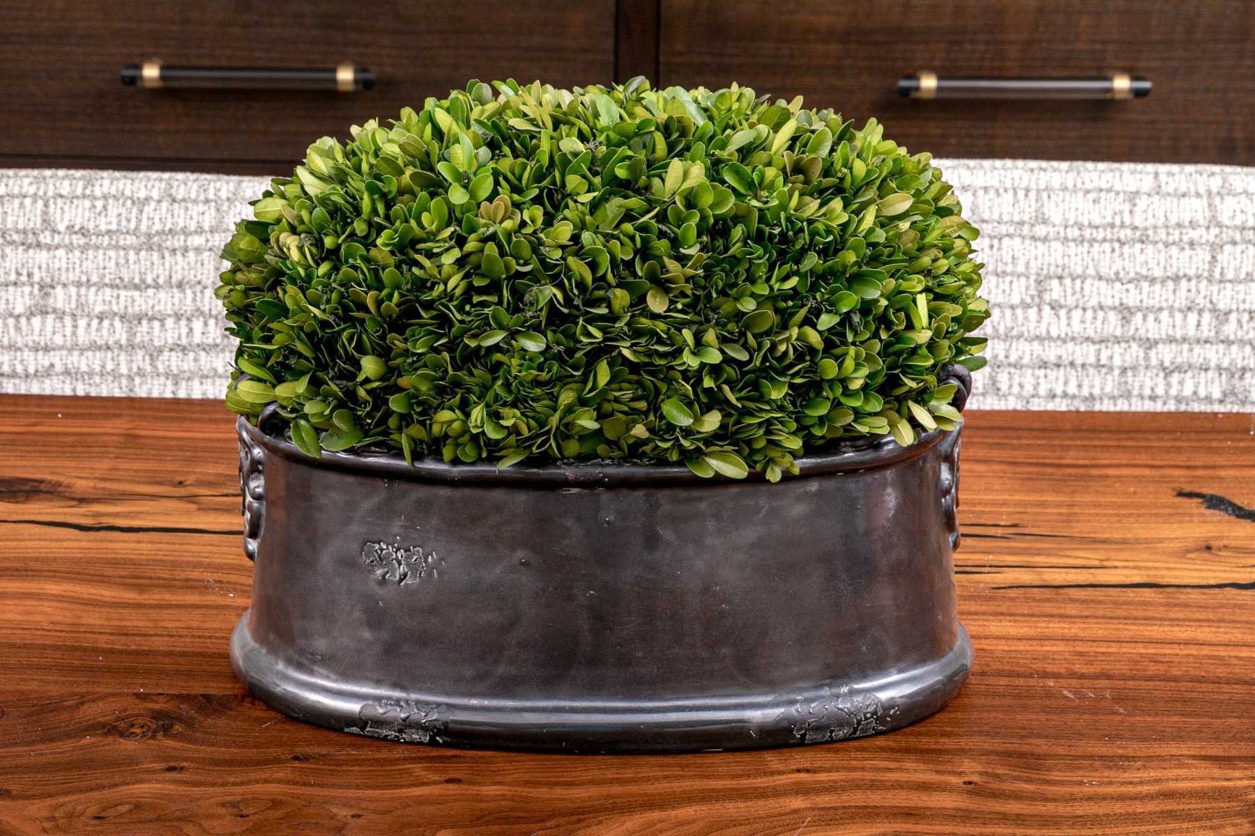 Revelation by Uttermost centerpiece featuring a dome of preserved boxwood greenery in a gray luster glazed ceramic oval planter with scrolled relief at the sides.