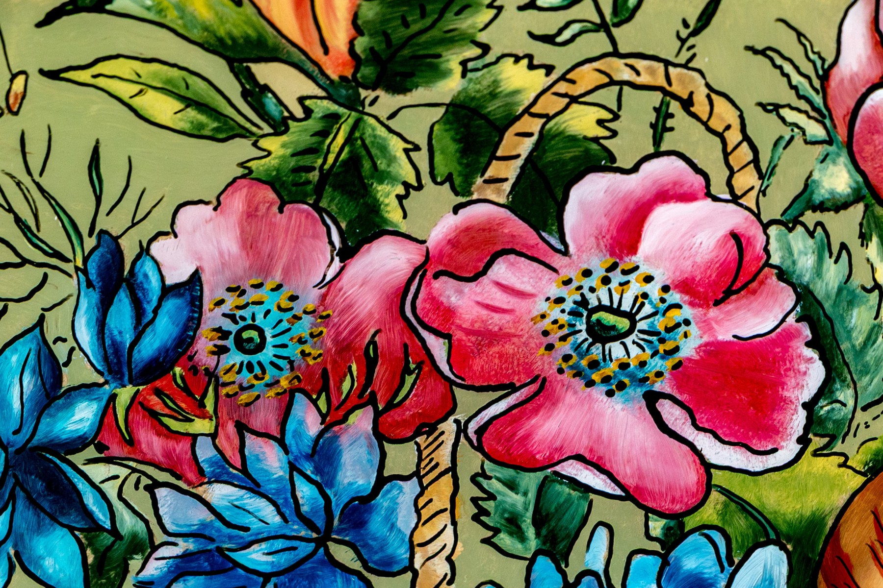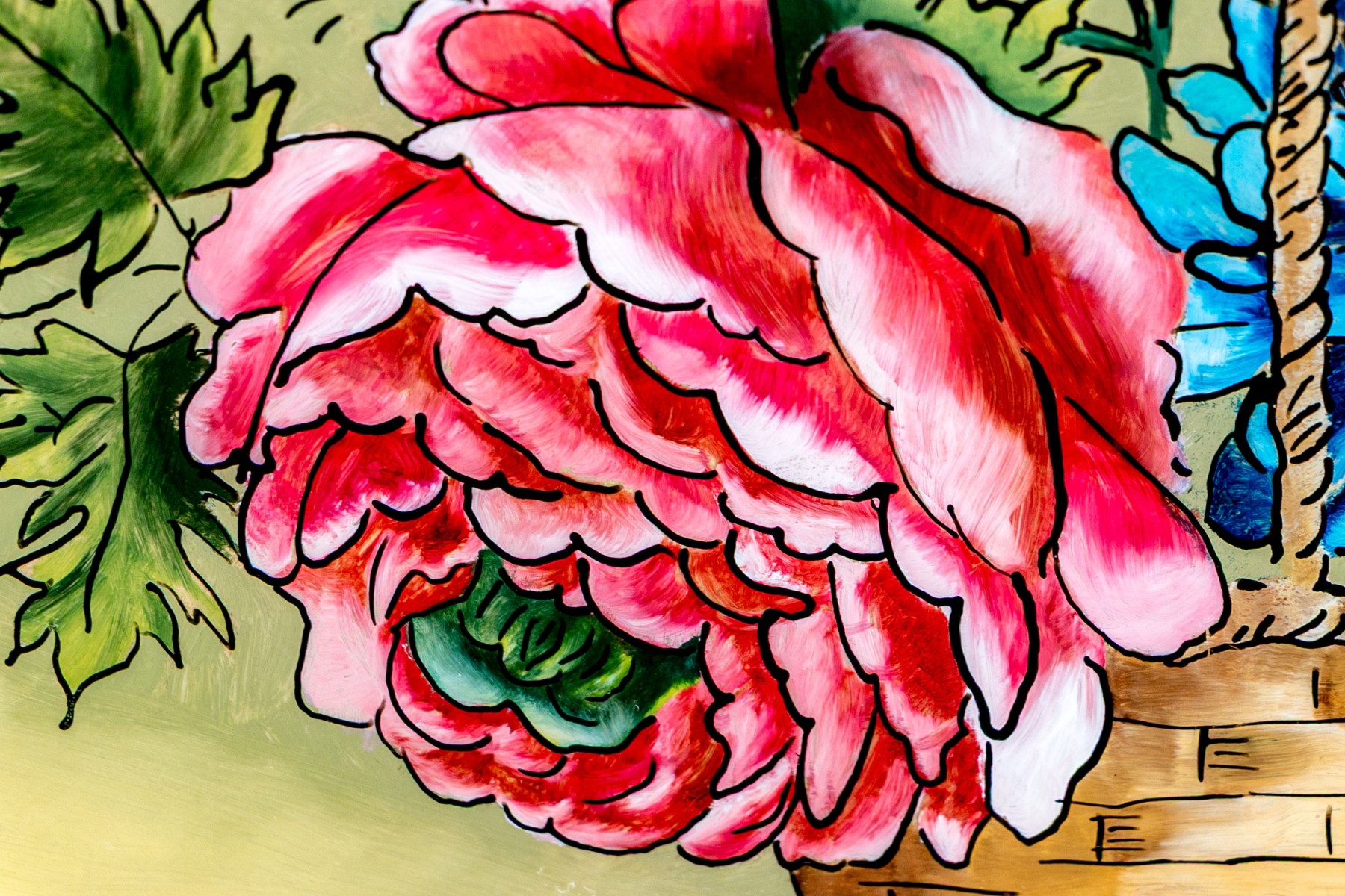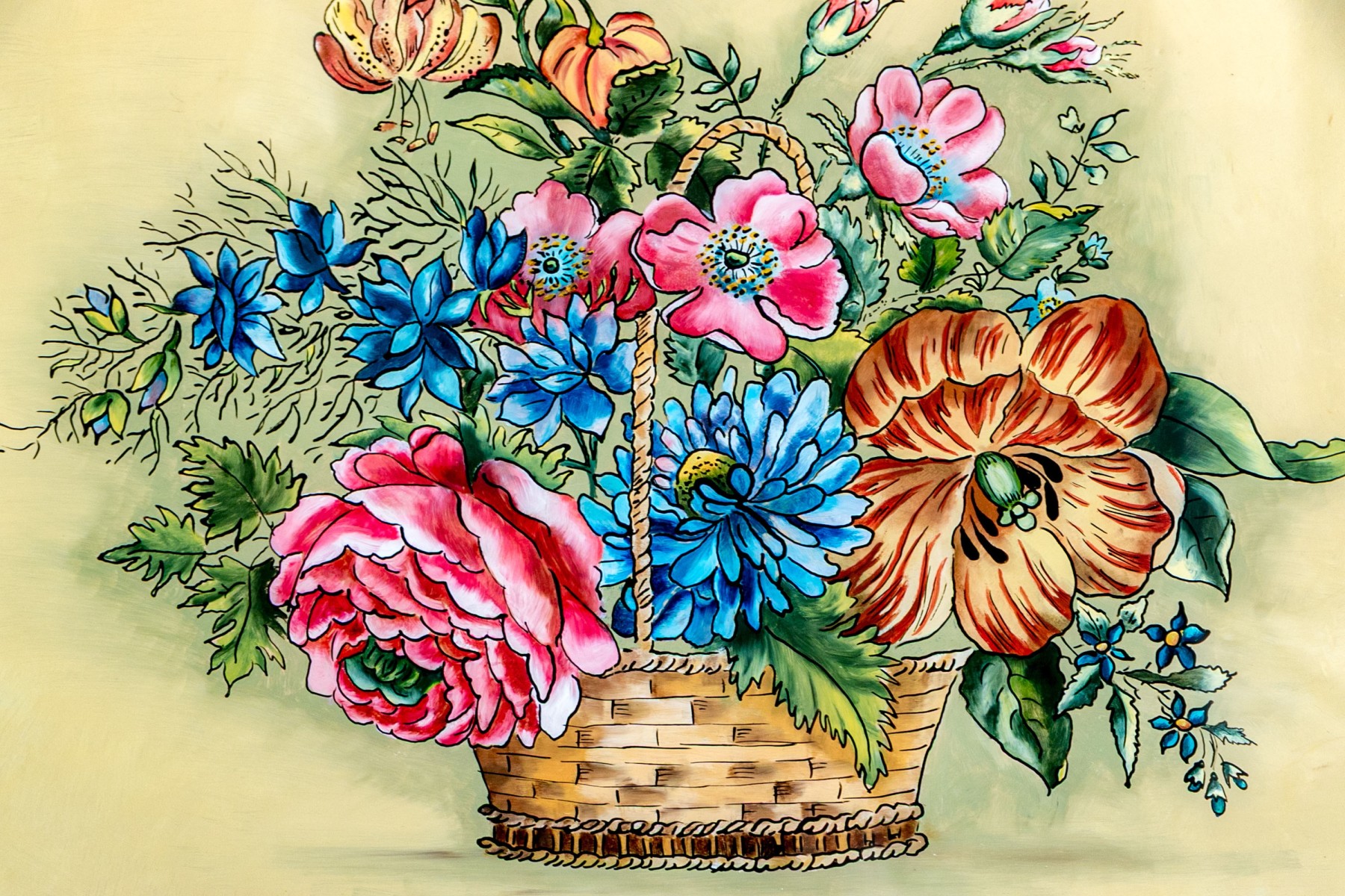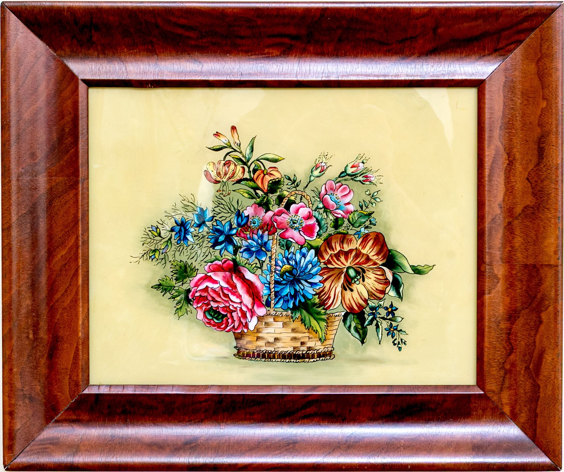 A fabulous reverse painted glass still life of a woven basket supporting a burgeoning bouquet of vibrant flowers including a fabulously painted peony. The palette comprised of orange, pink, blue, and yellow with lush green foliage against a yellow background.