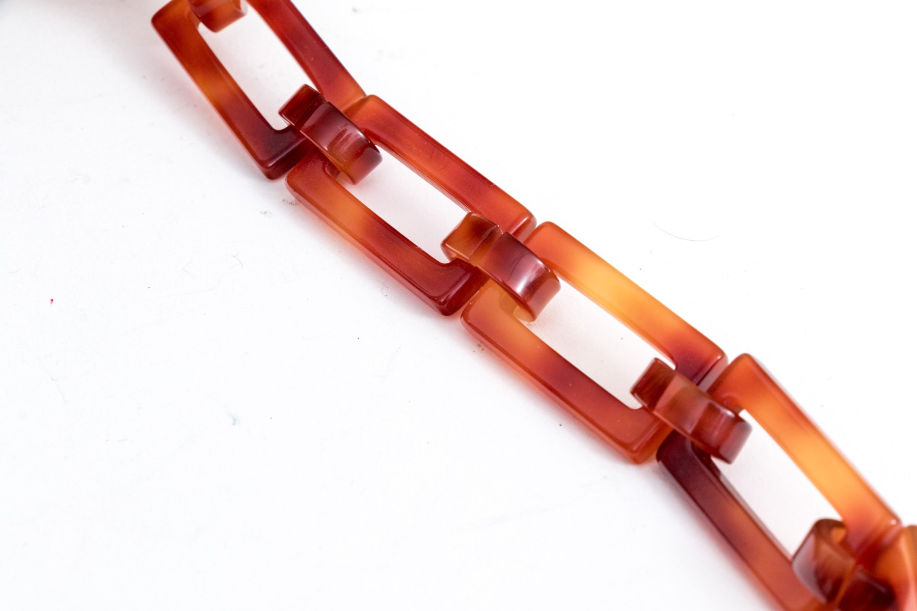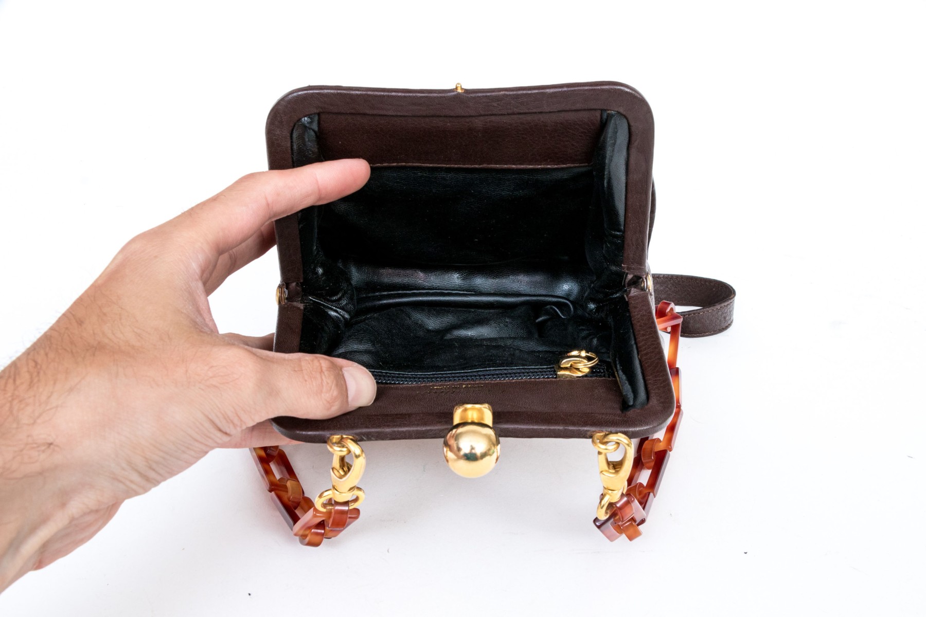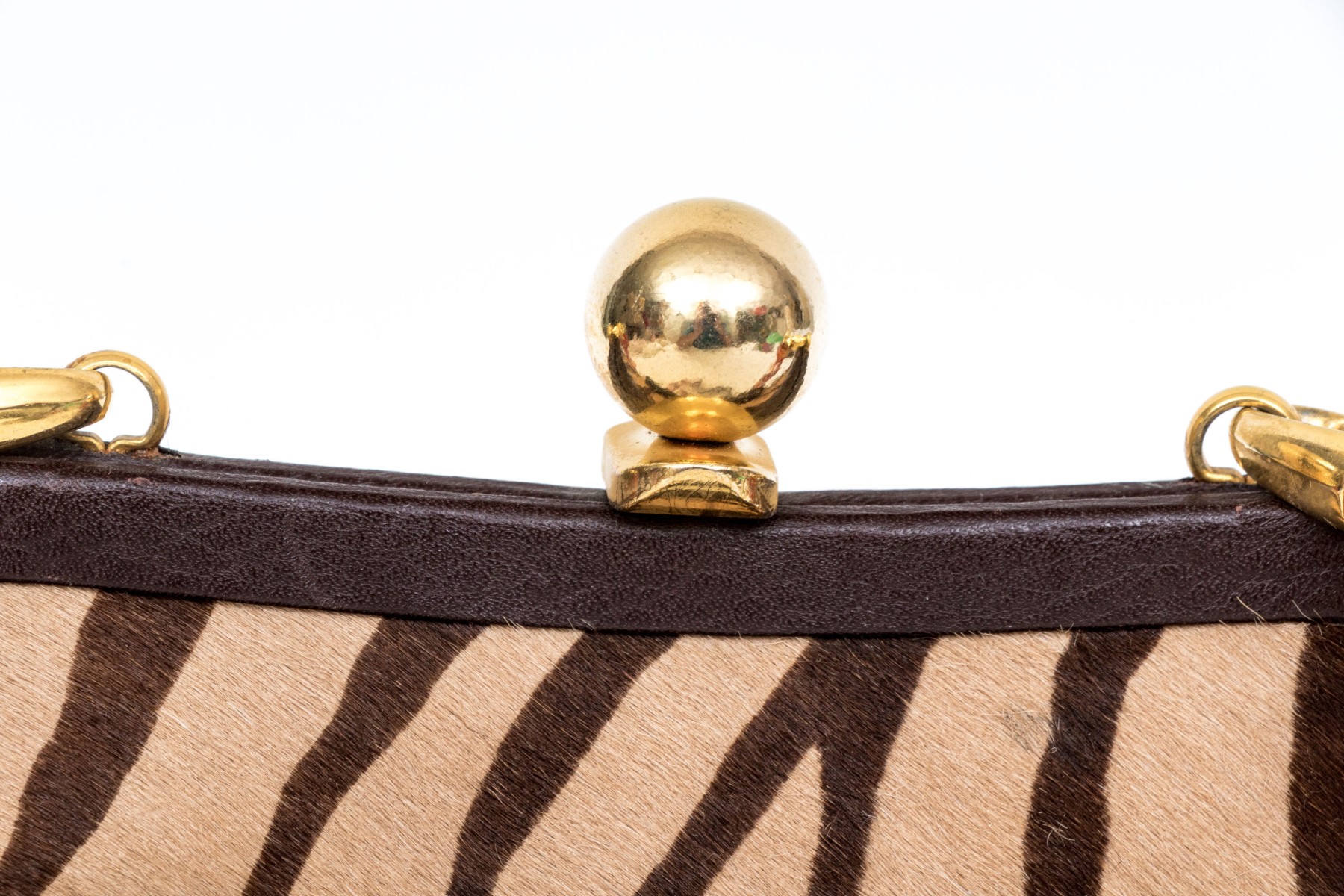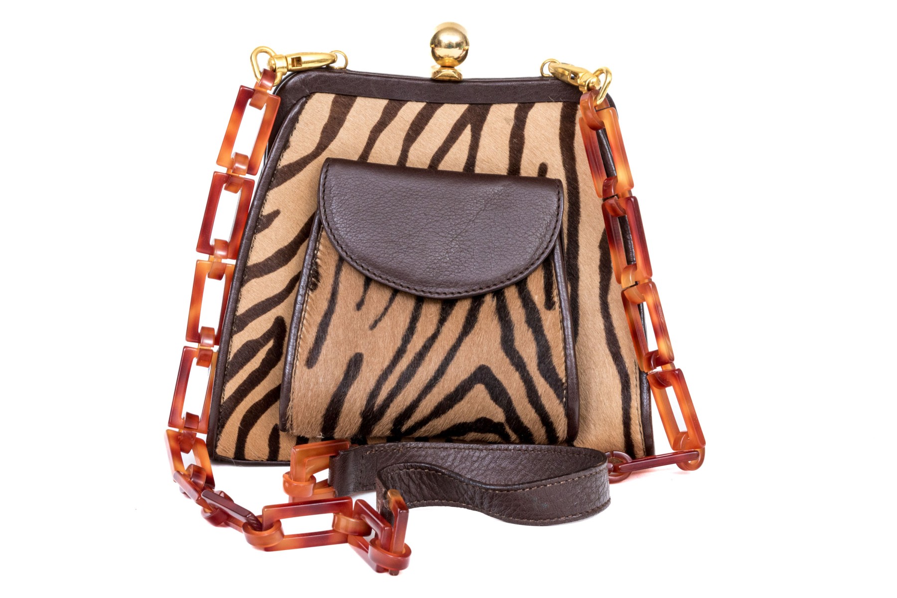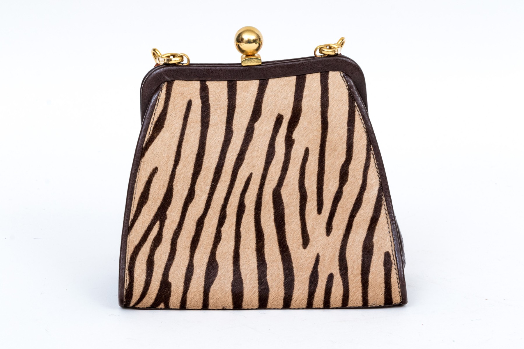 An eye-catching Revillon convertible clutch/shoulder bag in pony hair leather and dark brown leather, showcasing a tiger stripe pattern over a cute trapezoidal body. Features an outer pocket and a removable mottled orange acrylic chain strap.