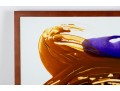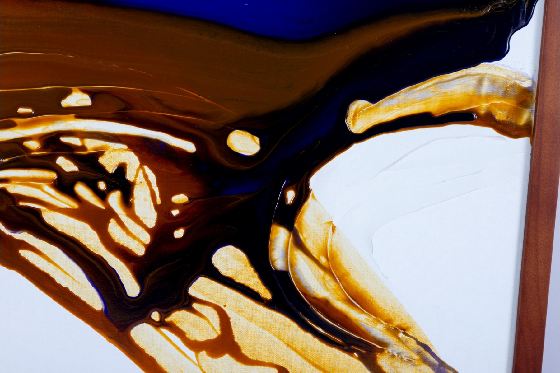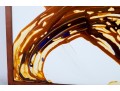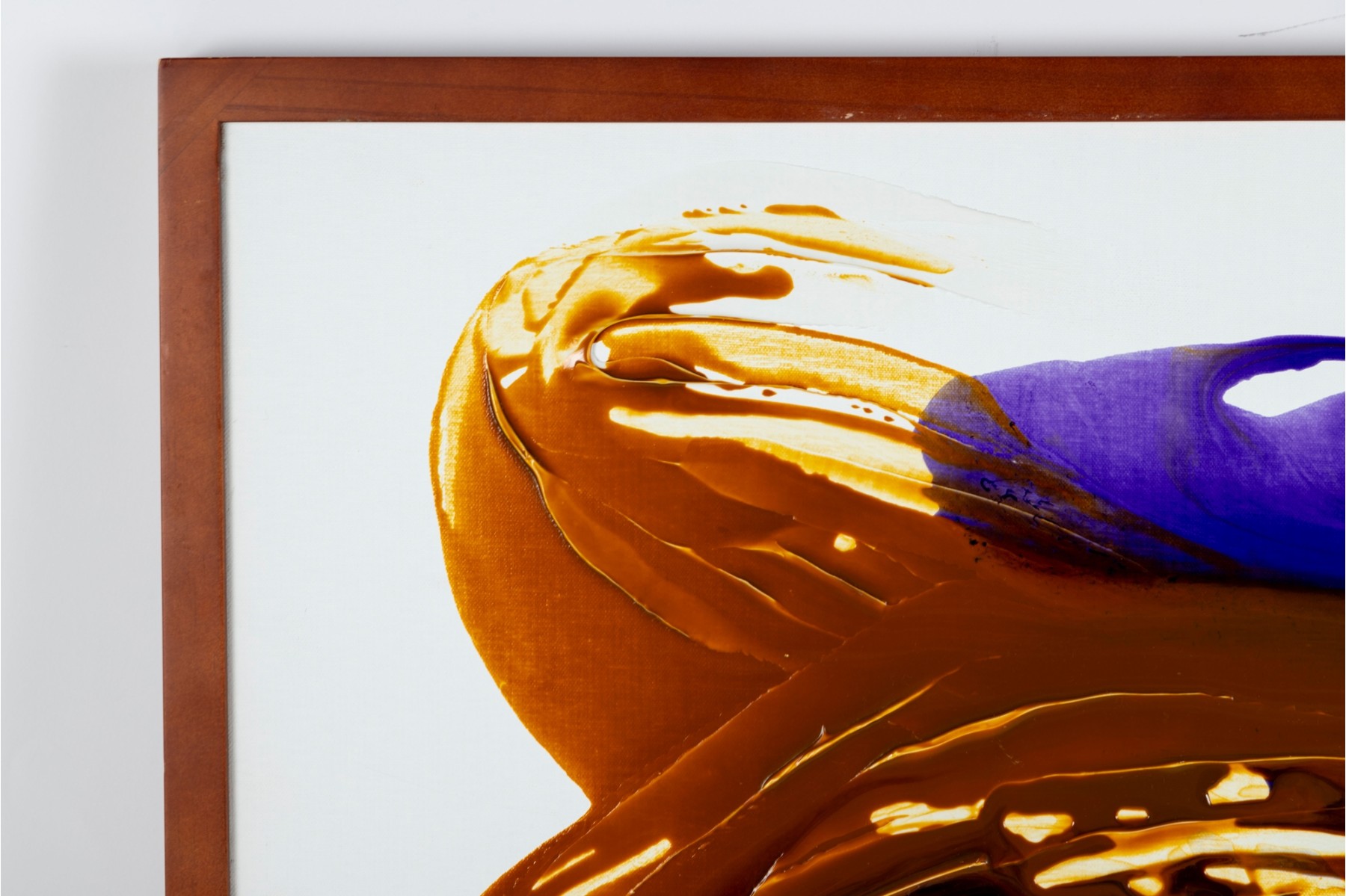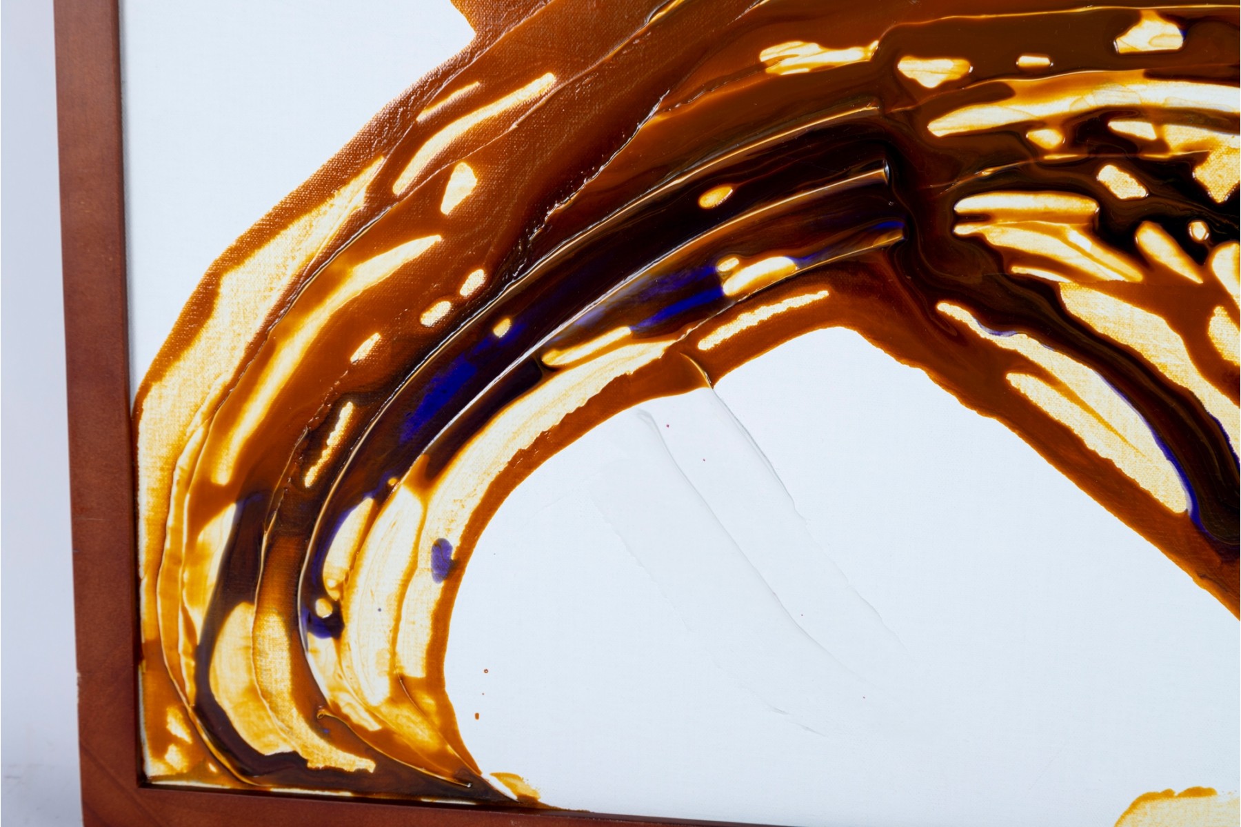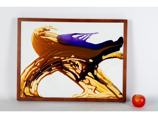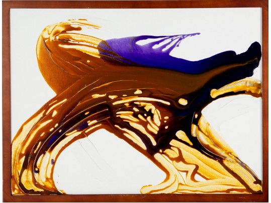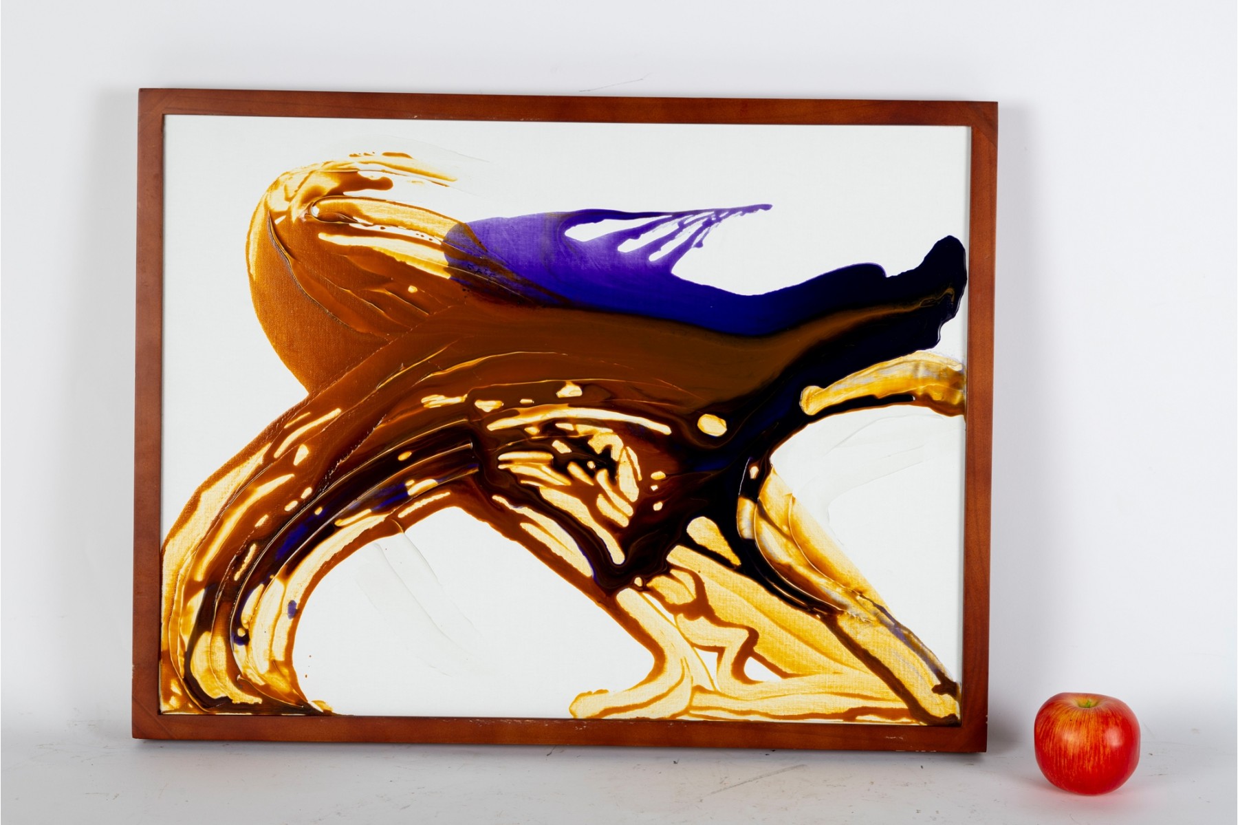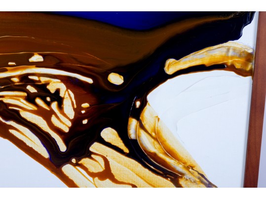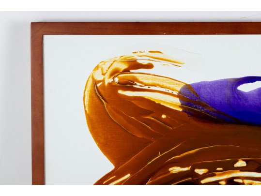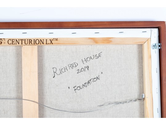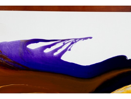 Richard House (American [NC], 20th C.) "Foundation" acrylic on canvas depicting eye-catching amber brown and purple forms with gestural strokes creating the appearance of splashes of fluid catching light against a white background. Signed, dated, and titled on the canvas verso.