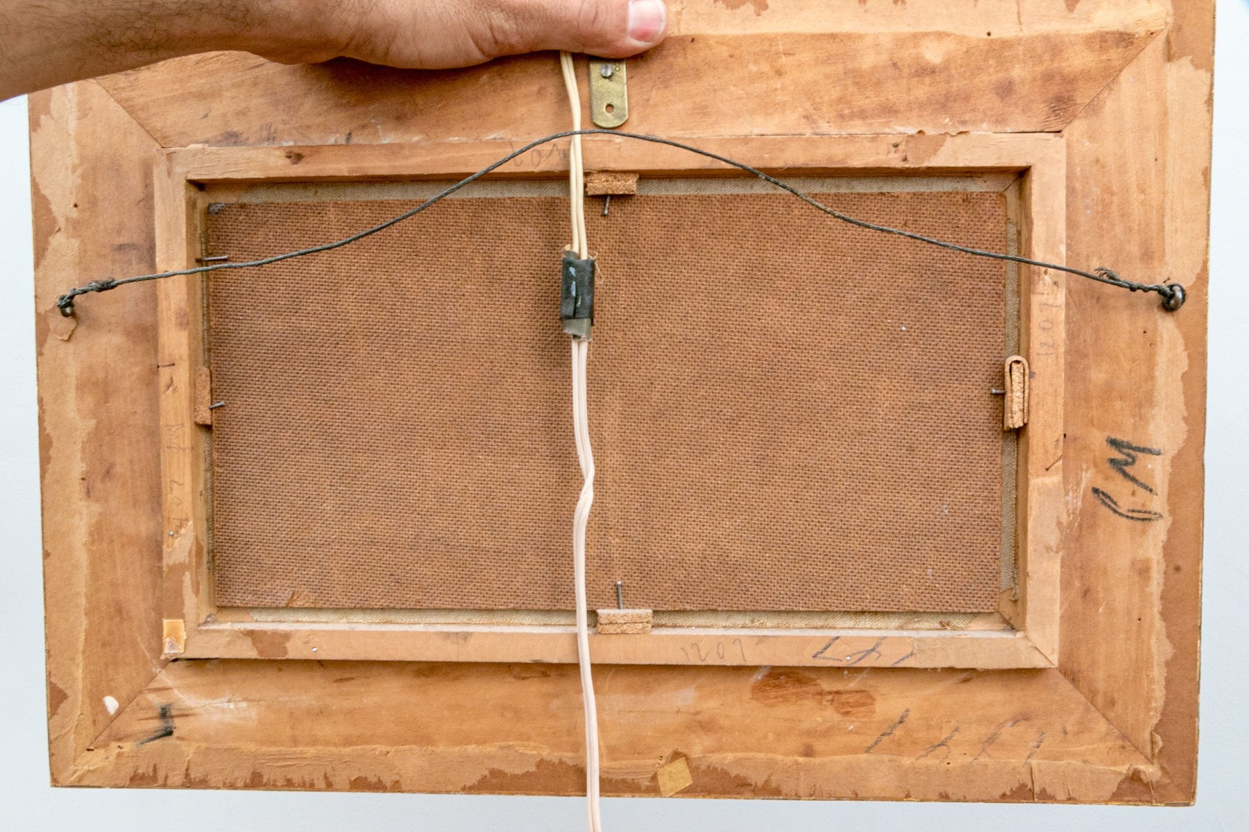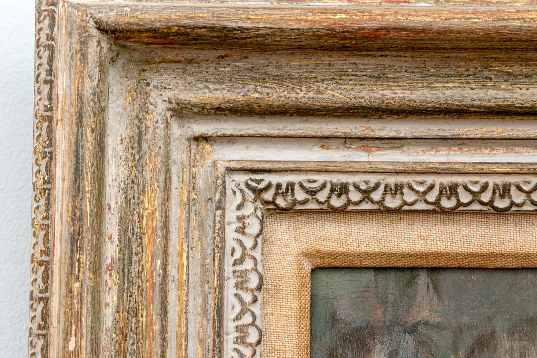 Presented with a linen filet, within an antiqued parcel gilt finished carved wood frame with mounted frame lamp.