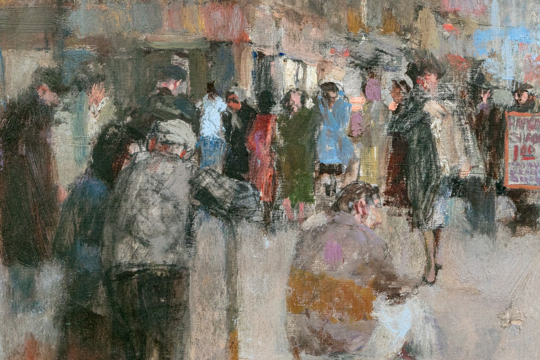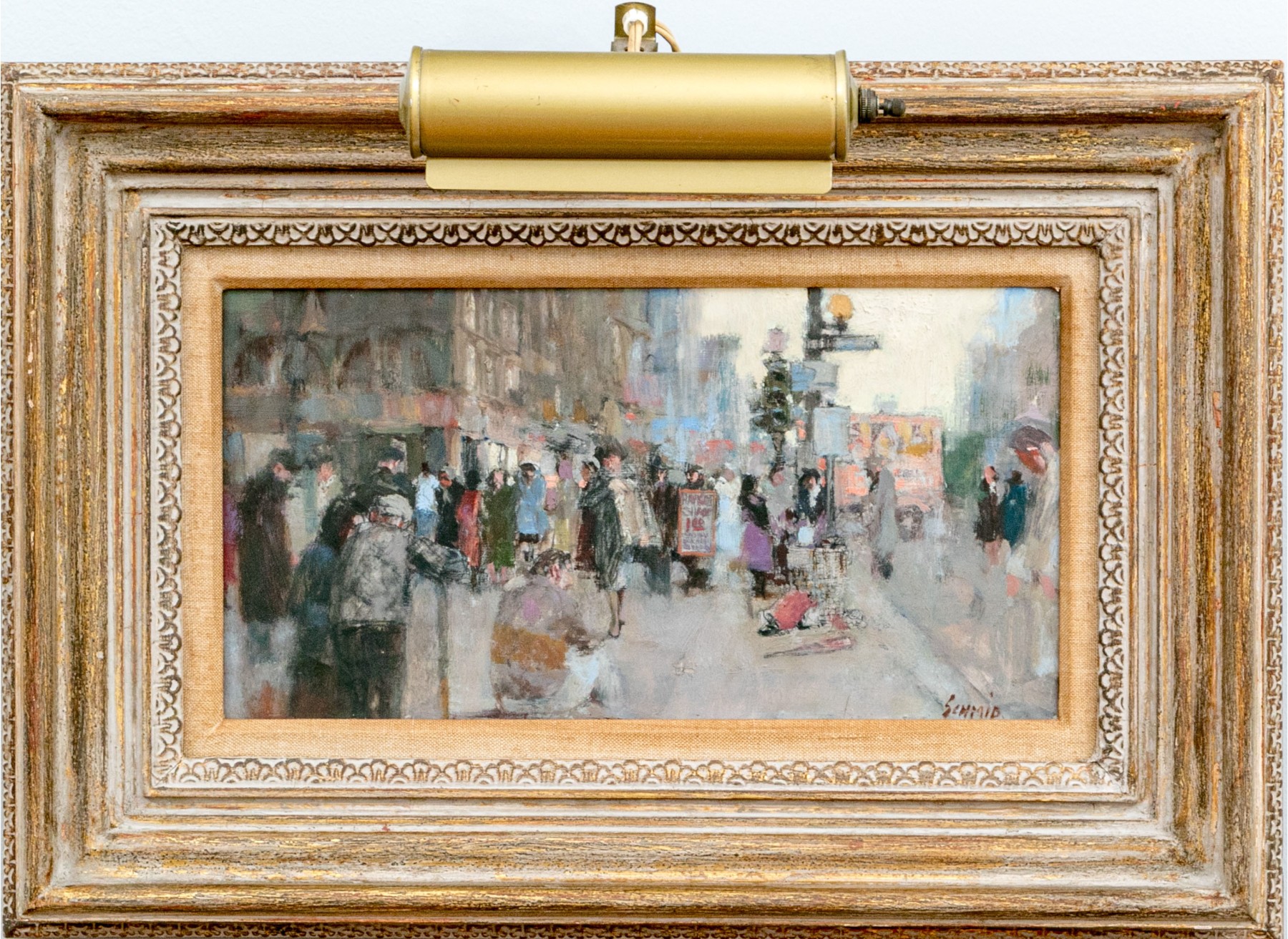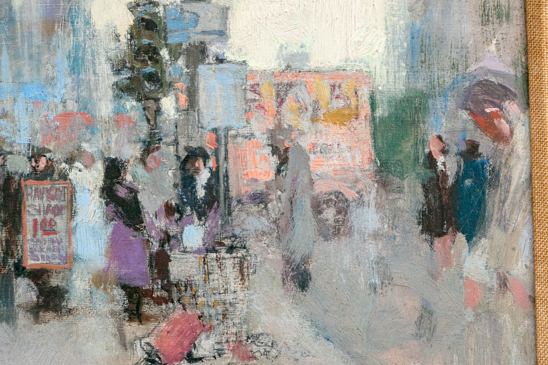 An oil on board painting by American artist Richard Scmid, depicting an Impressionistic work a la plein air, depicting New York as an urban street corner with a plethora of people in various states of movement. Some in the foreground holding signs for advertisement with a lamp post and street sign in the distance.