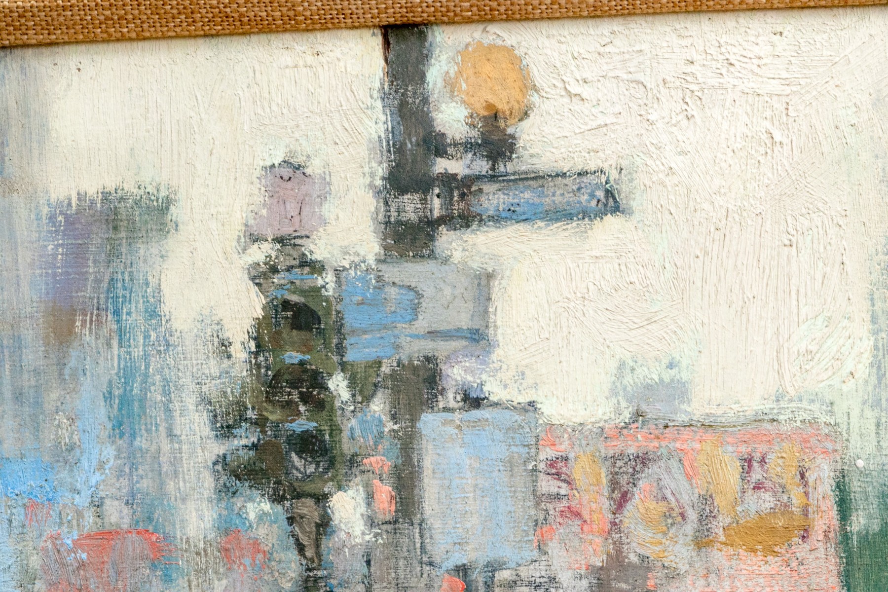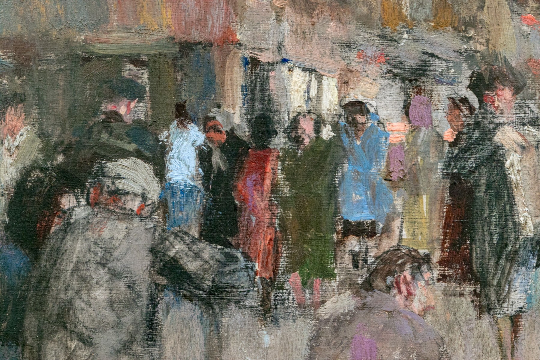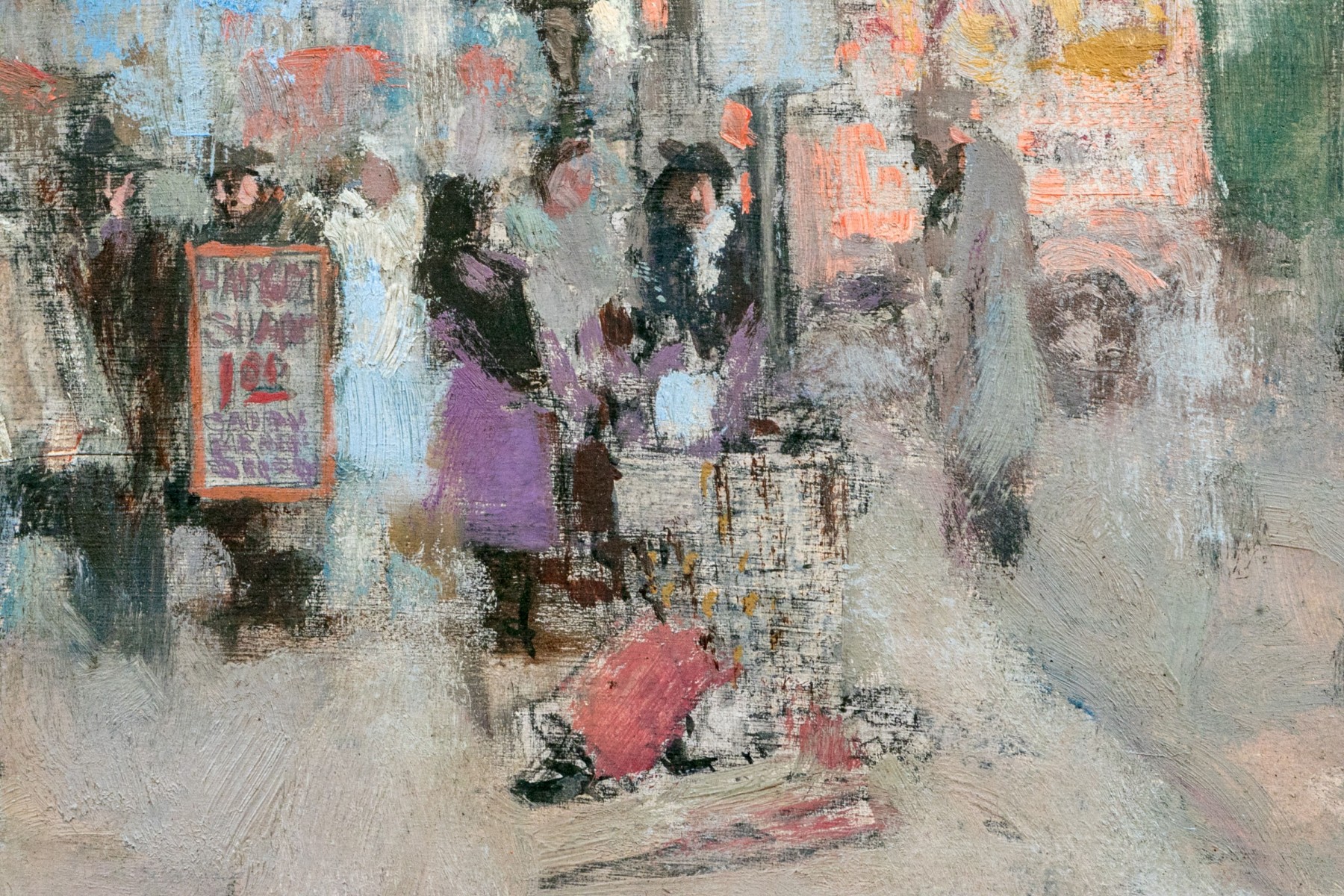 An oil on board painting by American artist Richard Scmid, depicting an Impressionistic work a la plein air, depicting New York as an urban street corner with a plethora of people in various states of movement. Some in the foreground holding signs for advertisement with a lamp post and street sign in the distance.