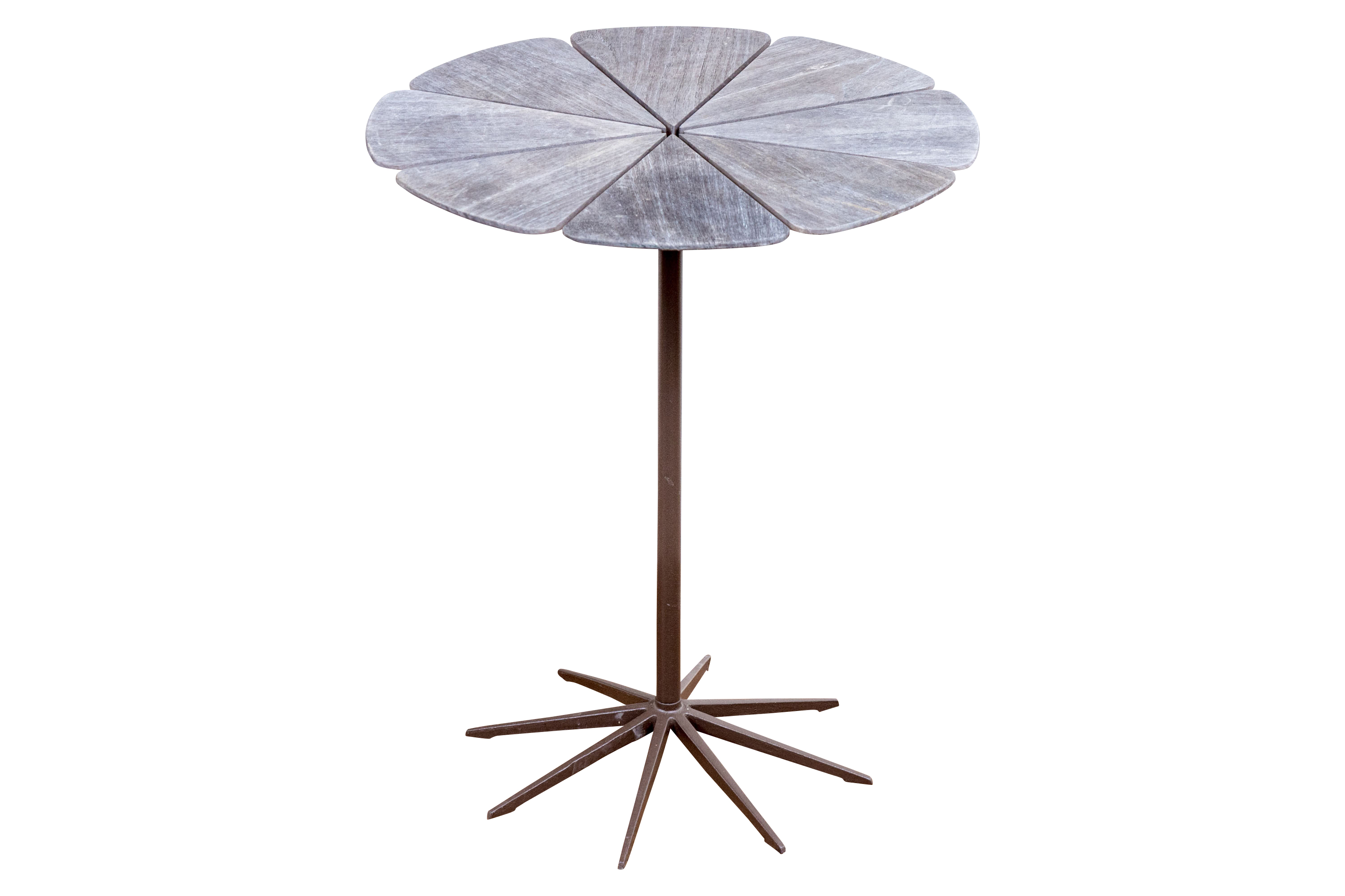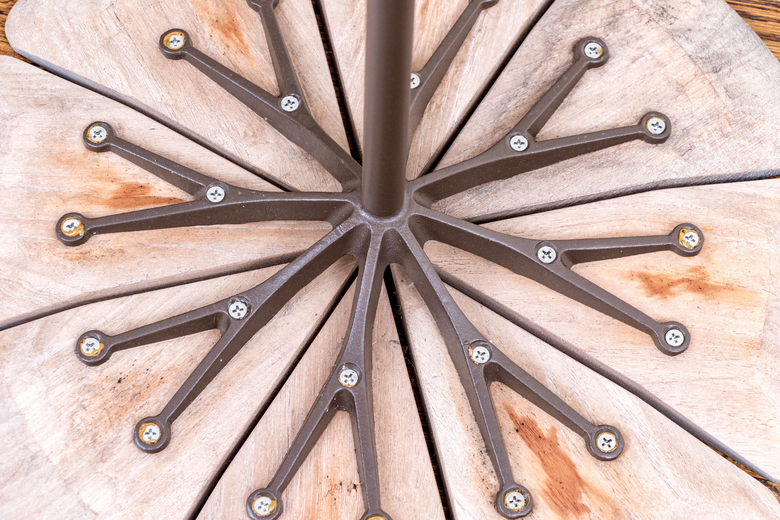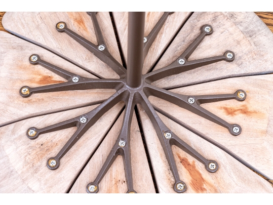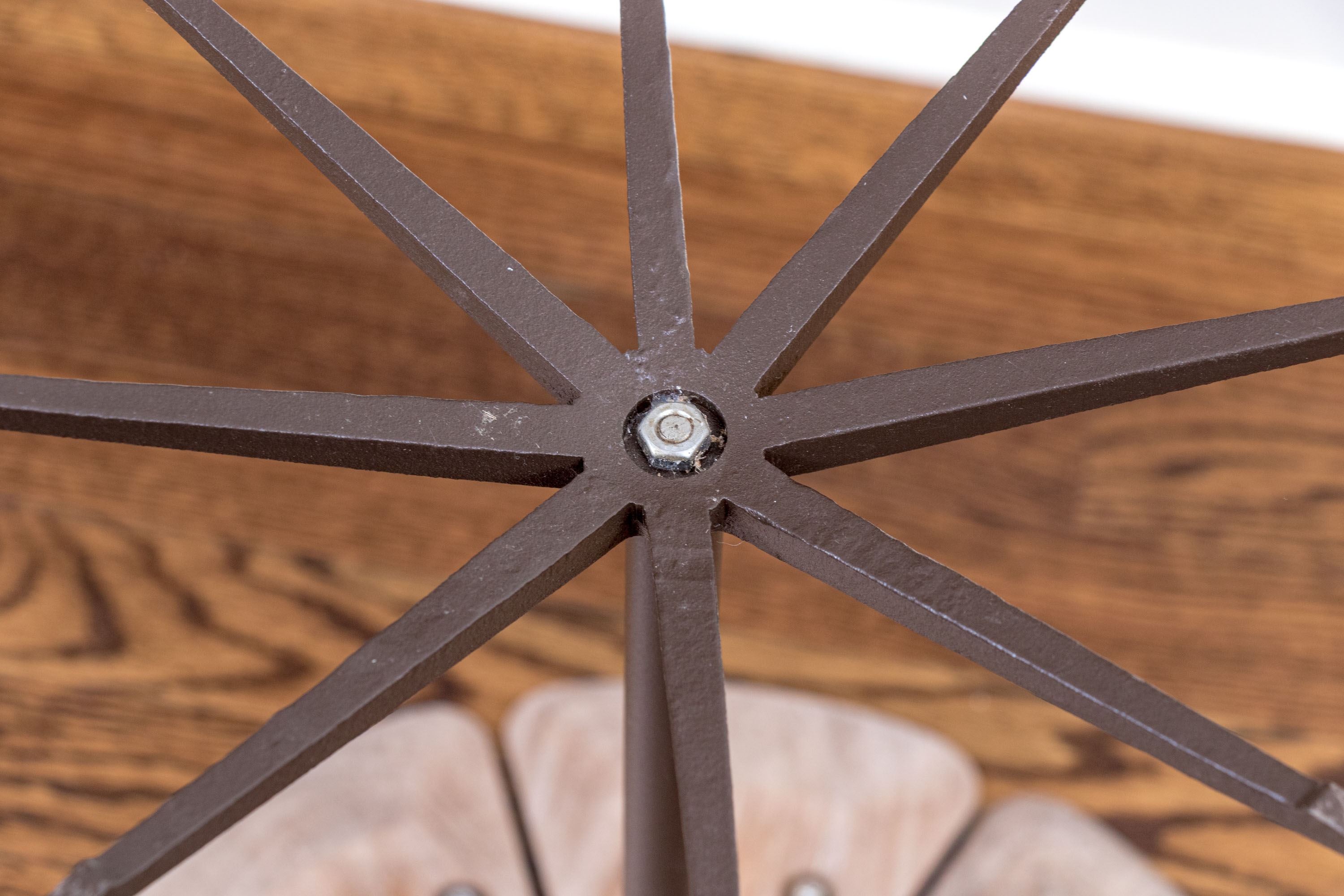 The Classic Mid Century design made by Knoll. With a sun bleached Teak sectioned top in Petal form surmounting an Iron pedestal with eight spokes and central post in a Brown finish.