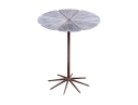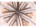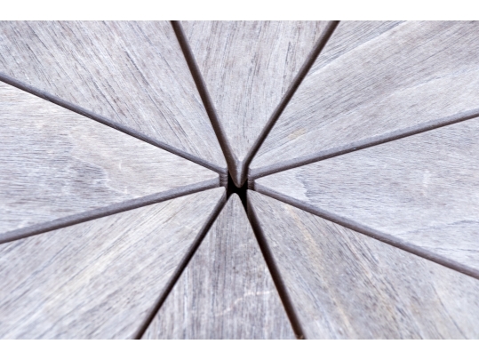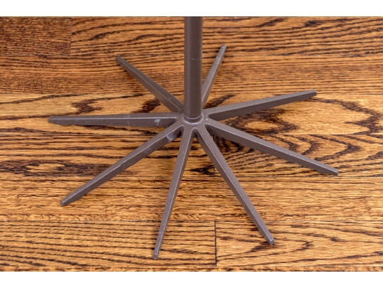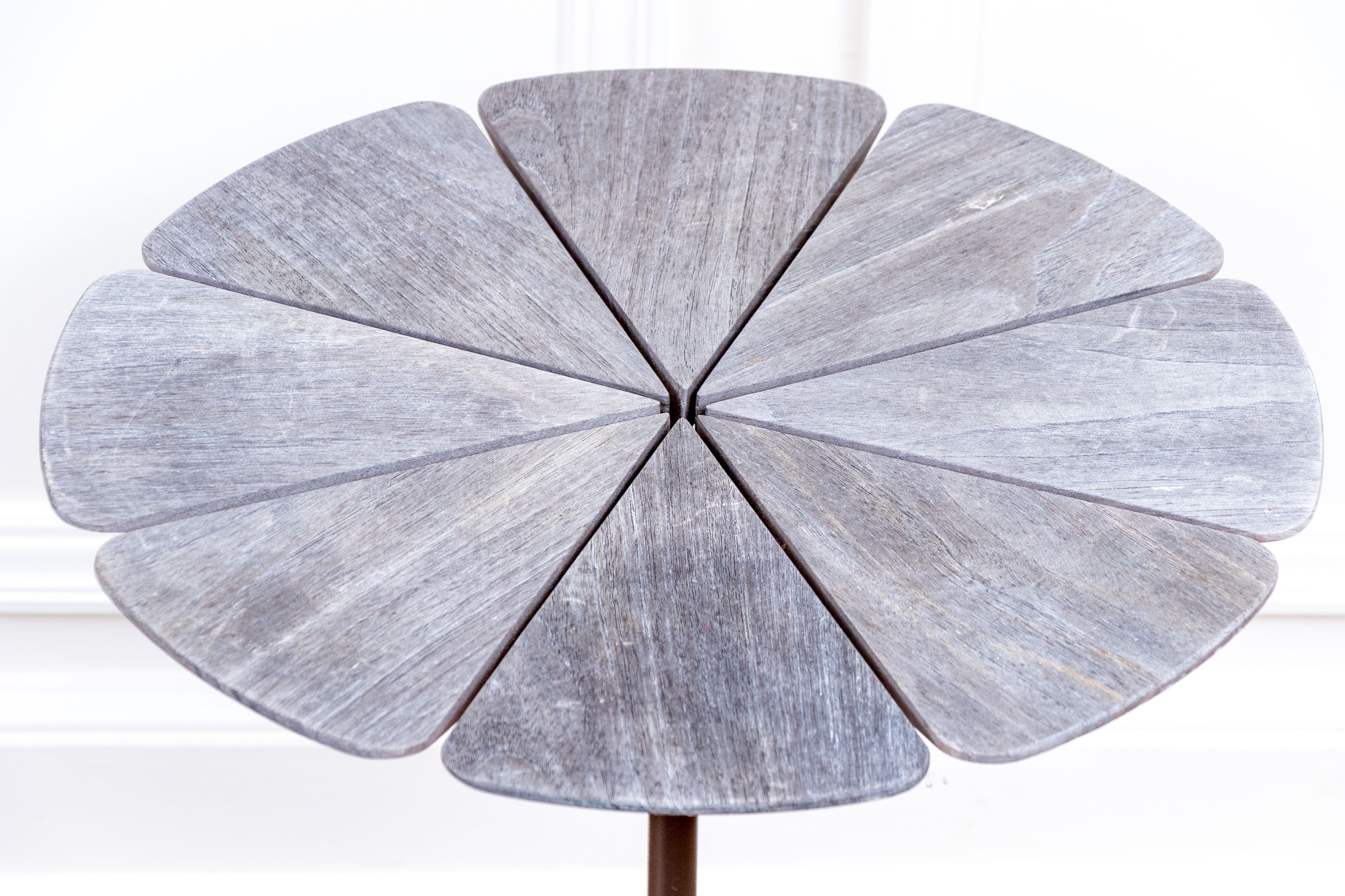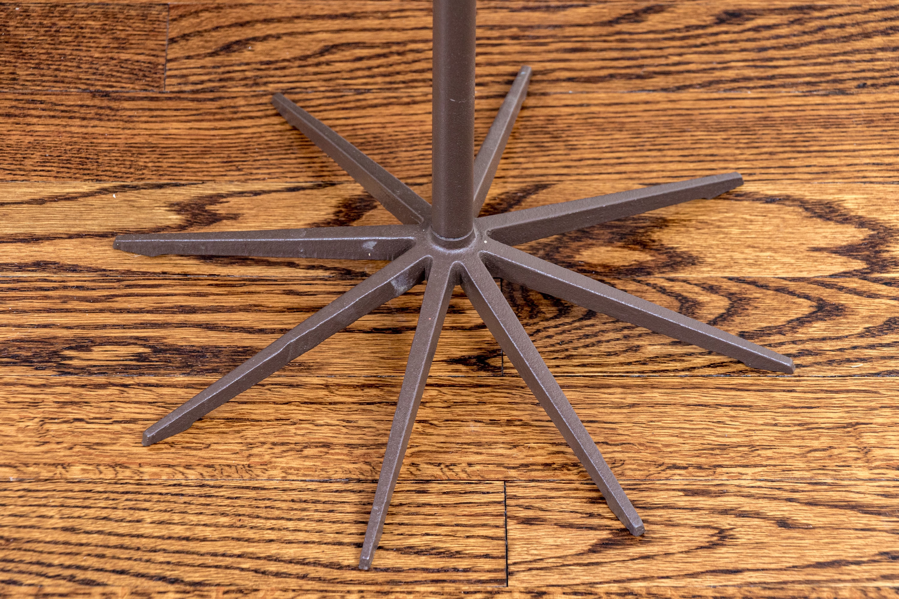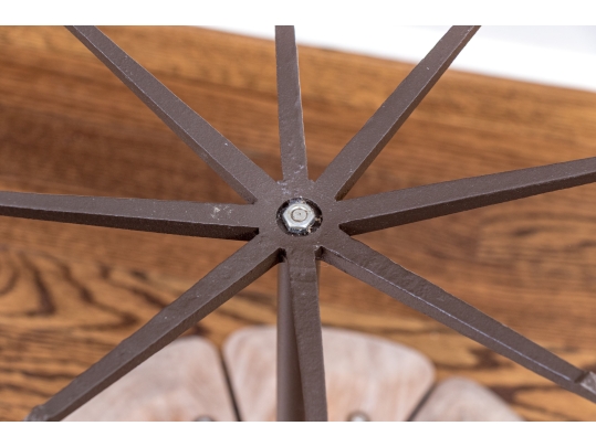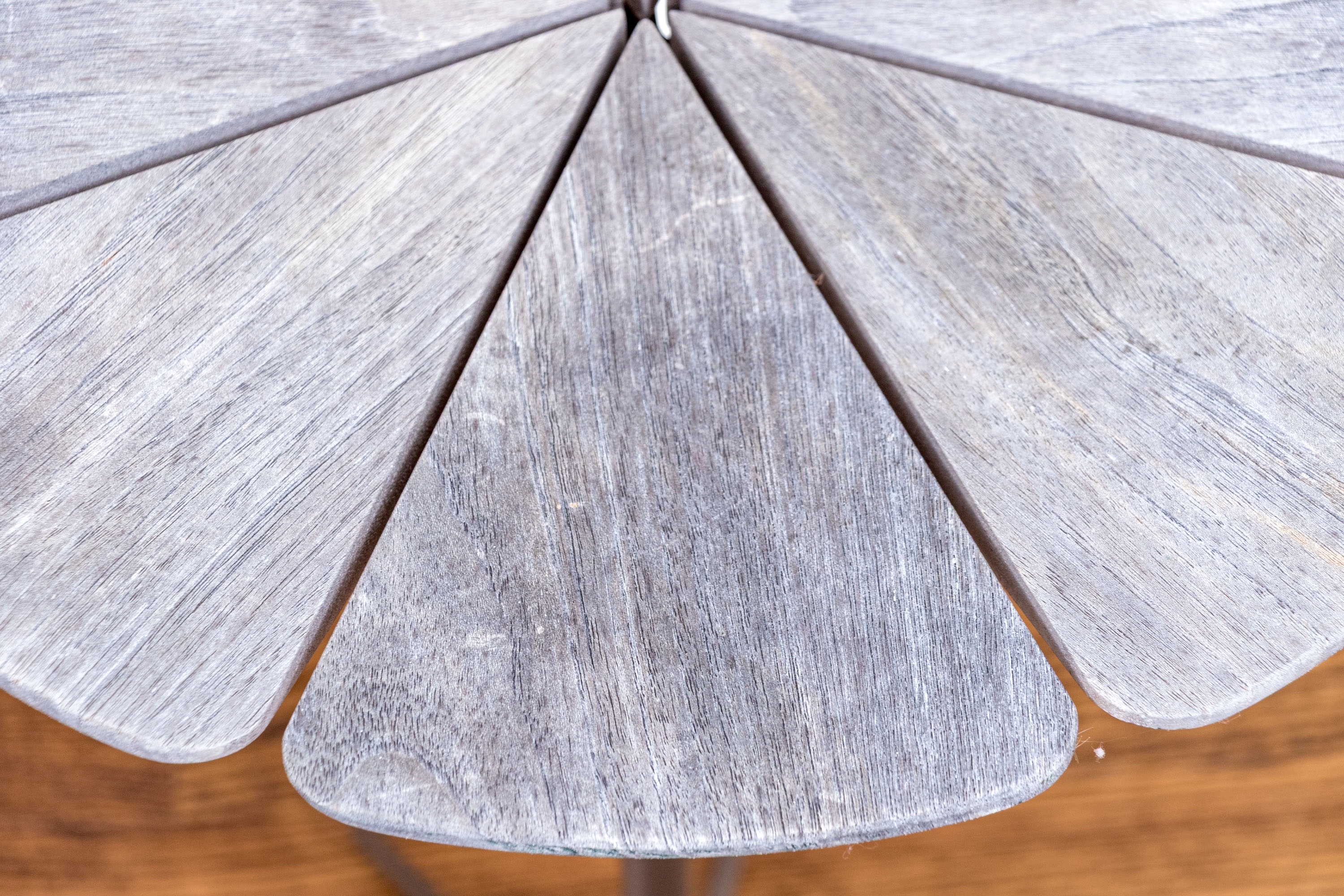 The Classic Mid Century design made by Knoll. With a sun bleached Teak sectioned top in Petal form surmounting an Iron pedestal with eight spokes and central post in a Brown finish.