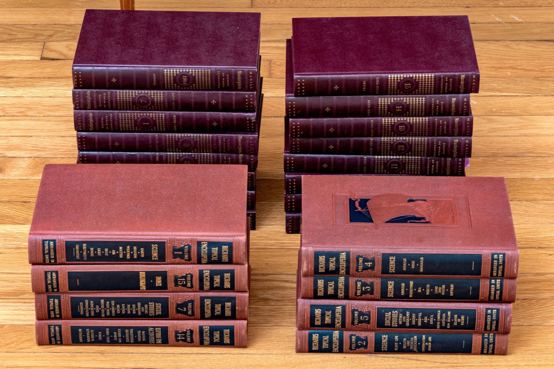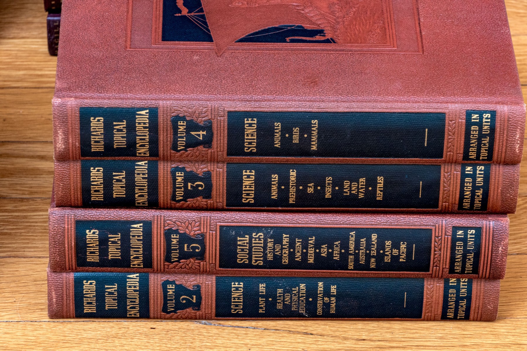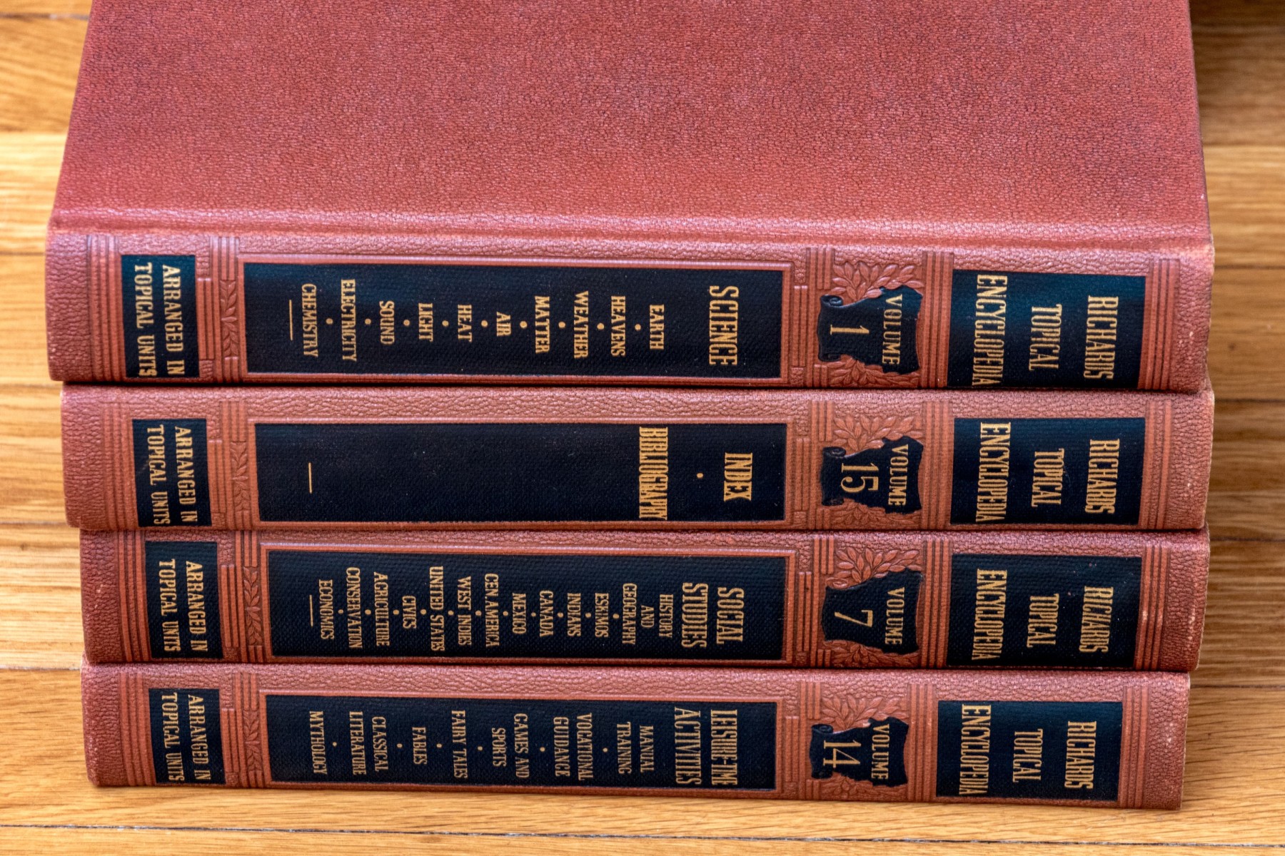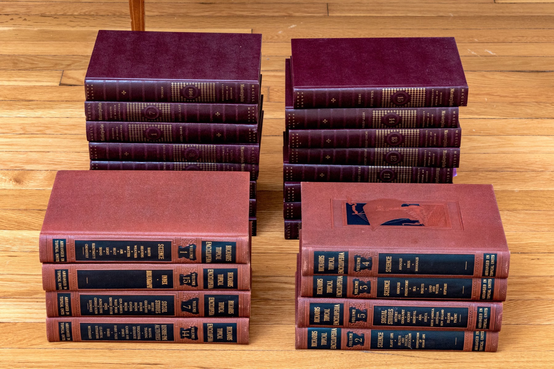 A wonderful collection of twenty-four leather bound books including "Richards Topical Encyclopedia" and "Digests of World Literature."