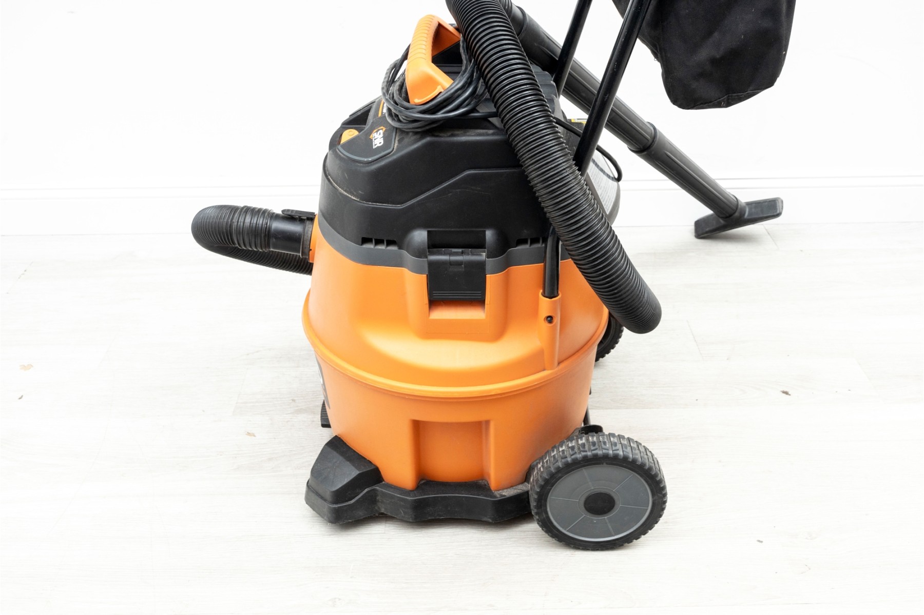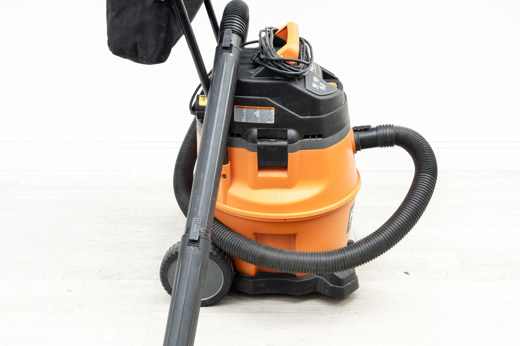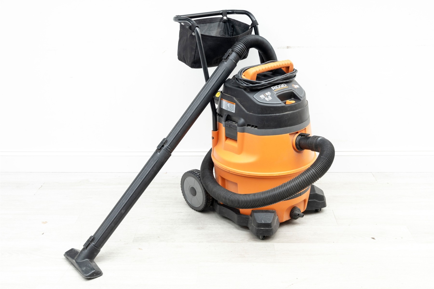 A utilitarian Rigid 16 gallon wet/dry vacuum in orange and black, on wheels for easy transportation. With a handful of nozzle attachments.