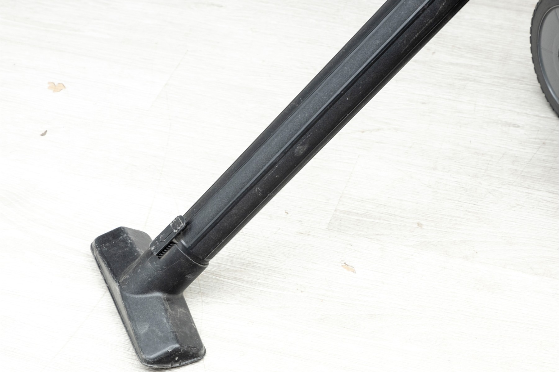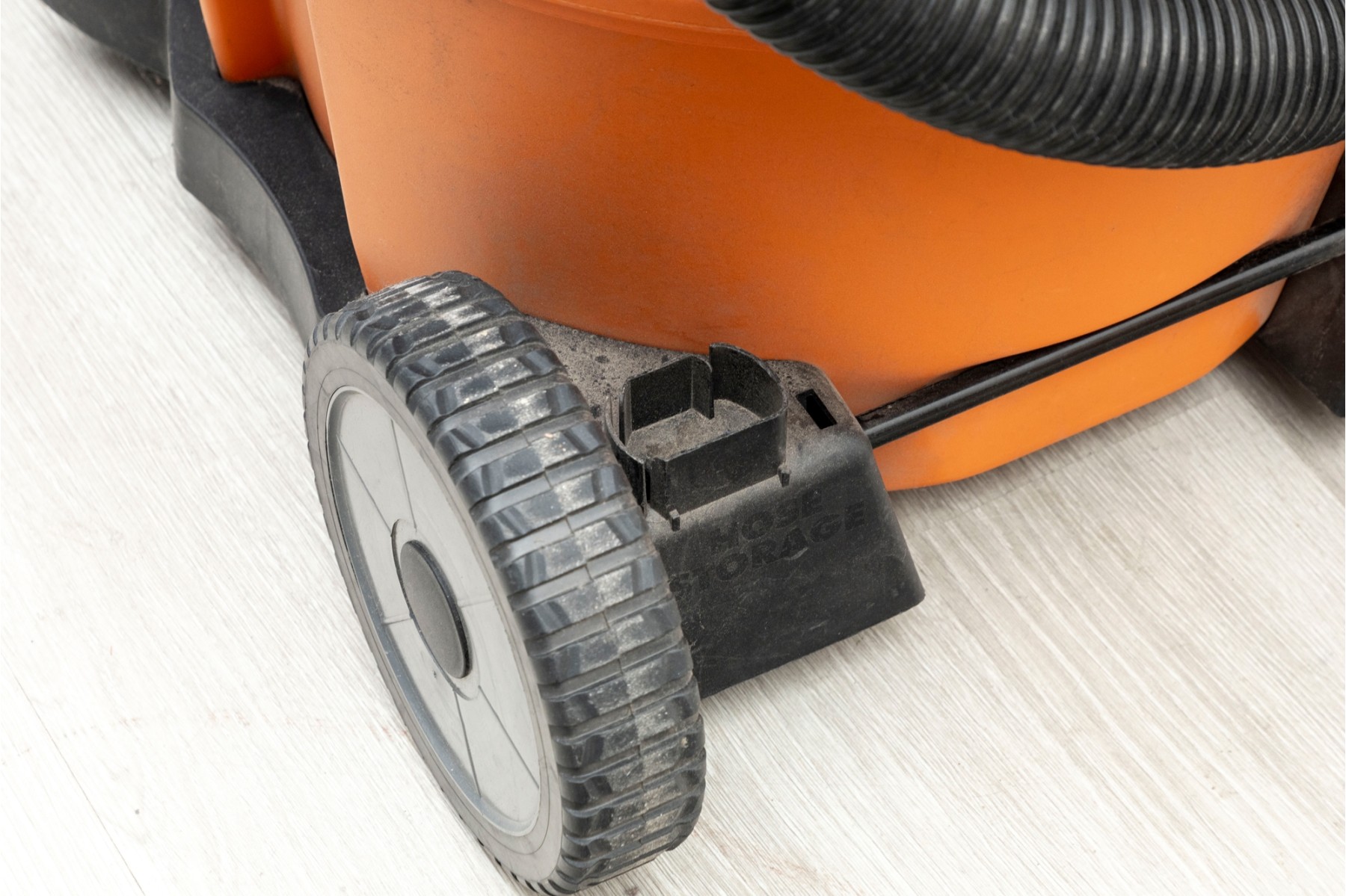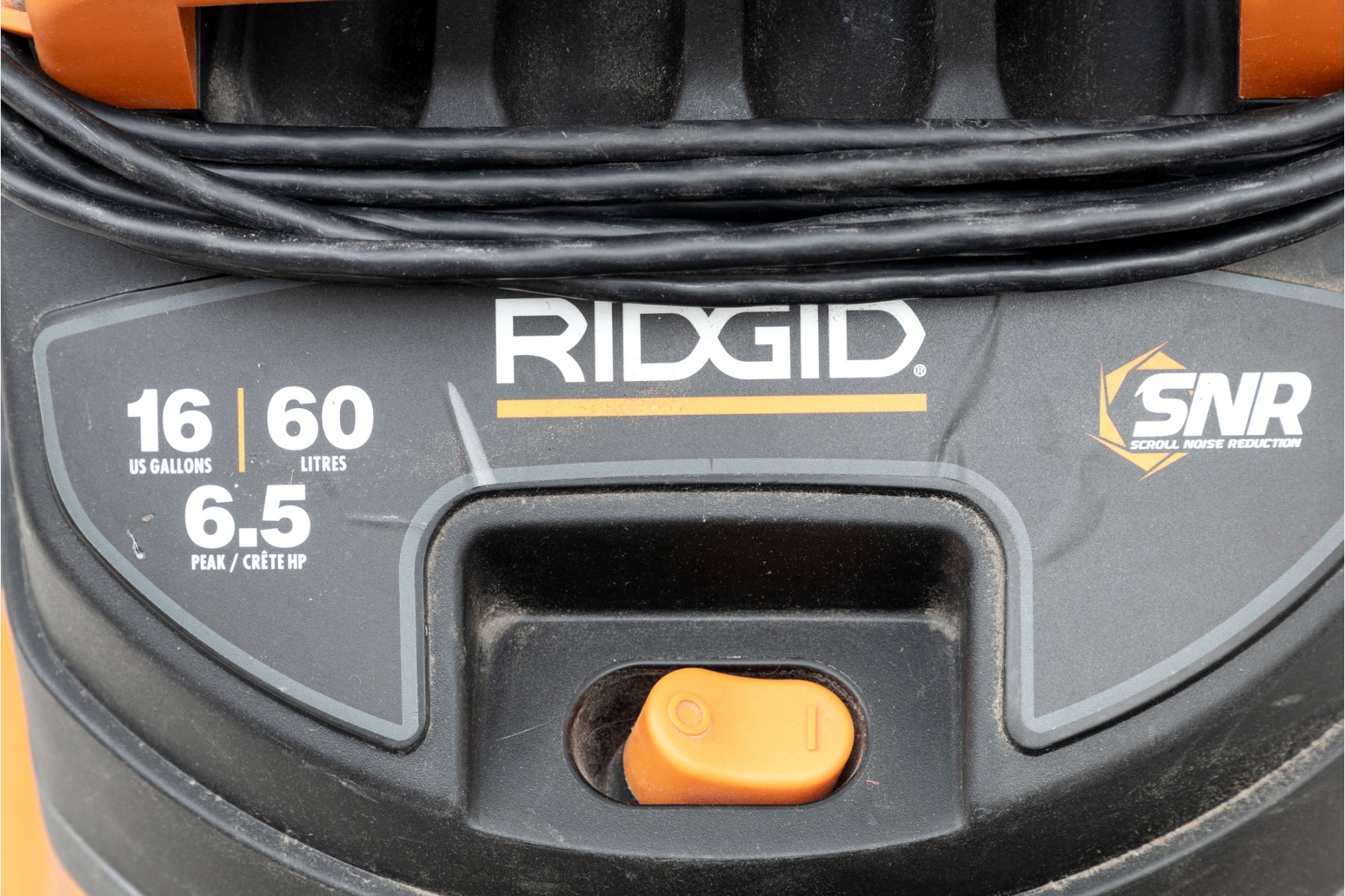 A utilitarian Rigid 16 gallon wet/dry vacuum in orange and black, on wheels for easy transportation. With a handful of nozzle attachments.