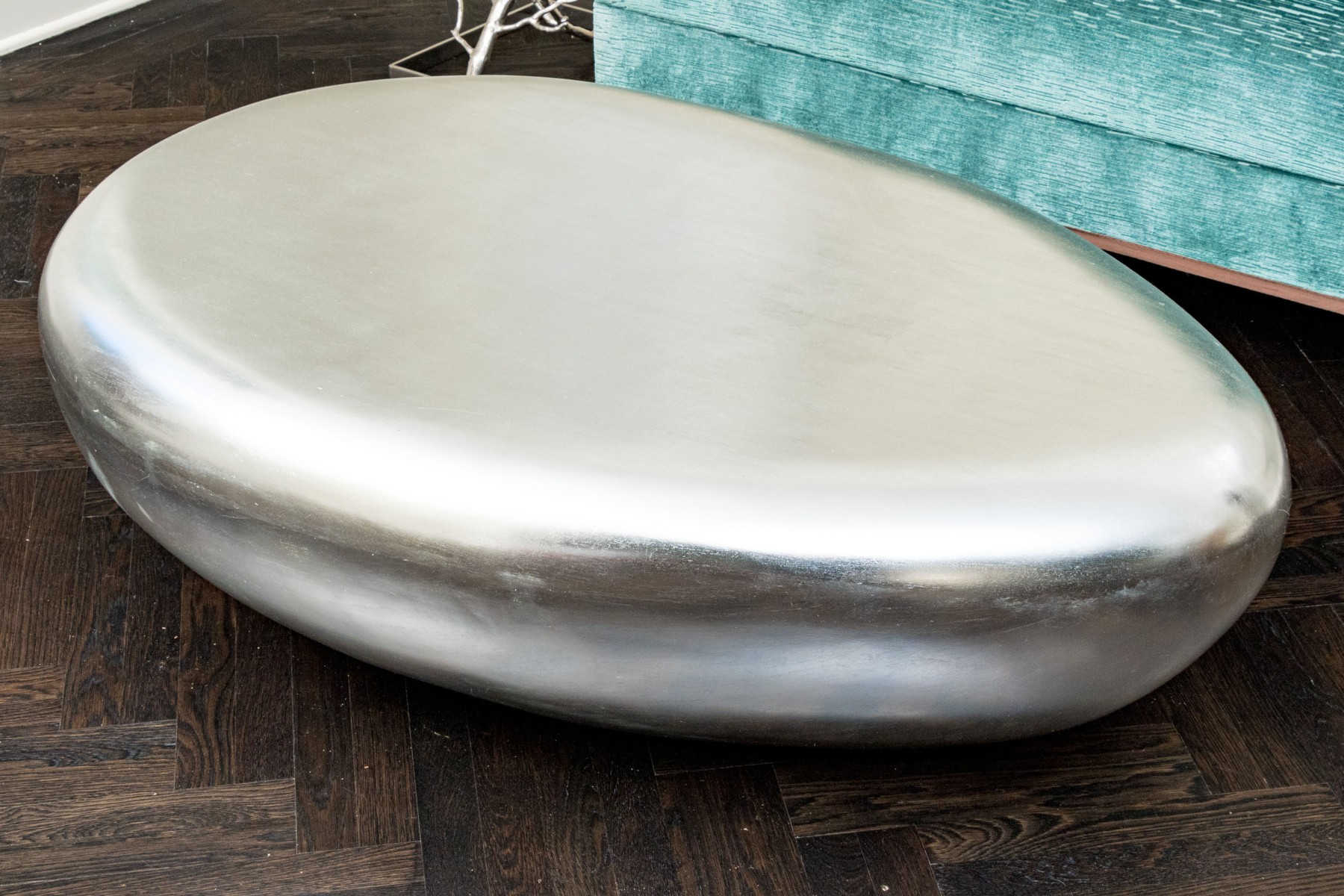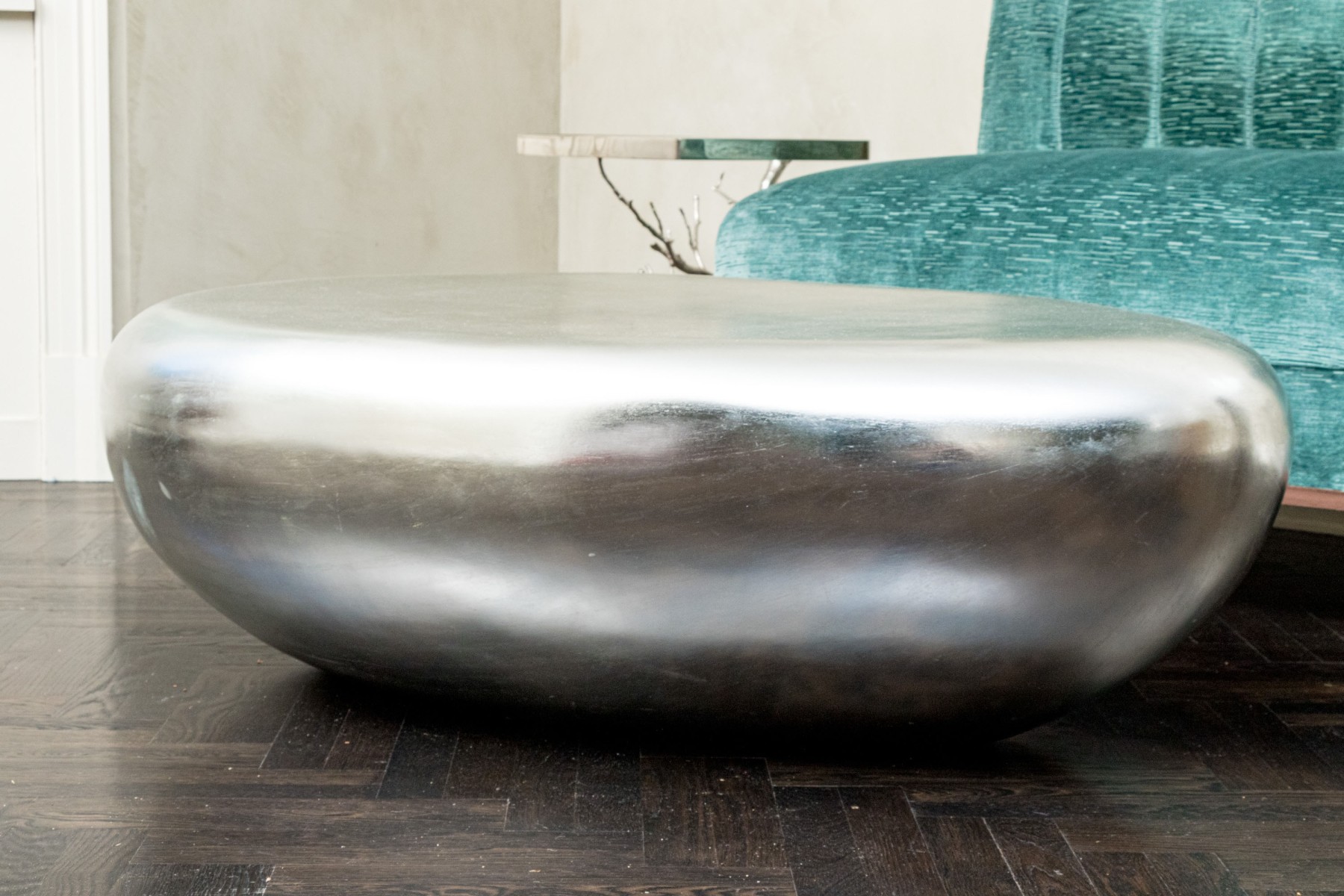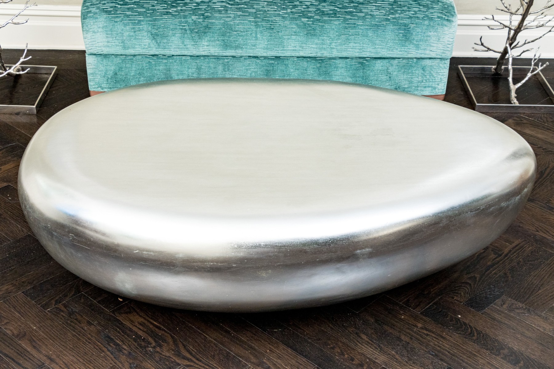 The natural form table constructed from composite material boasts smooth lines and marvelous silver leaf finish give this coffee table its fabulous aesthetic.