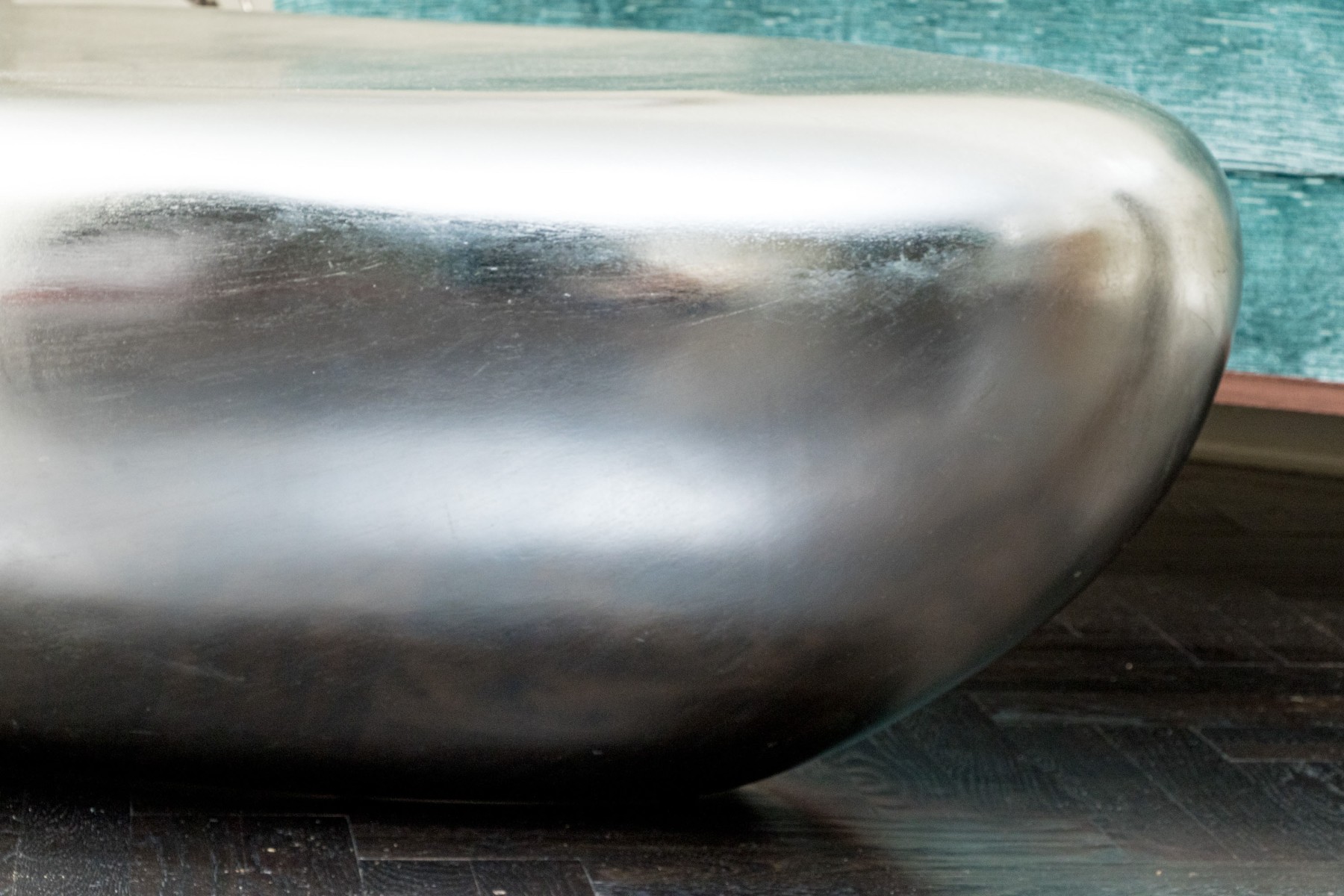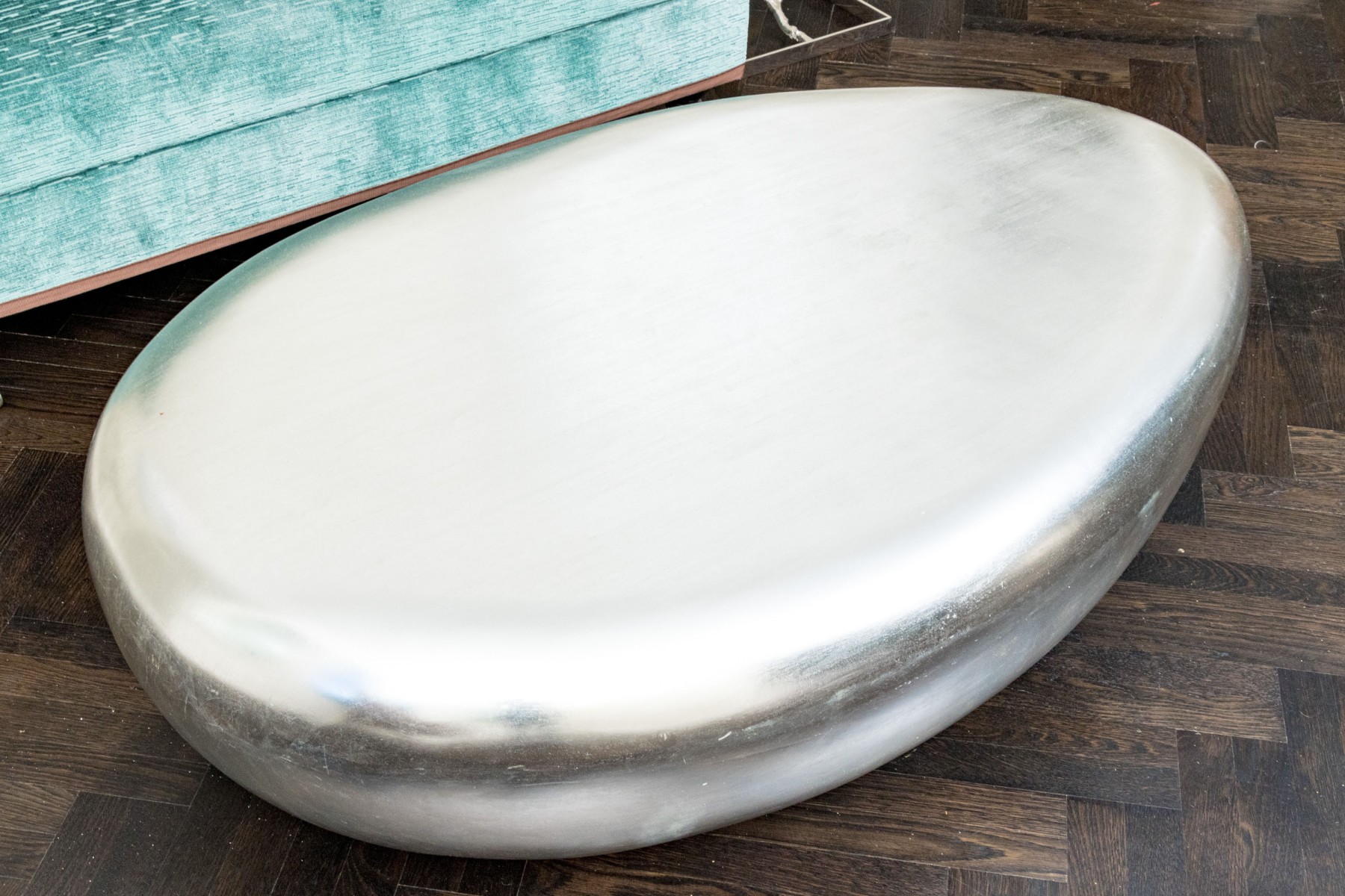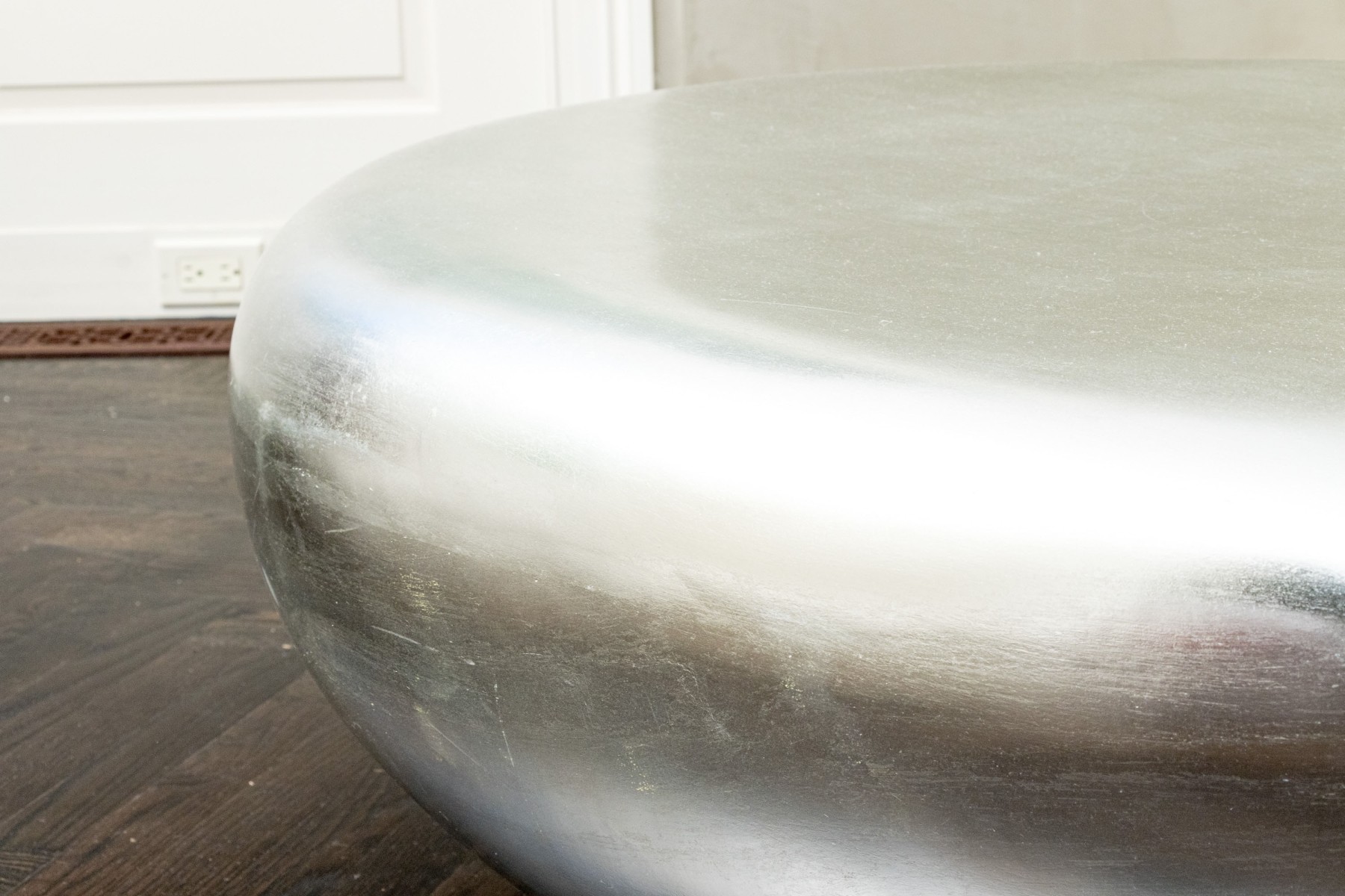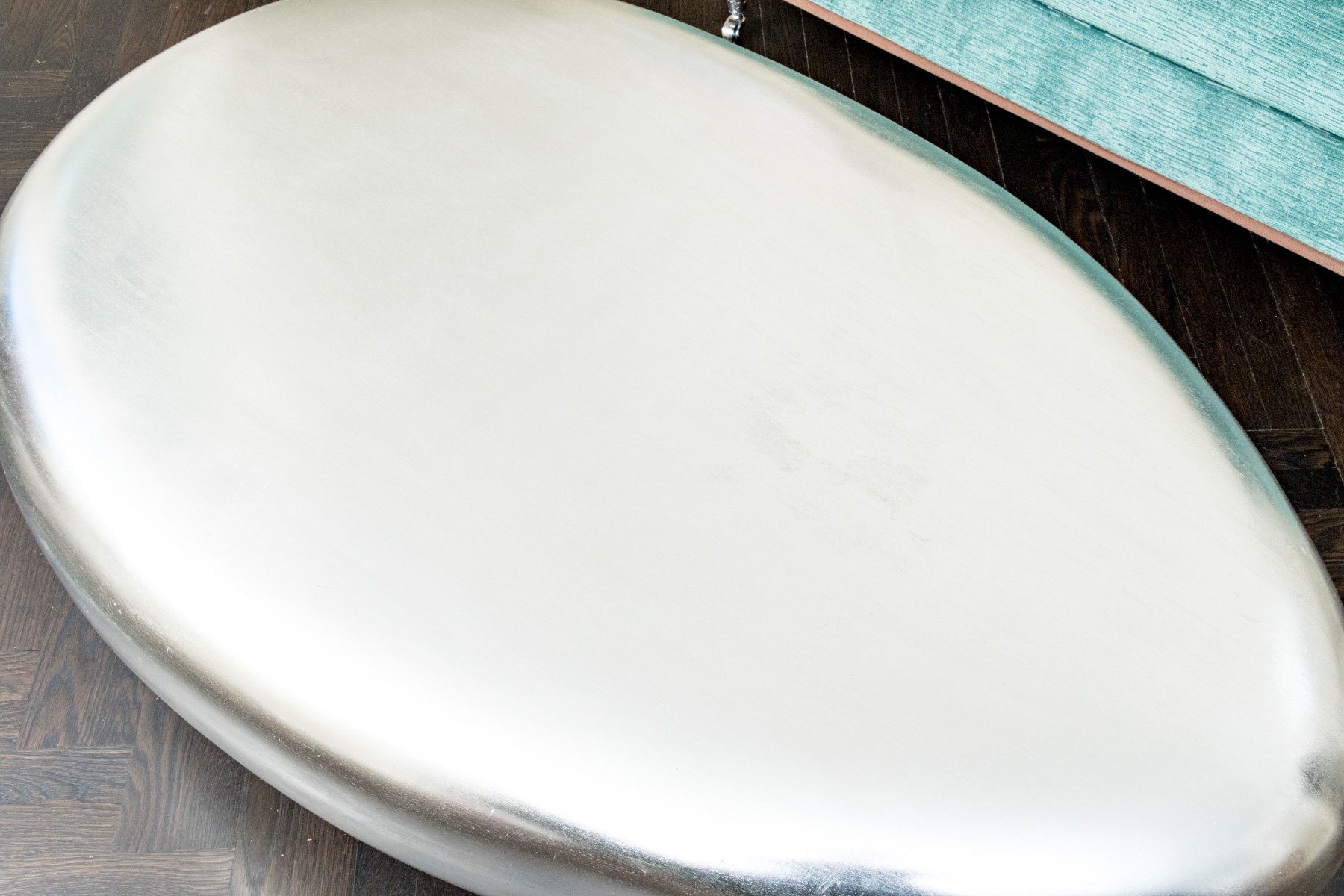 The natural form table constructed from composite material boasts smooth lines and marvelous silver leaf finish give this coffee table its fabulous aesthetic.