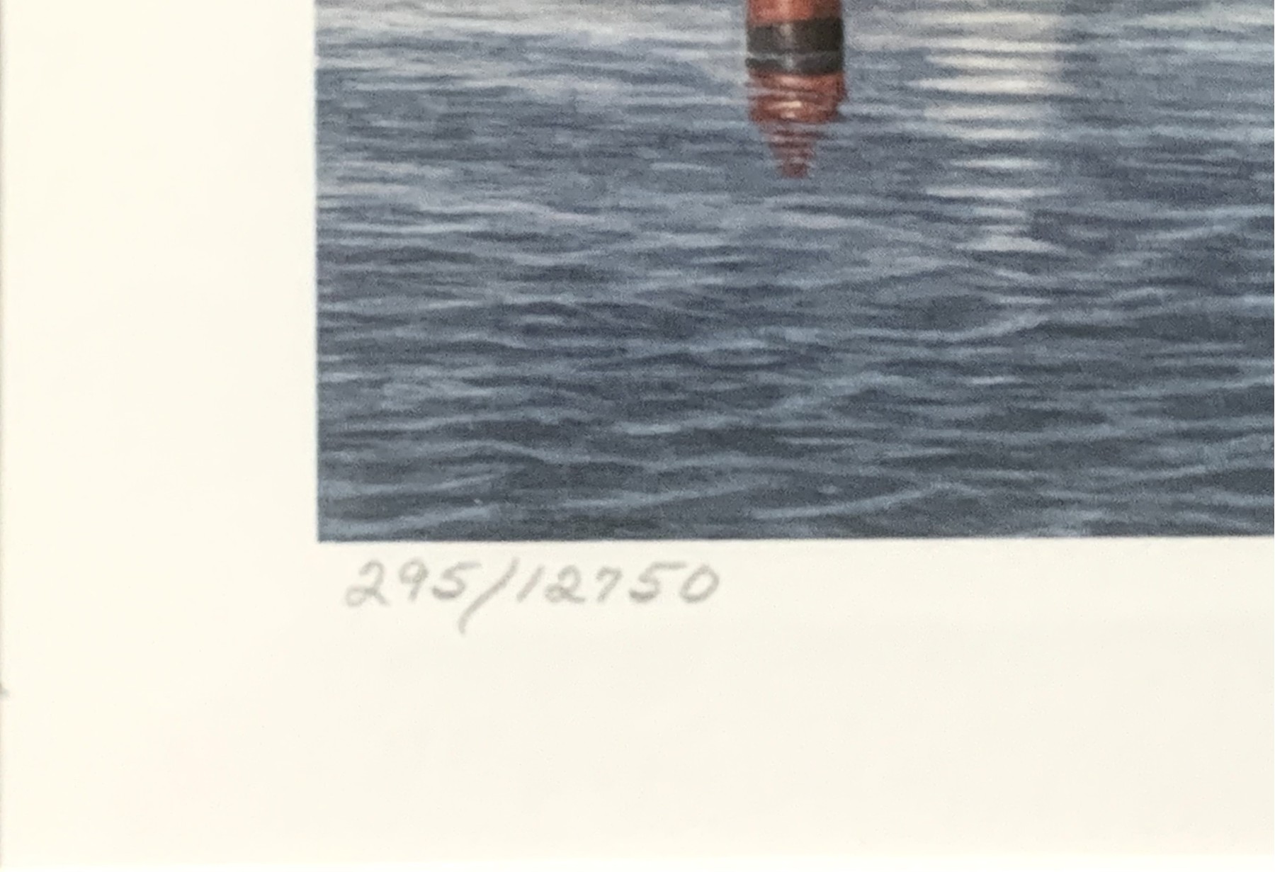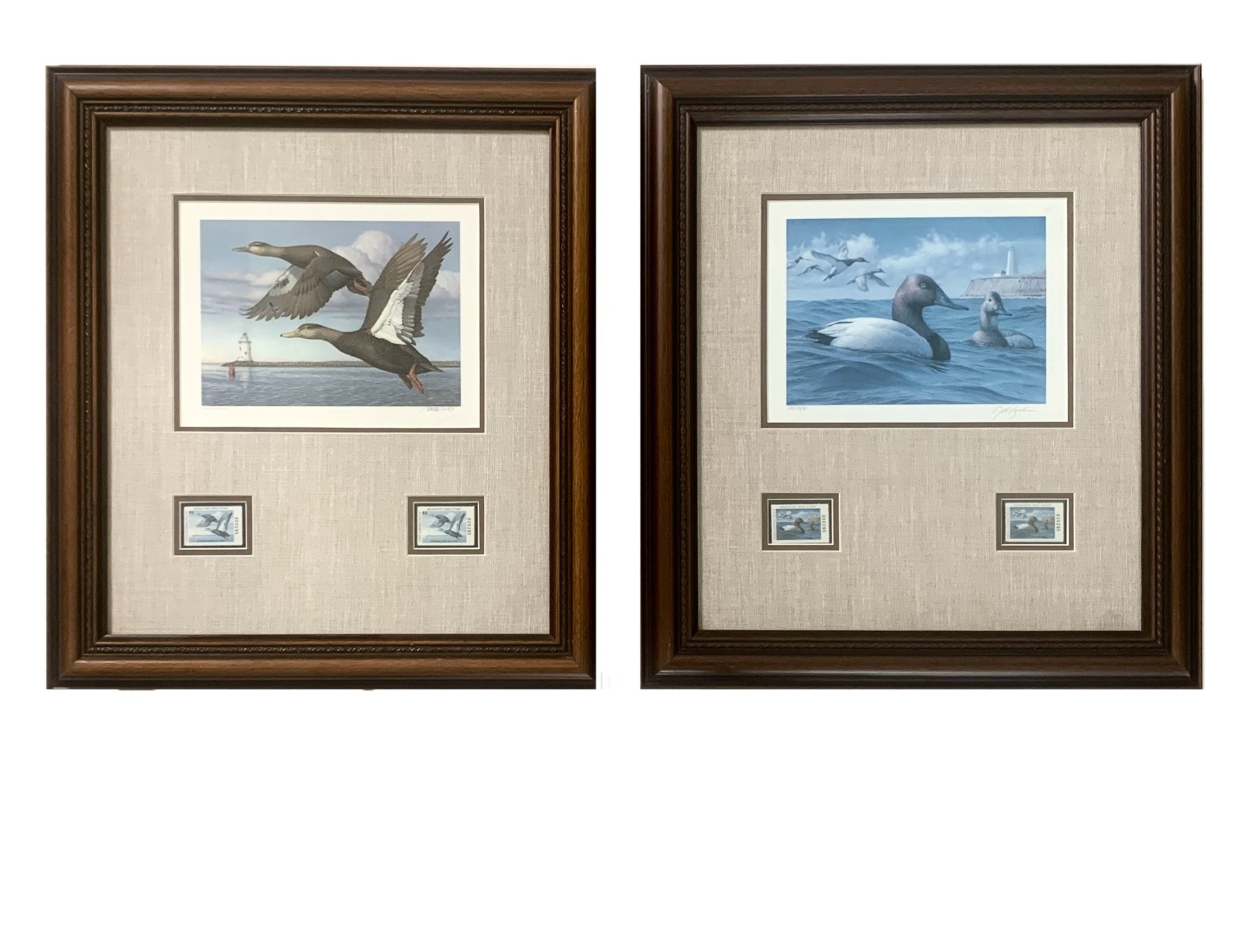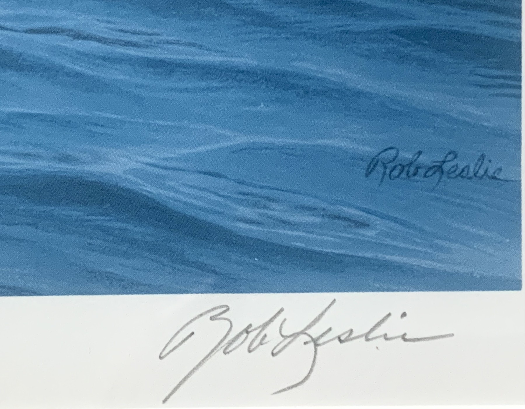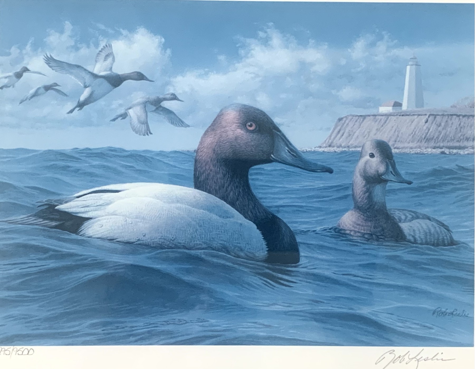 Two Rob Leslie signed and numbered prints depicting canvasback and black ducks and lighthouses.
