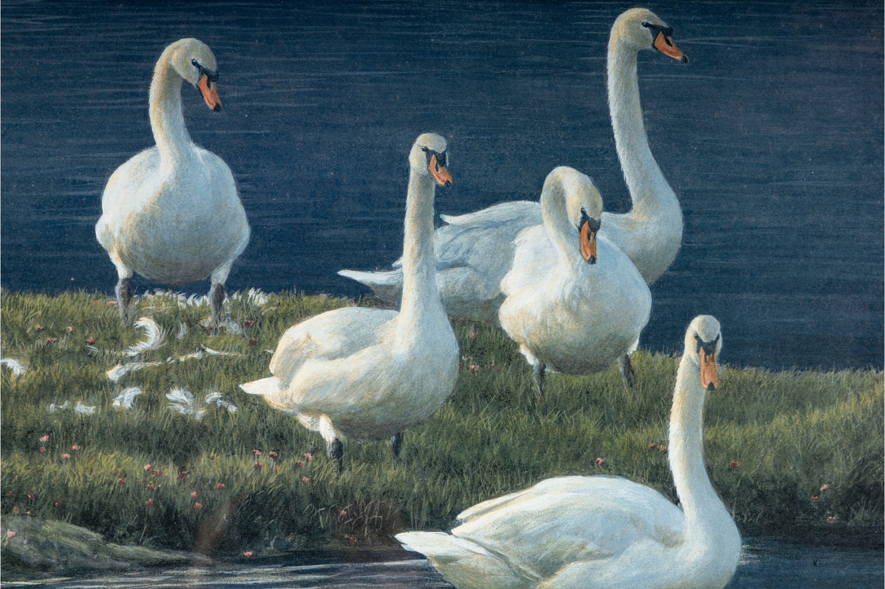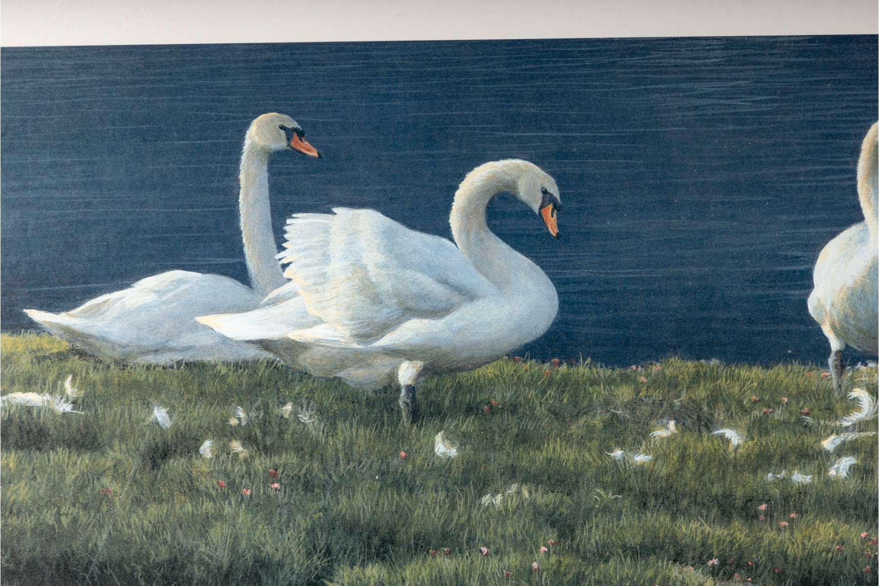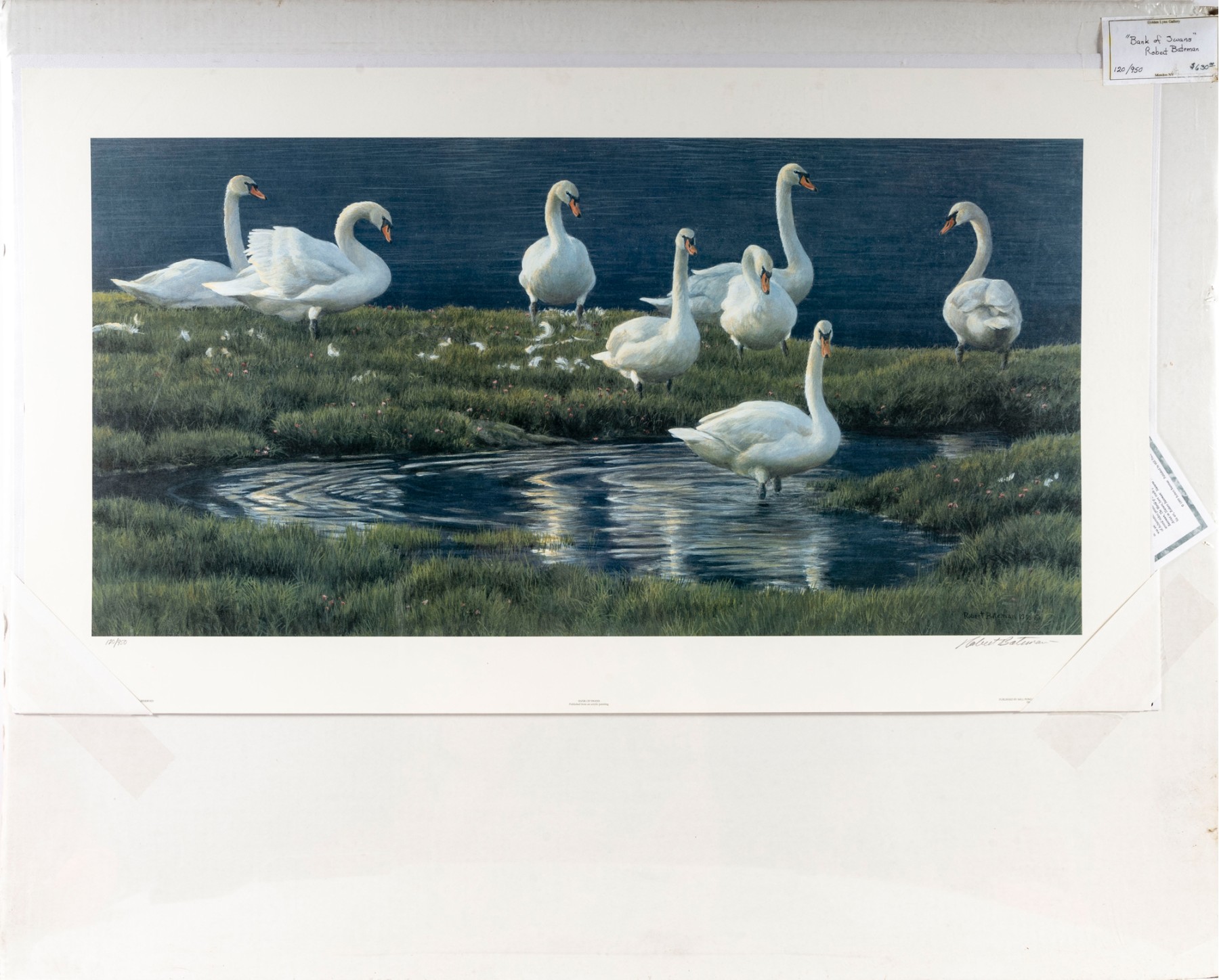 Robert Bateman (Canadian, b. 1930) "Bank of Swans" lithograph depicting a levy of swans gathering around a small, rippling pool of water surrounded by lush green grass, rendered in beautiful detail and vibrant color. Pencil signed lower right, numbered 120/950. Size: 37x21"