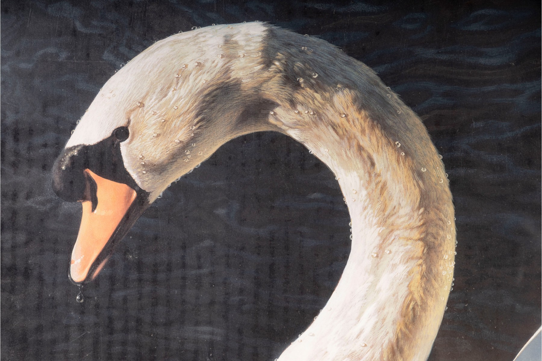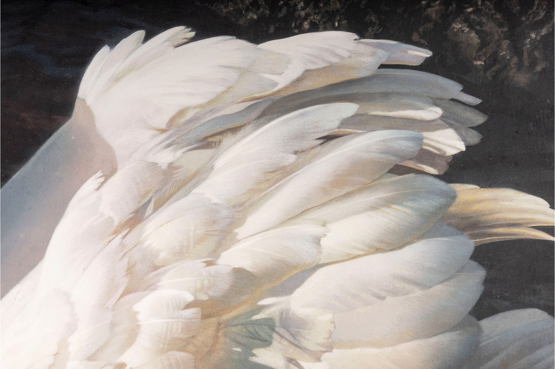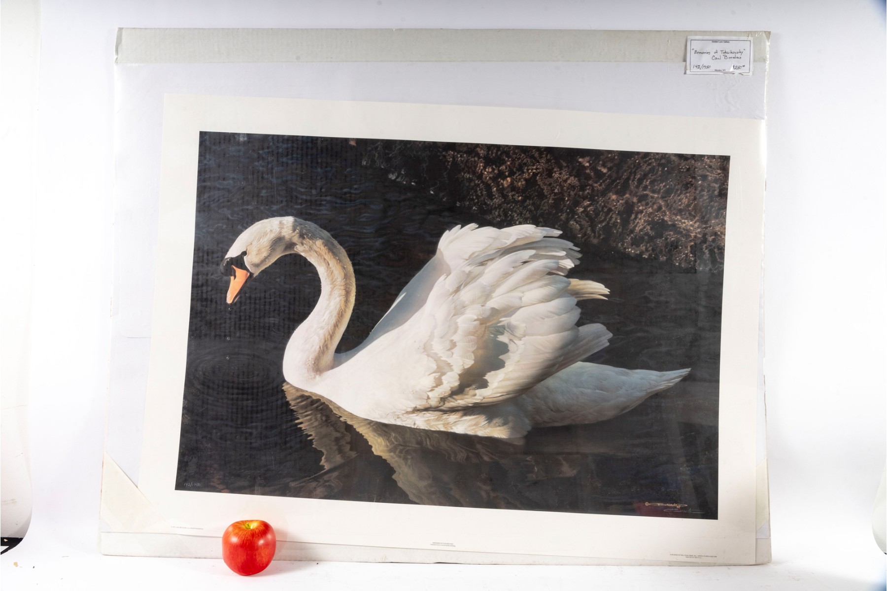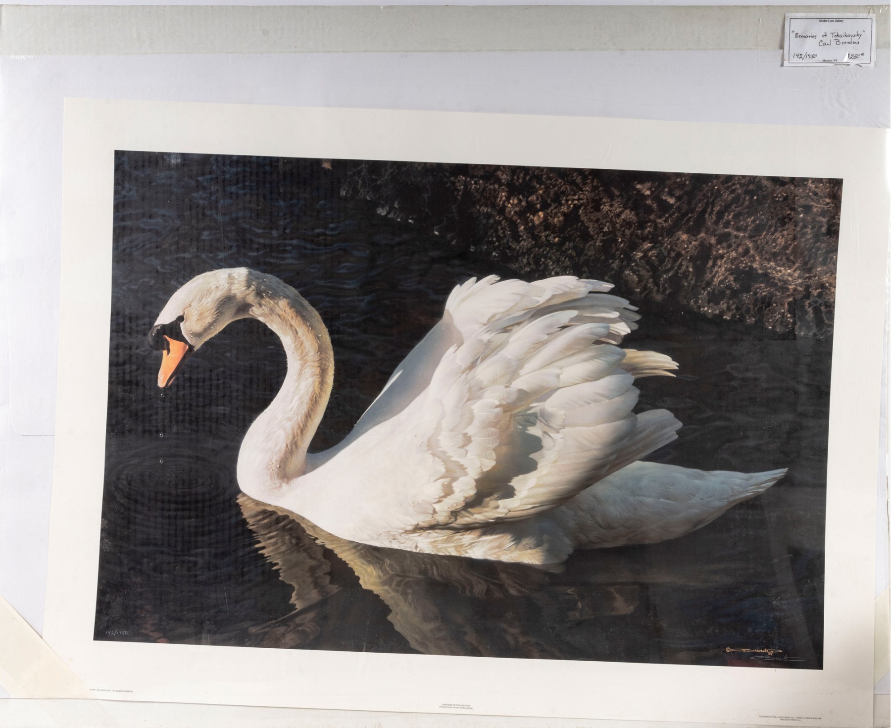Carl Brenders (Belgian, b. 1937) "Memories of Tchaikovsky" lithograph depicting a majestic, lone swan swimming on a calm, dark pool of water, providing excellent contrast to its detailed, bright white plumage. Pencil signed lower right, numbered 142/1750. Size: 37x26"