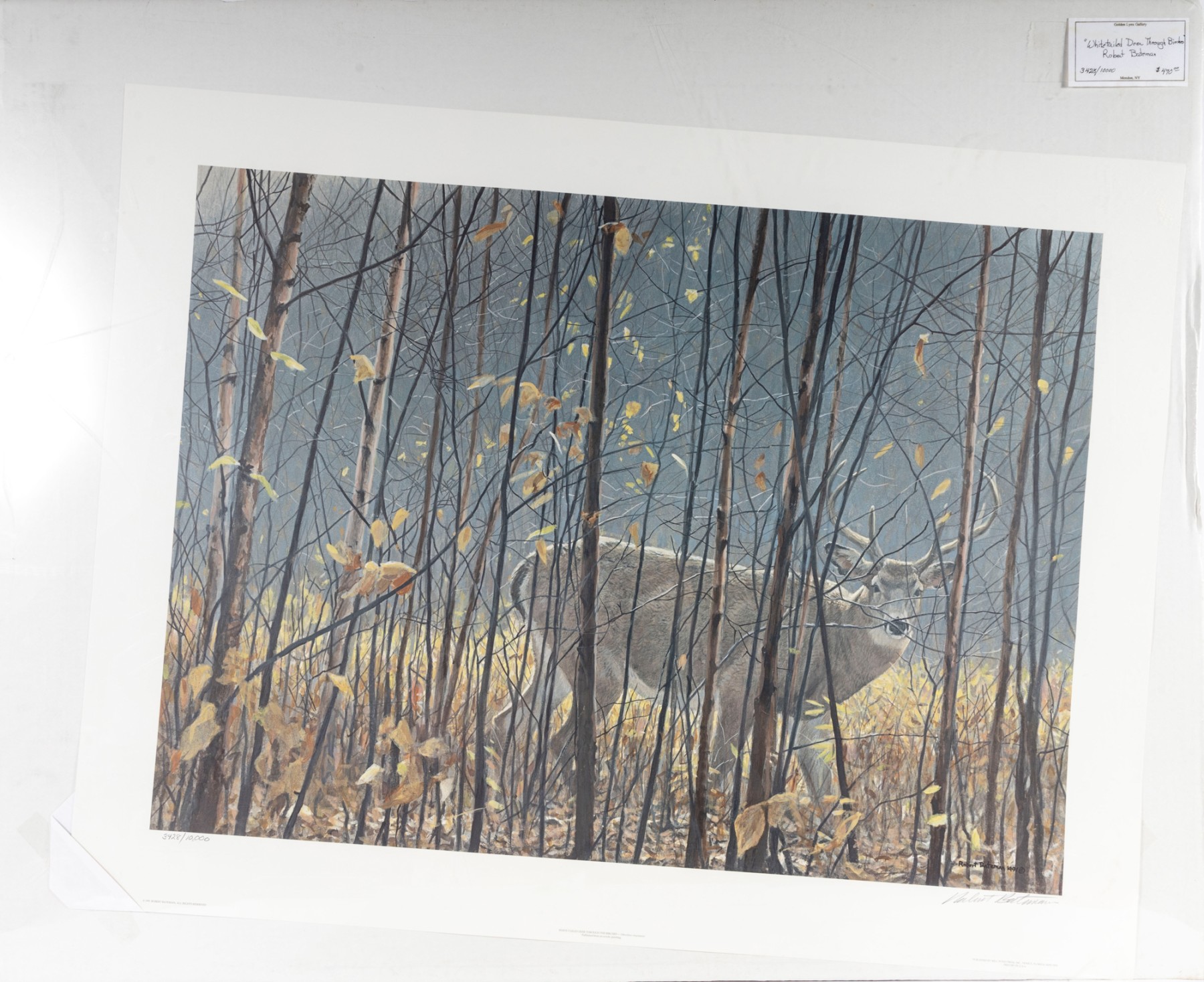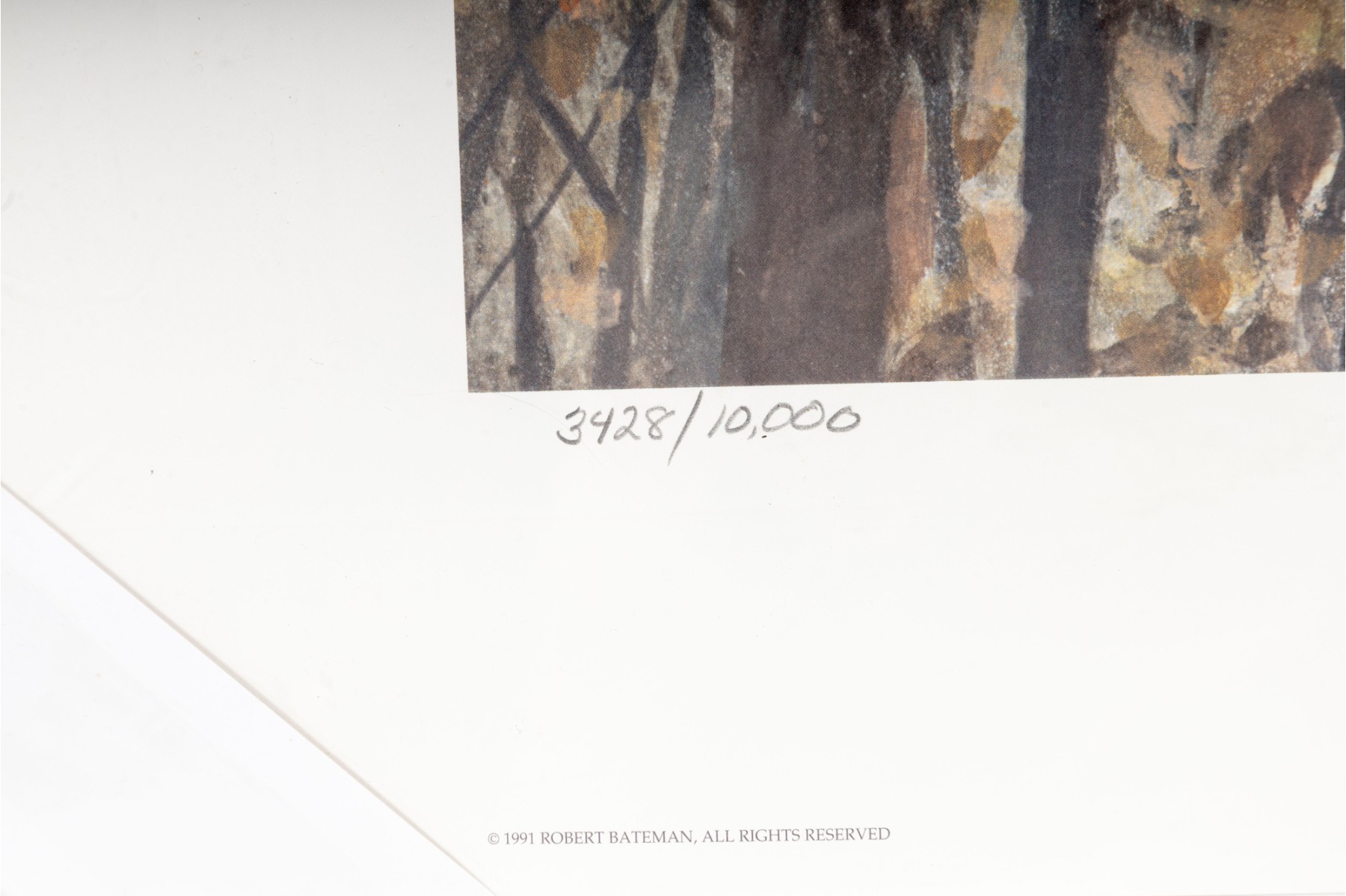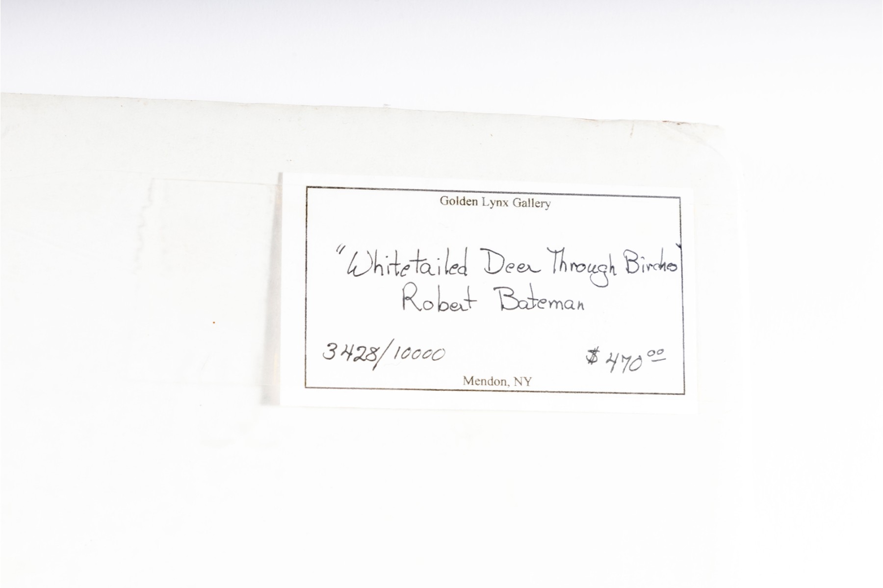 Robert Bateman (Canadian, b. 1930) "Whitetailed Deer Through Birches" lithograph depicting a small herd of deer walking through a wintery agricultural field under a pale sky with striated clouds. Pencil signed lower right, numbered 3428/10000. Size: 35x26"