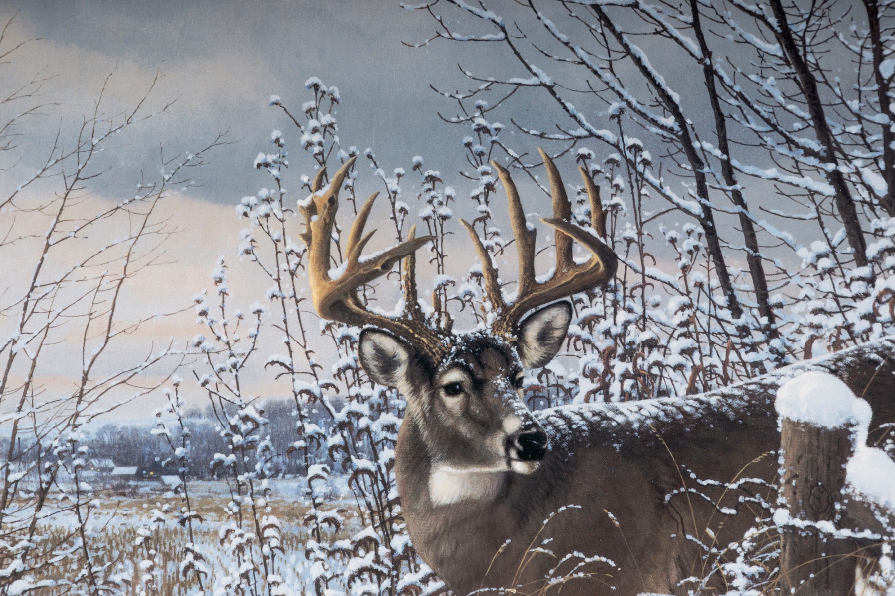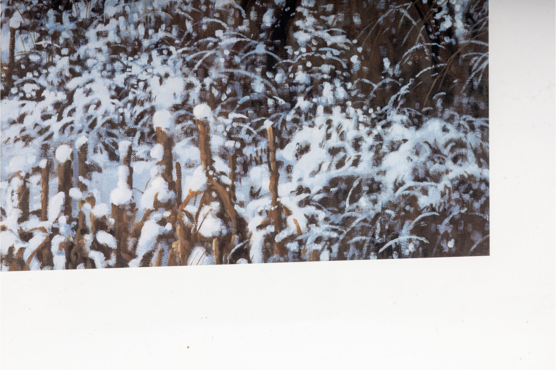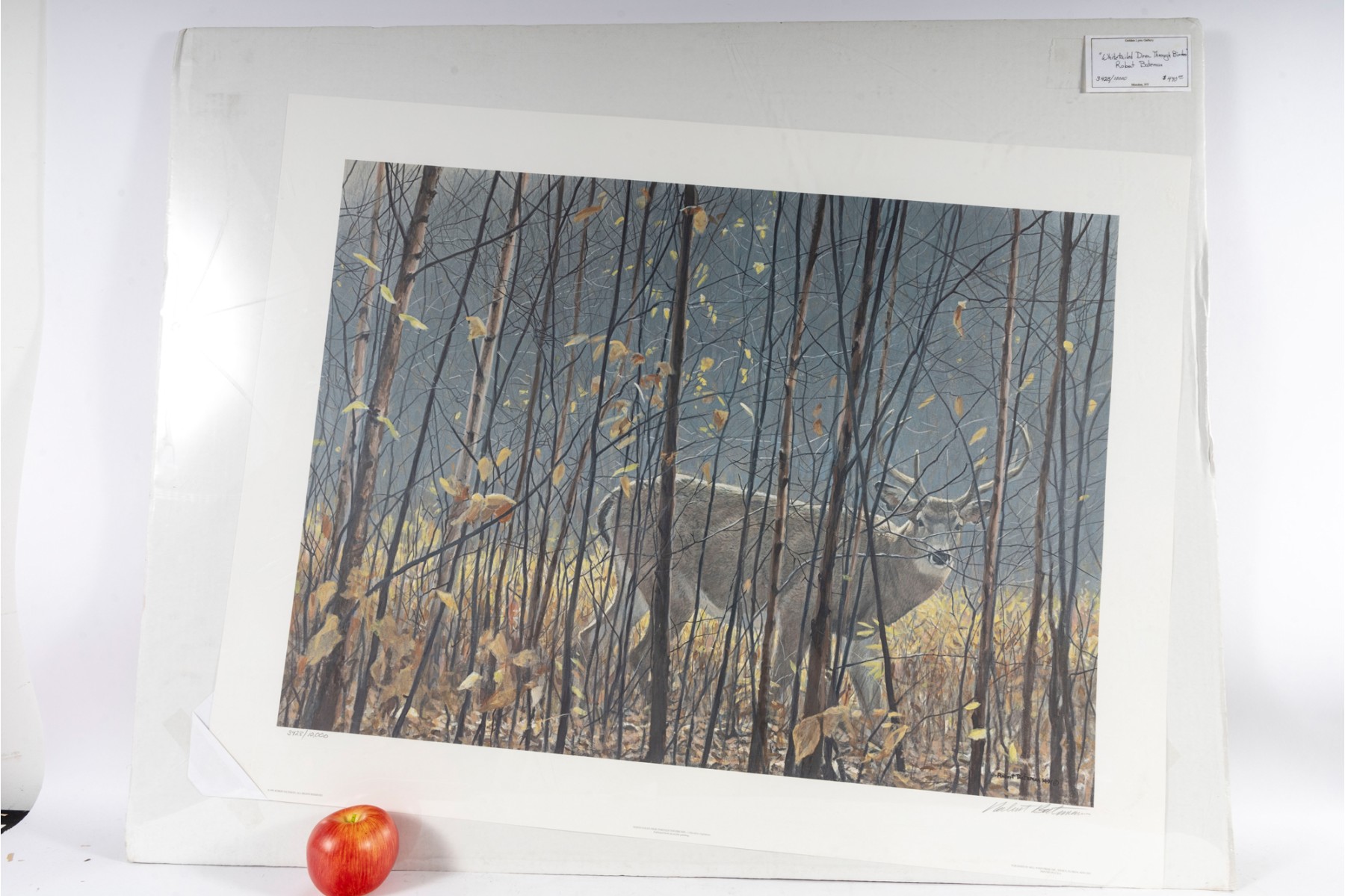 Robert Bateman (Canadian, b. 1930) "Whitetailed Deer Through Birches" lithograph depicting a small herd of deer walking through a wintery agricultural field under a pale sky with striated clouds. Pencil signed lower right, numbered 3428/10000. Size: 35x26"