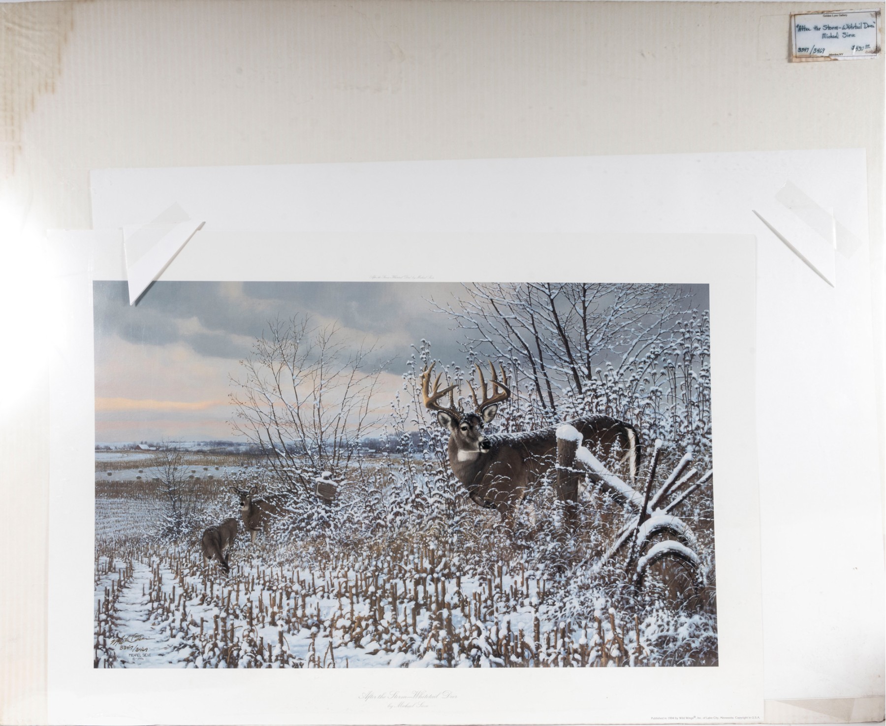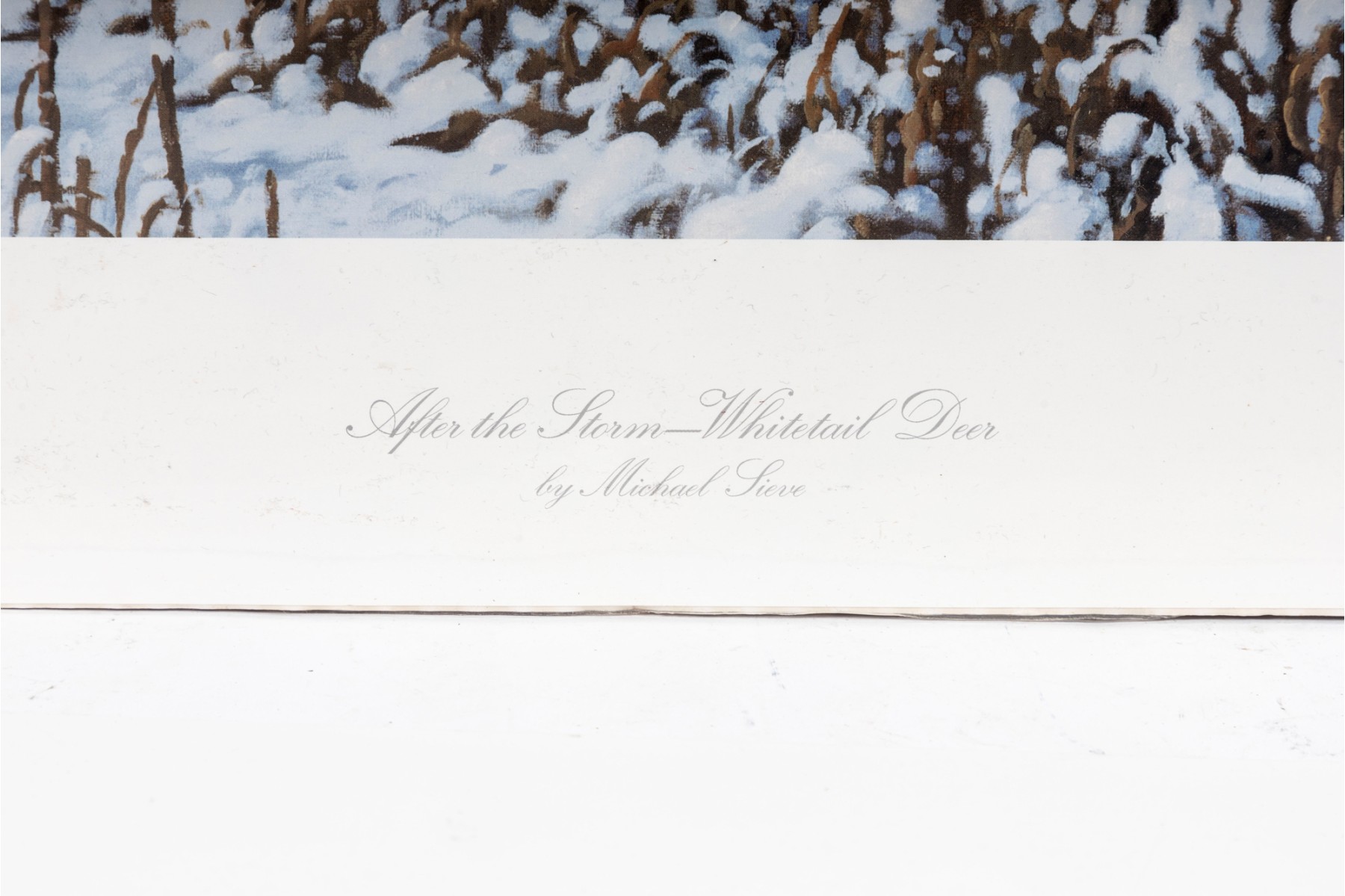 Michael Sieve (American, b. 1951) "After the Storm-Whitetail Deer" lithograph depicting a single buck peeking through bare autumnal trees against a background of golden foliage under a thin fog. Ink signed lower left, numbered 3347/3469. Size: 32x21"