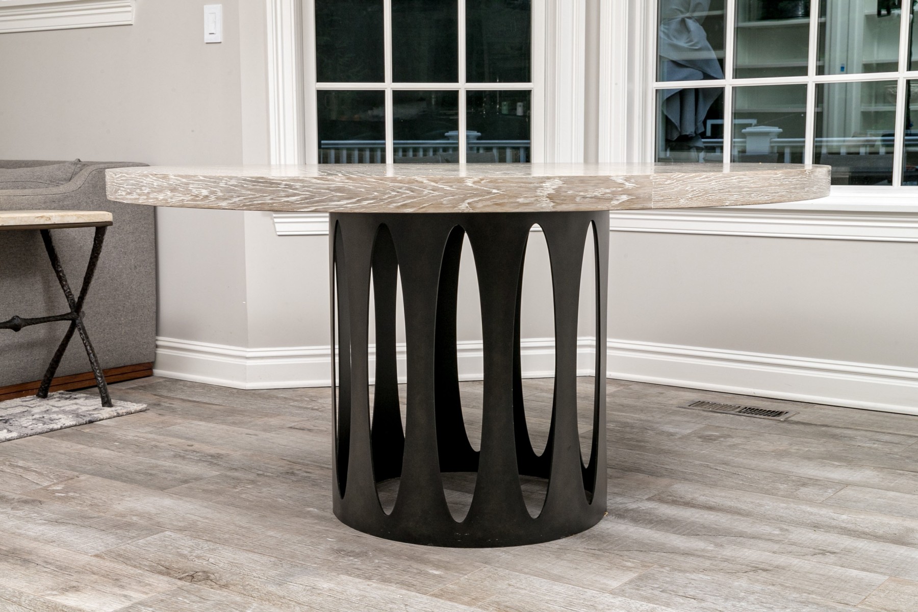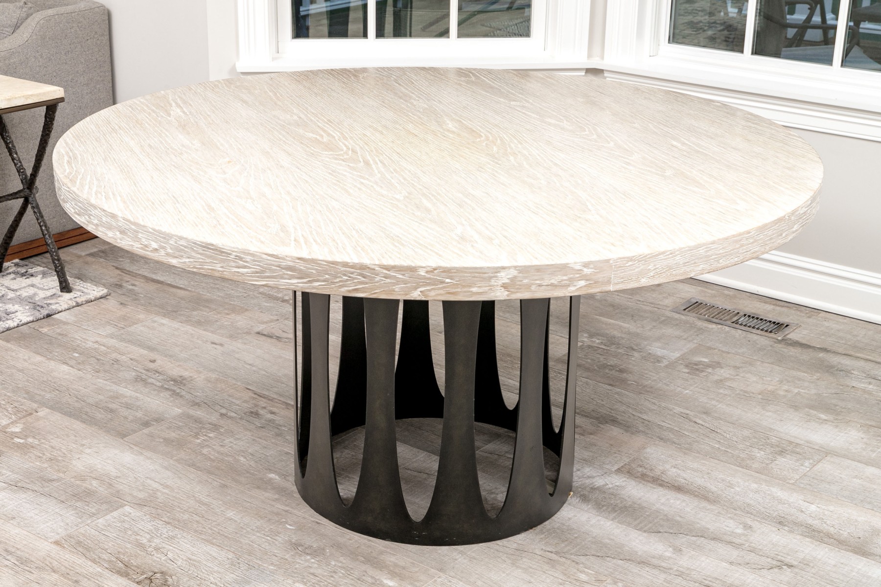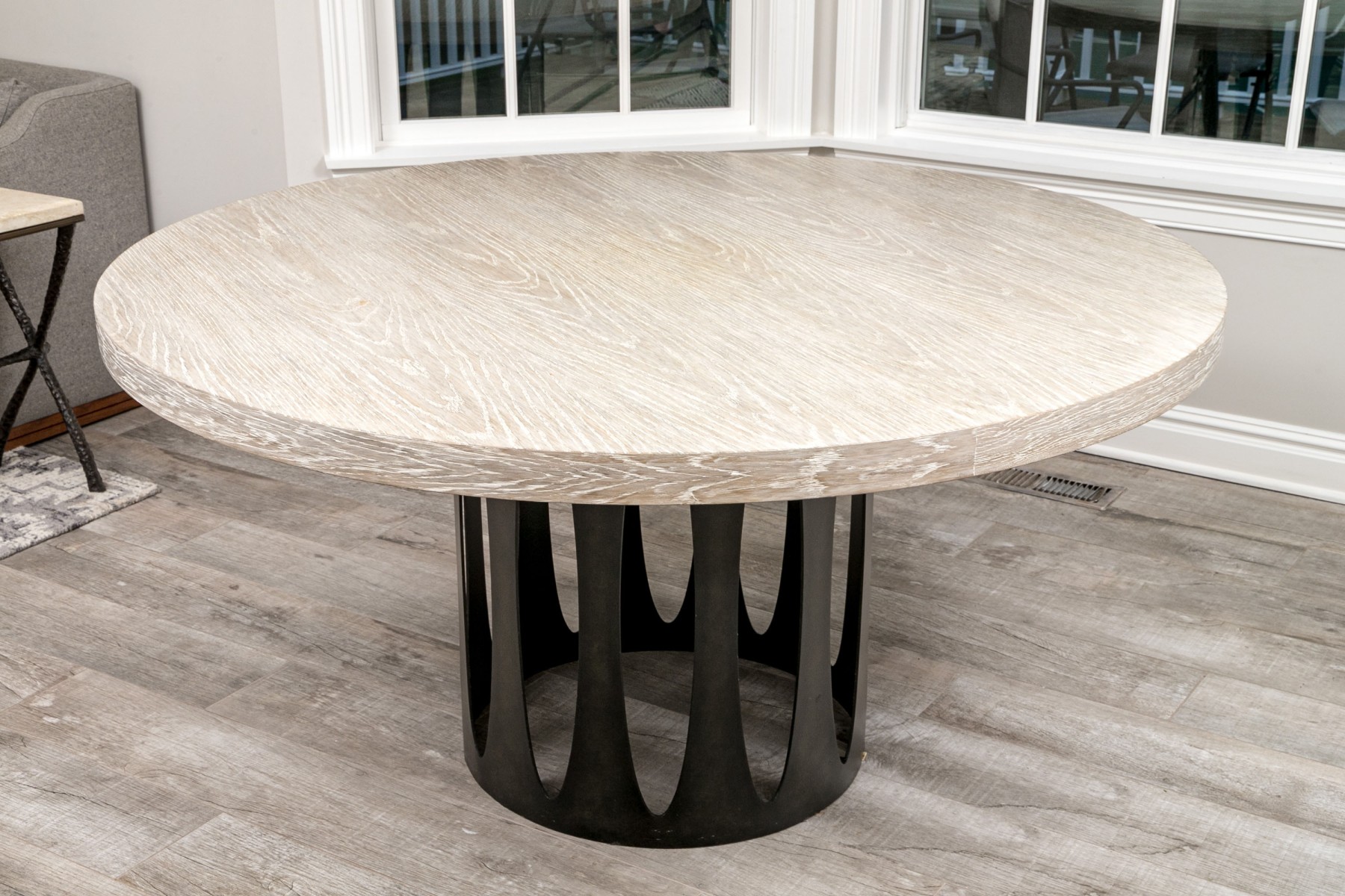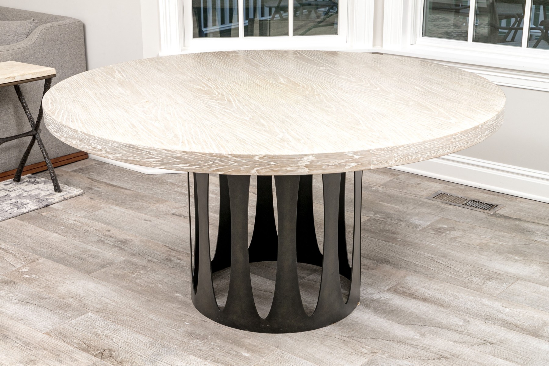 A fabulous Robert James "Windsong" dining table with a striking contemporary style. Features a large 5 ft. round white oak top over a chic pierced black metal drum pedestal lending a cagelike appearance for a modern blend of rustic and sleek aesthetics.
