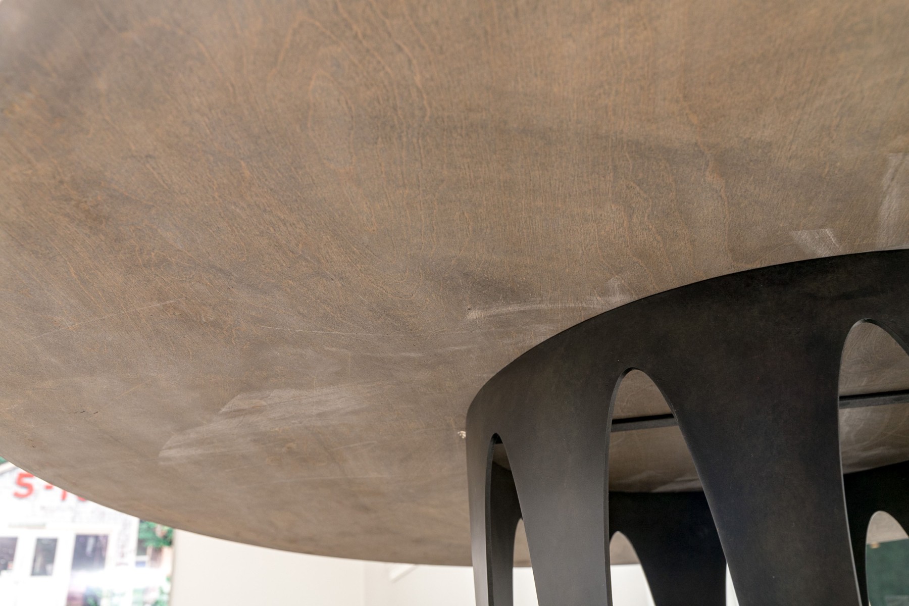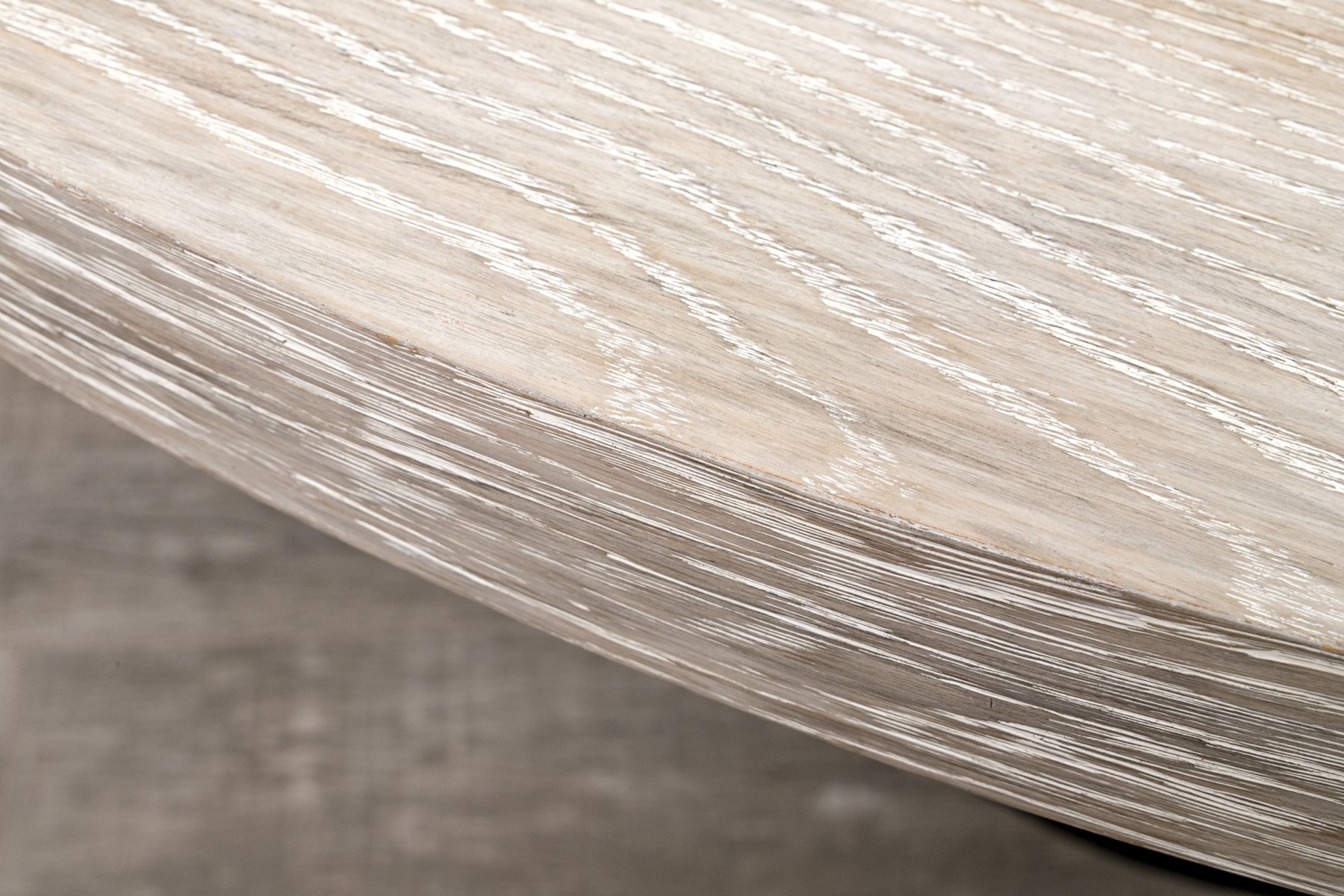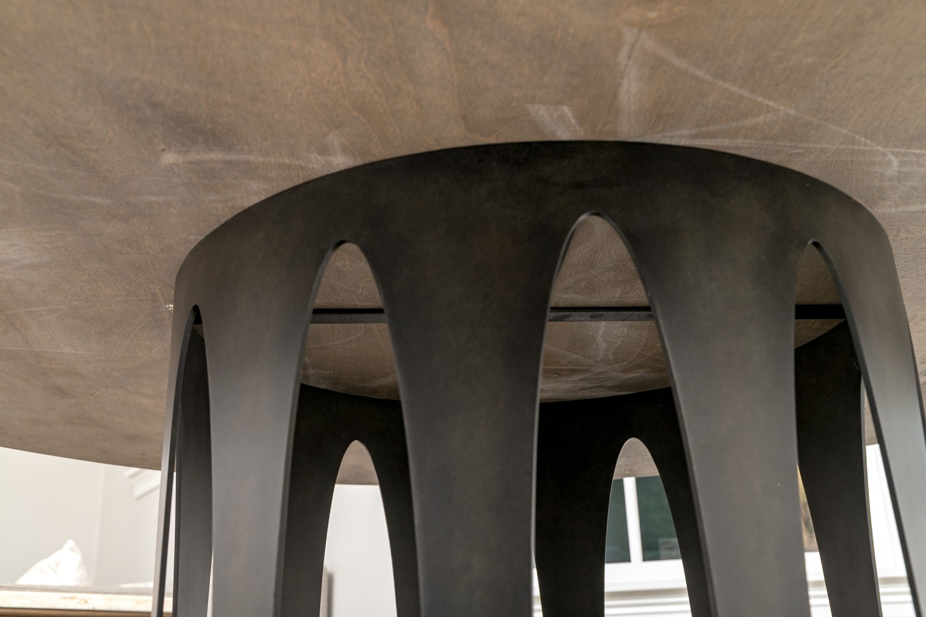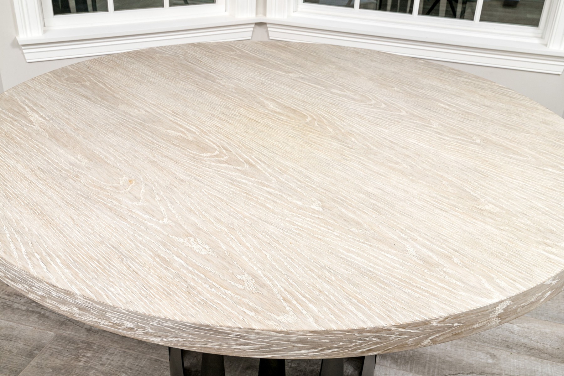 A fabulous Robert James "Windsong" dining table with a striking contemporary style. Features a large 5 ft. round white oak top over a chic pierced black metal drum pedestal lending a cagelike appearance for a modern blend of rustic and sleek aesthetics.