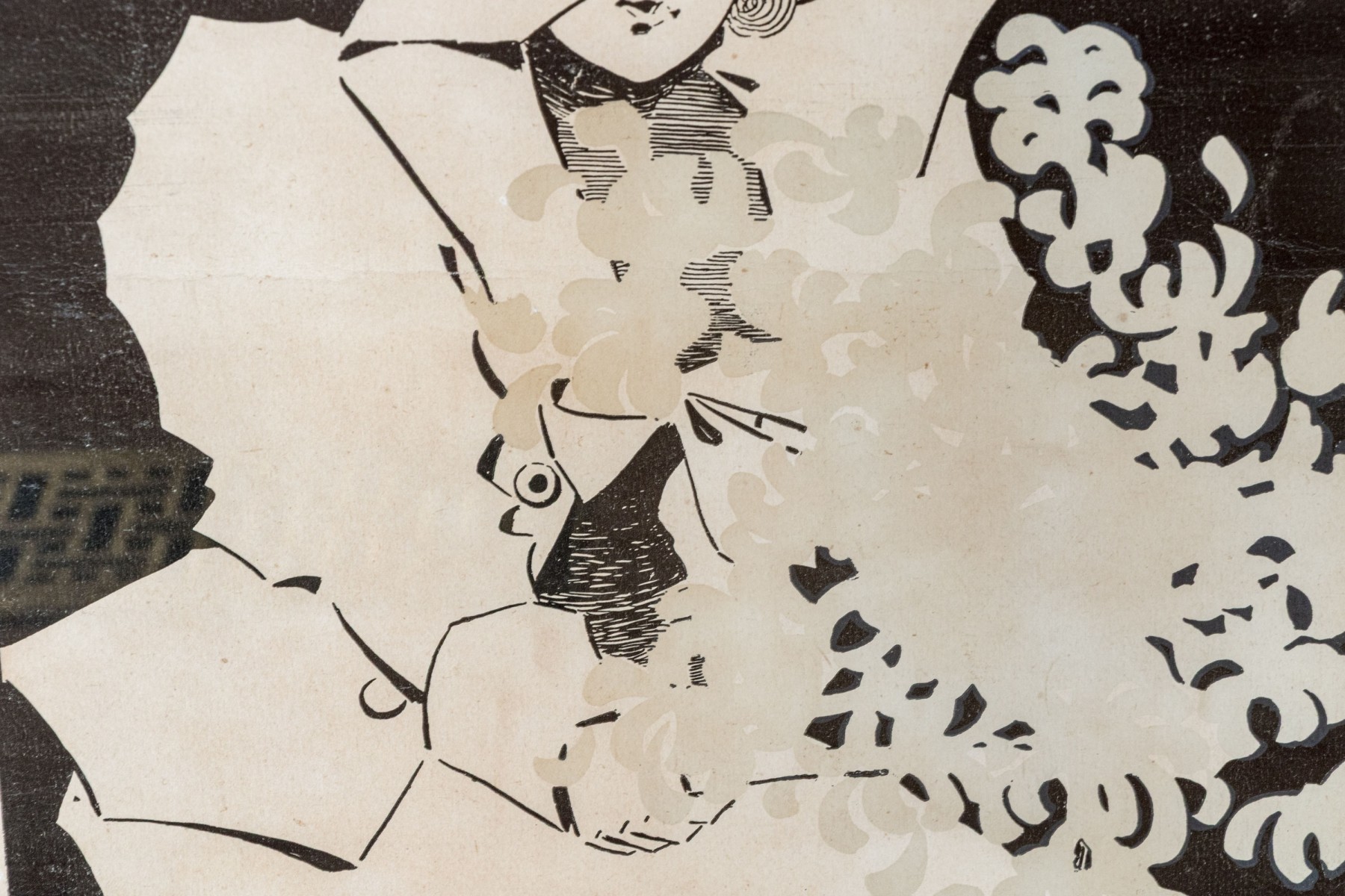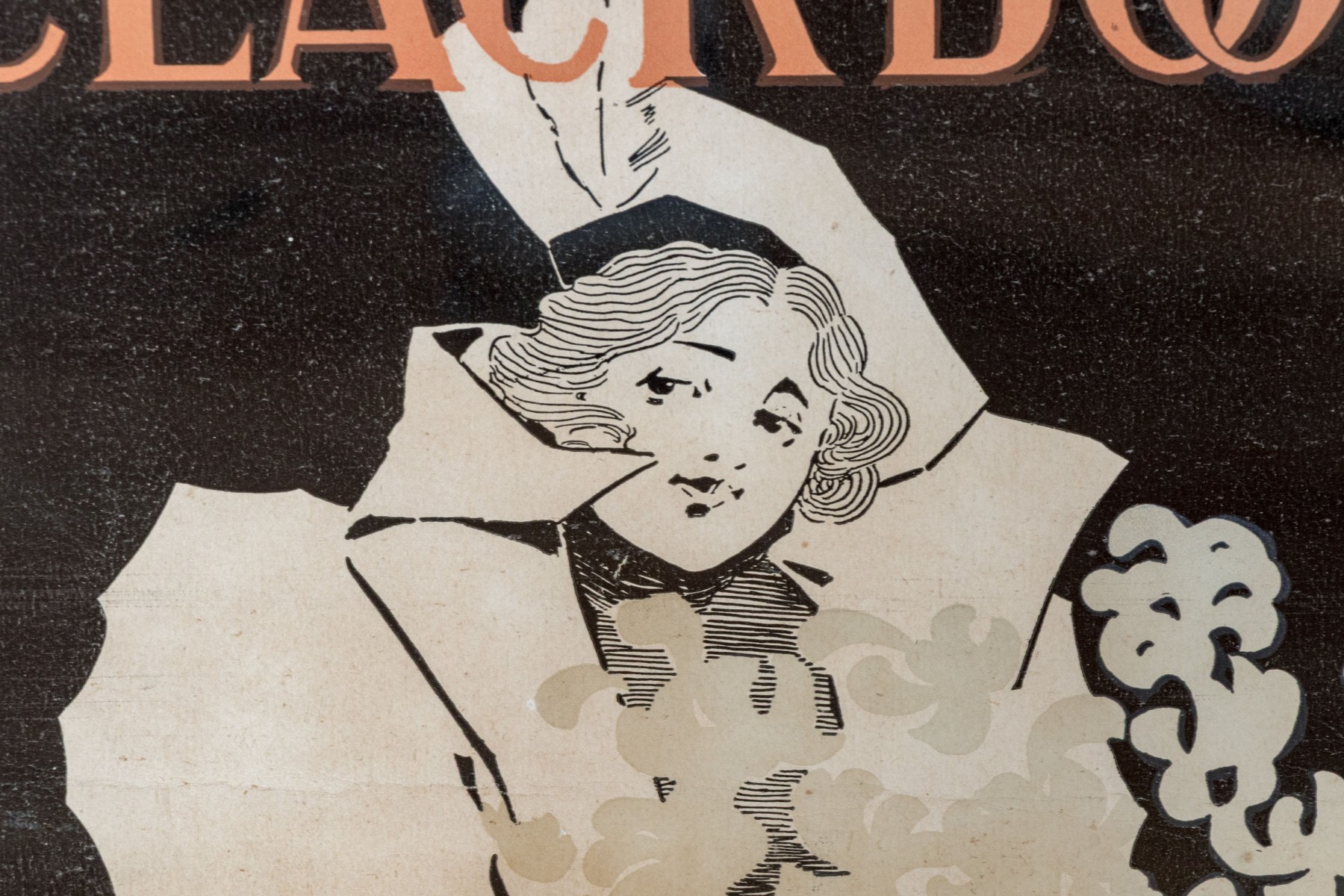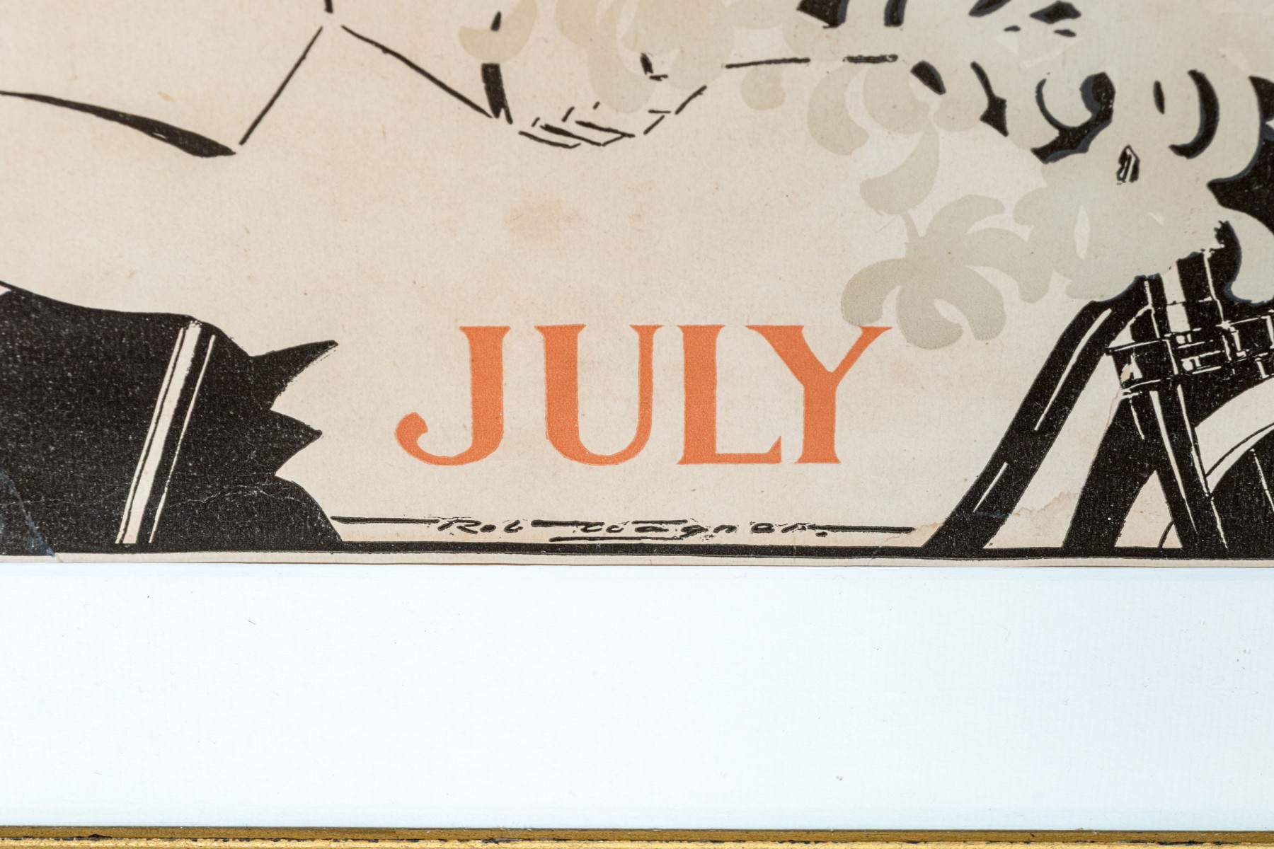 Robert Leicester Wagner (American, 1876-1942) lithographic advertisement for The Clack Book in July, depicting a fashionable woman wearing a hat with a feather and puffy sleeves on a jacket riding a bicycle with graphic white flowers against a black background. The text of the composition comes in orange-red for a wonderful pop of color. Plate signature lower center.