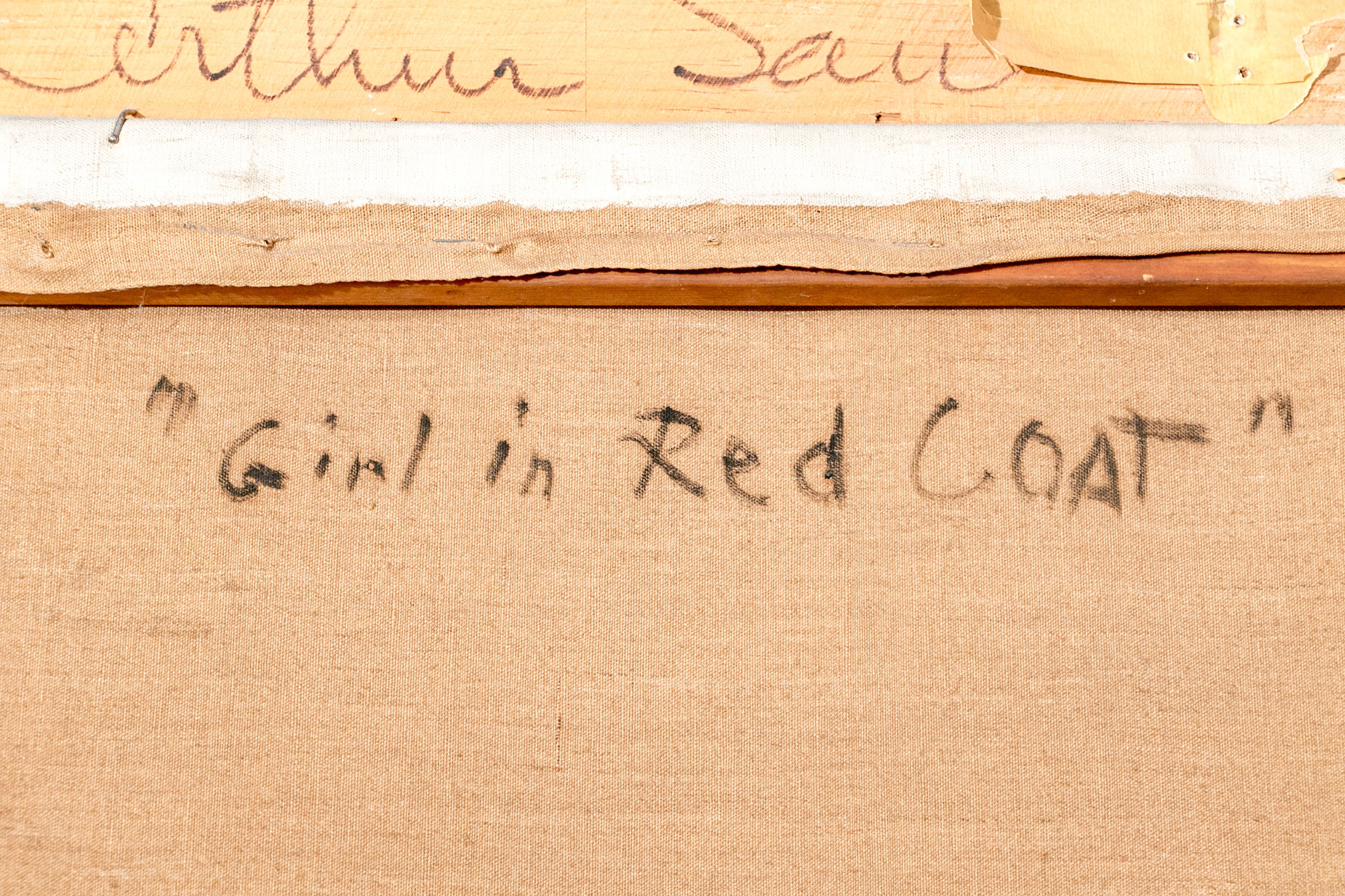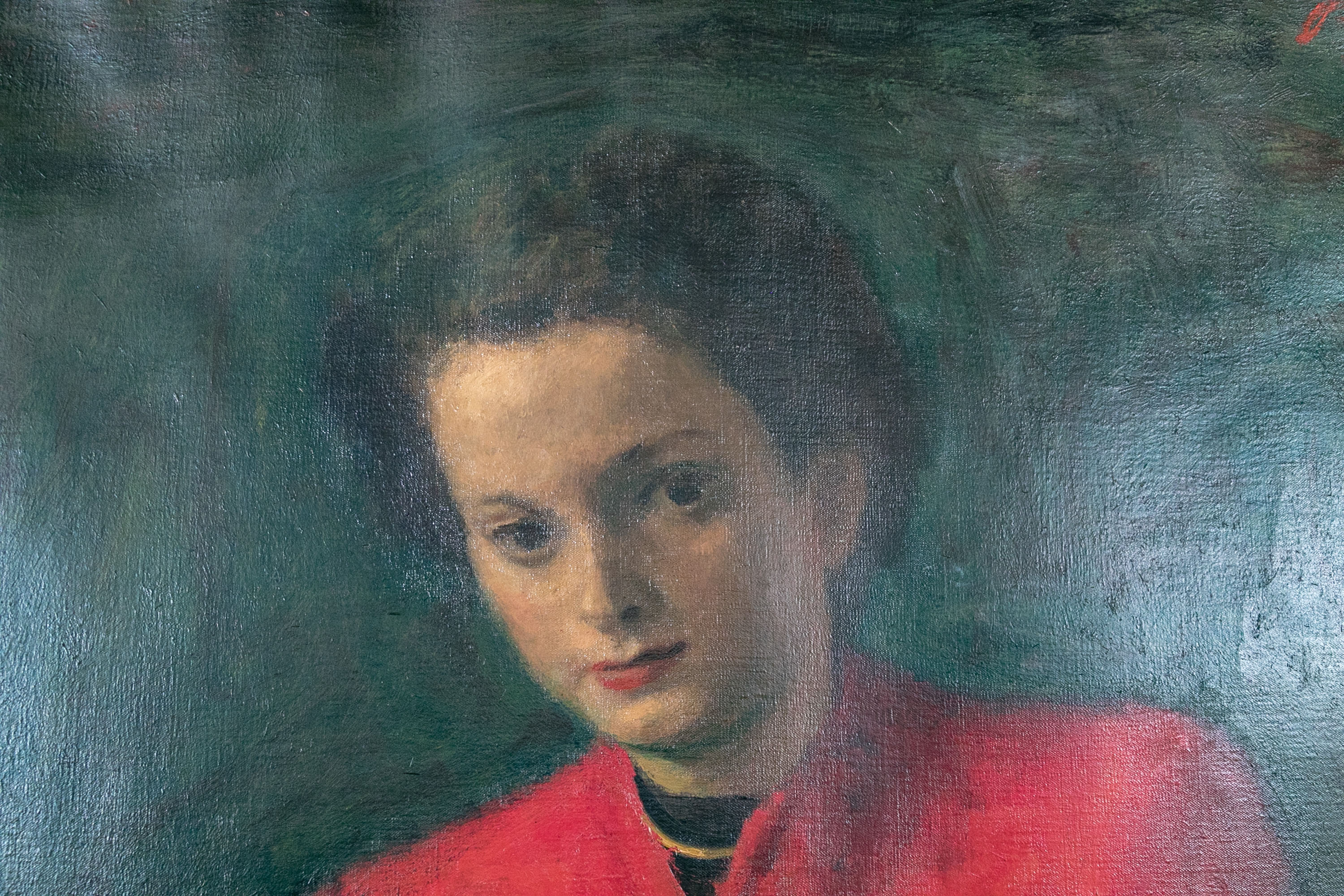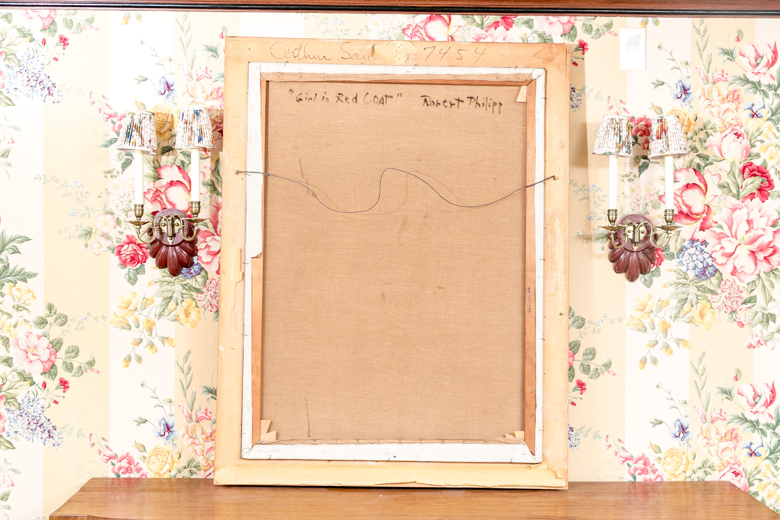 Robert Philipp (American [NY], 1895-1981) "Girl In Red Coat" oil painting on canvas depicting a young lady with a brunette updo wearing a vibrant red jacket with a double row of buttons down the front over a red dress with a simple gold necklace. She poses seated against a dark green background. Signed or marked upper right, with additional signature and title on the canvas verso.