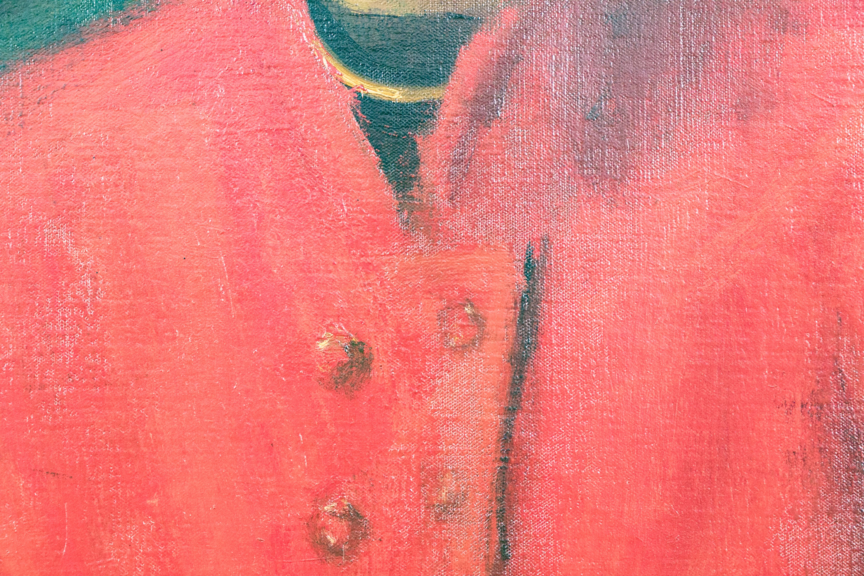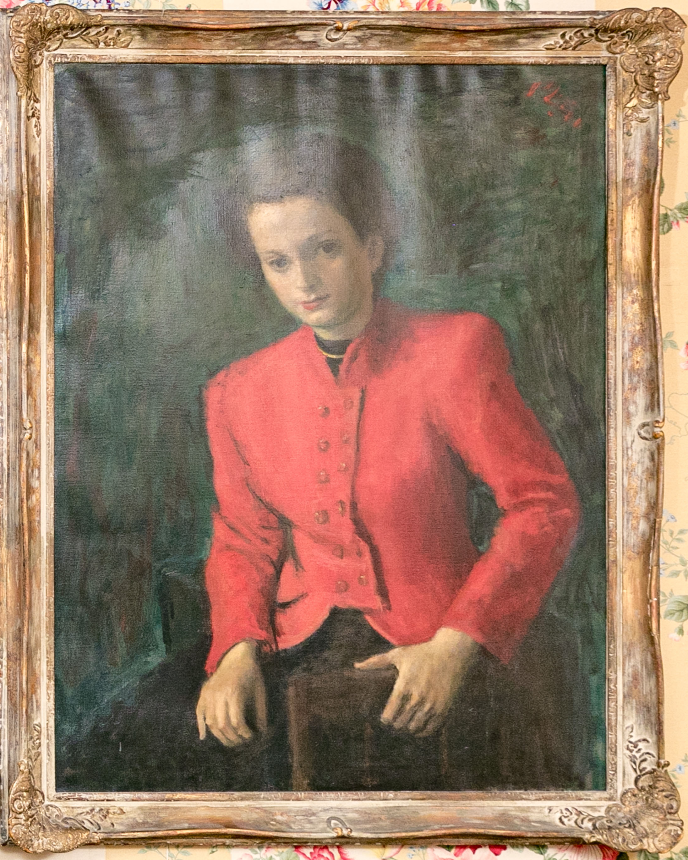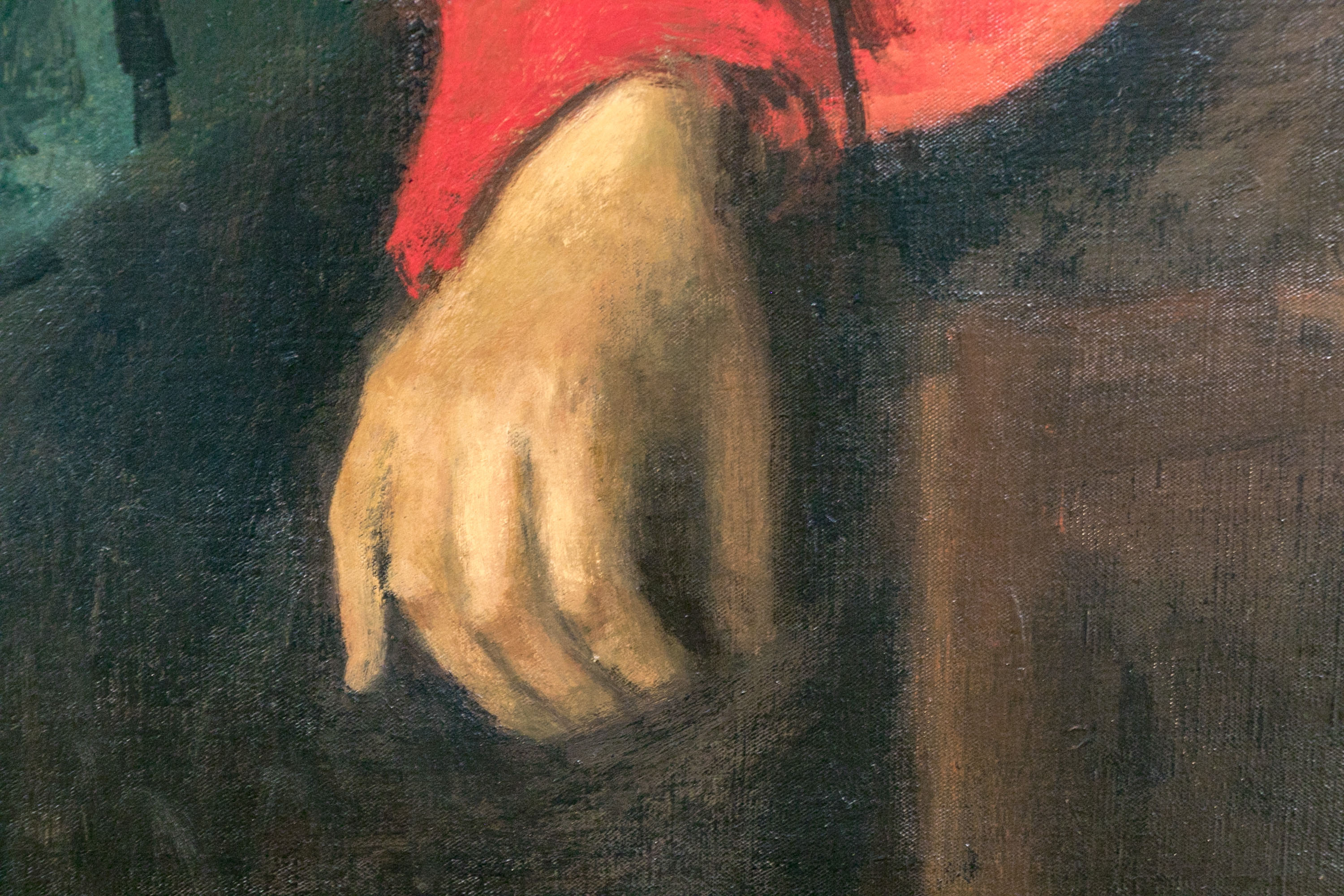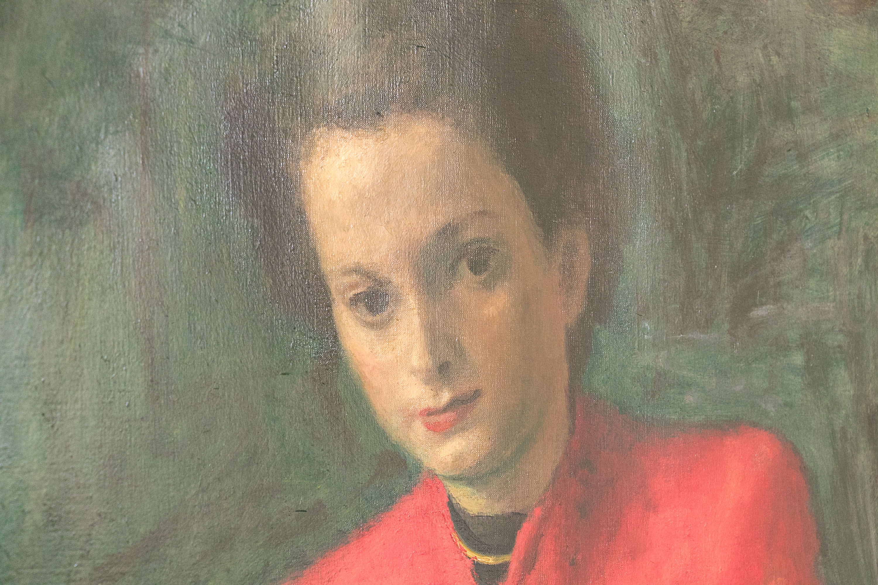 Robert Philipp (American [NY], 1895-1981) "Girl In Red Coat" oil painting on canvas depicting a young lady with a brunette updo wearing a vibrant red jacket with a double row of buttons down the front over a red dress with a simple gold necklace. She poses seated against a dark green background. Signed or marked upper right, with additional signature and title on the canvas verso.
