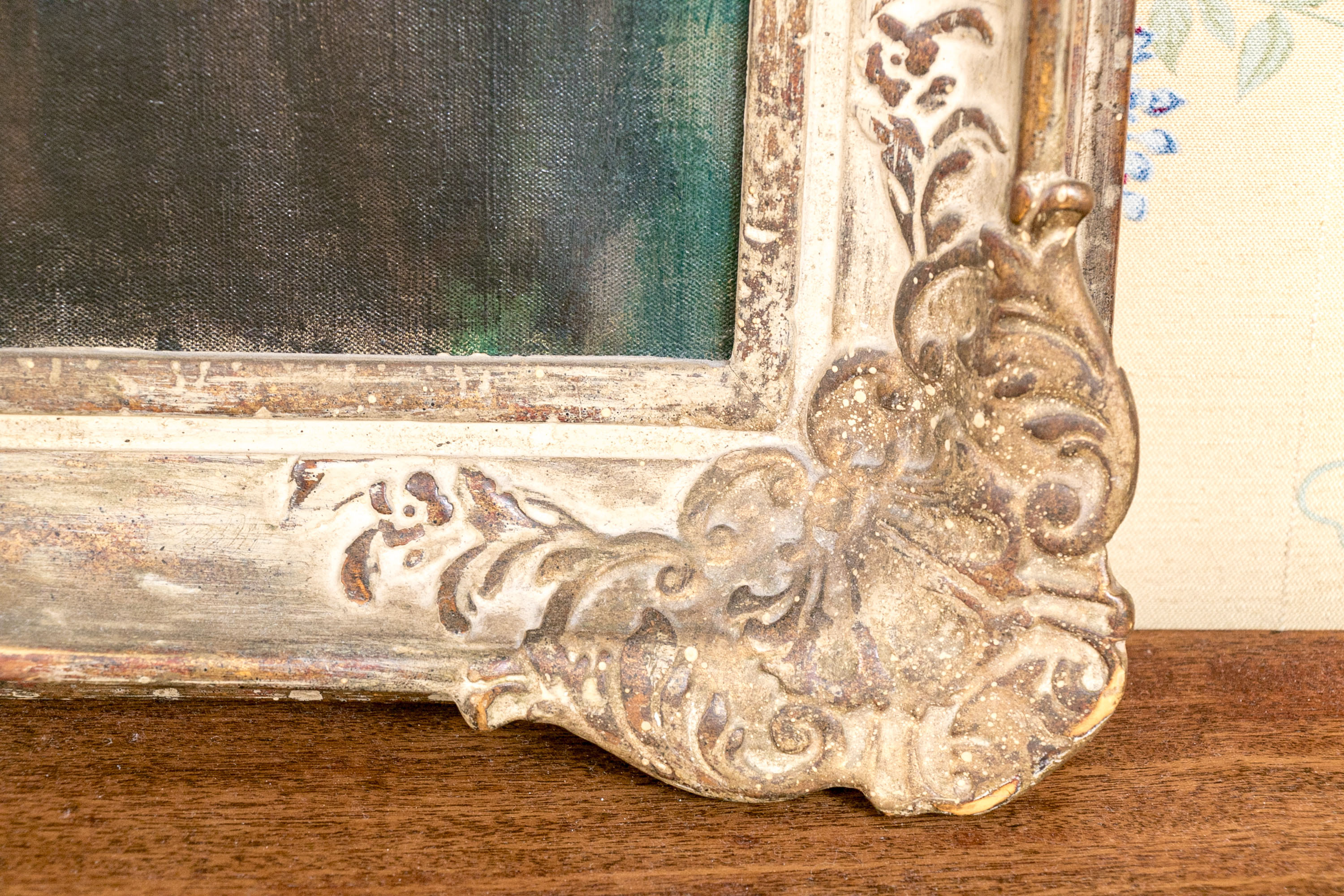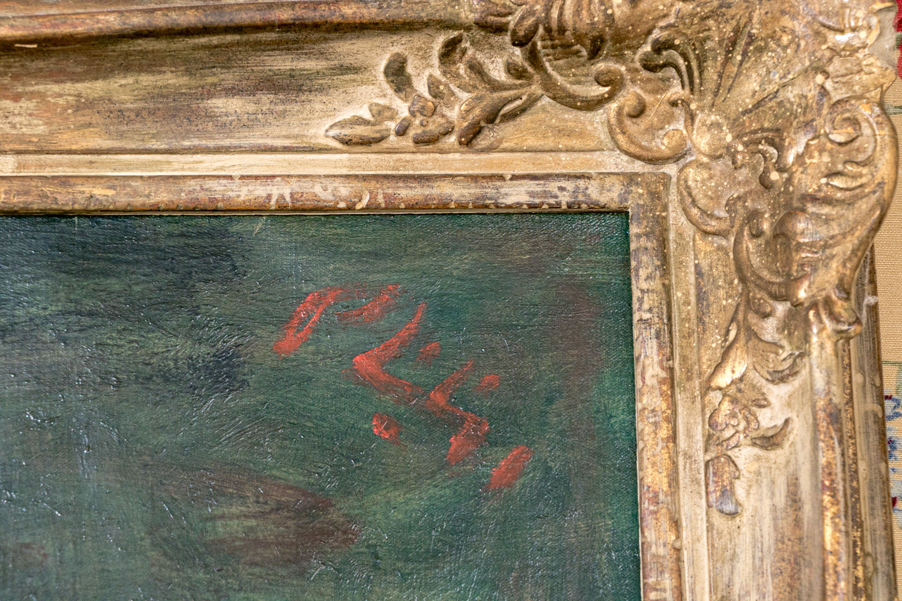 Displayed in a beautiful rustic gilt frame with flourished relief at the corners.