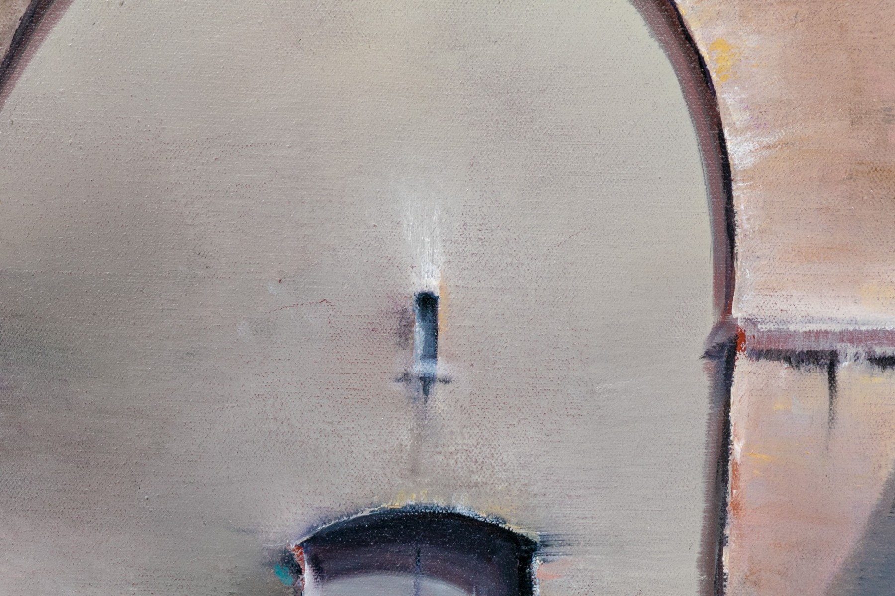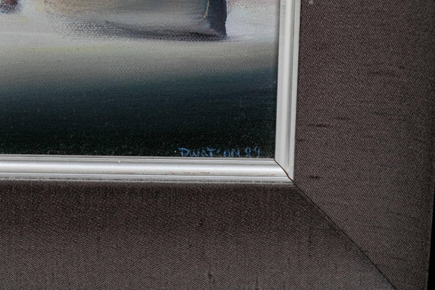 The surrealist oil painting by American artist Robert Watson (1923-2004). It features a surreal landscape with an arch landscape and is signed by the artist in the lower right corner. The artwork is dated '89. It has been custom framed. Robert Watson was known for his surreal and imaginative artworks. Originally purchased for $2,900 in 1989.