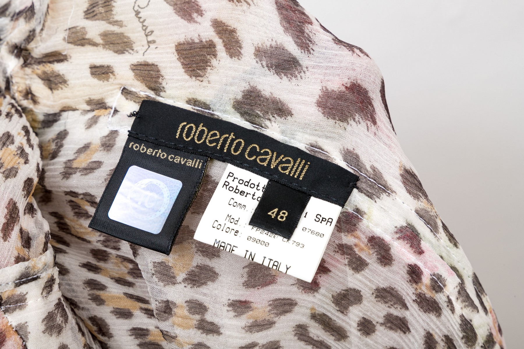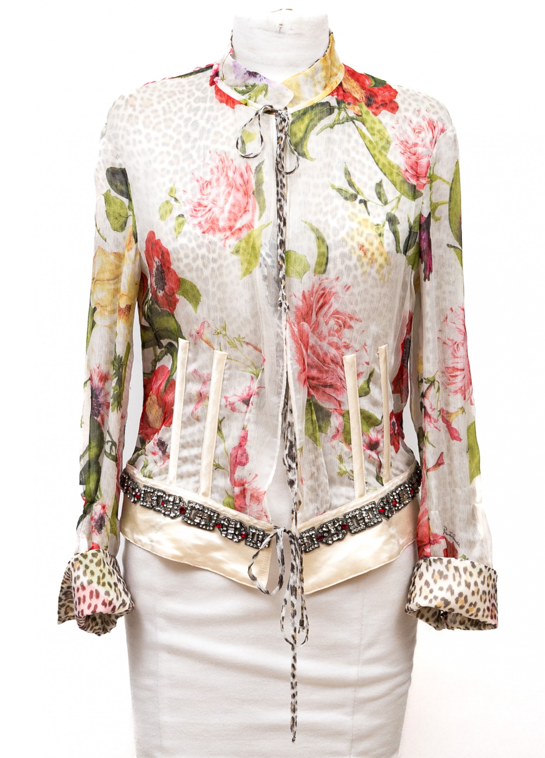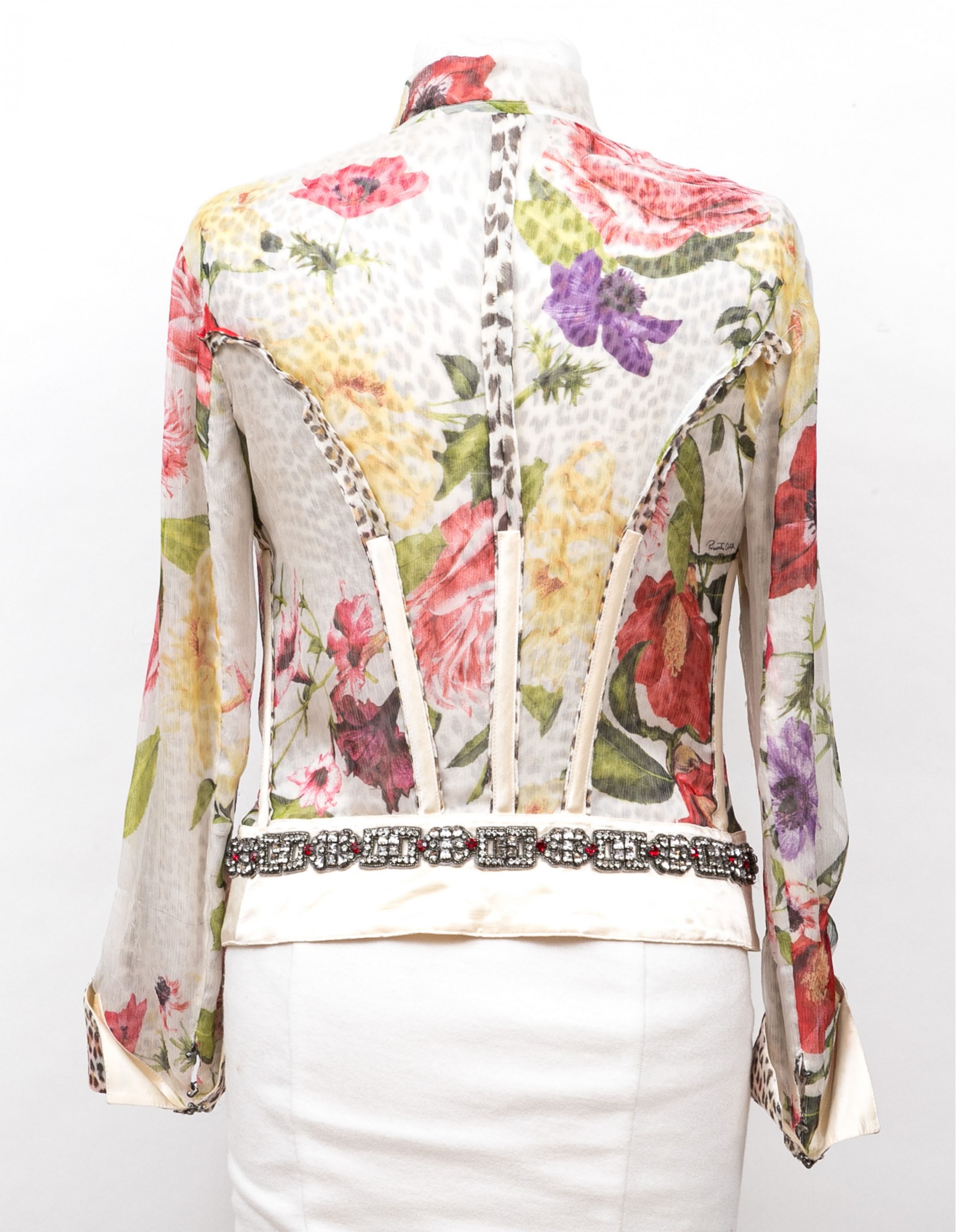 Roberto Cavalli ivory, leopard print and floral blouse, bejeweled, size 48