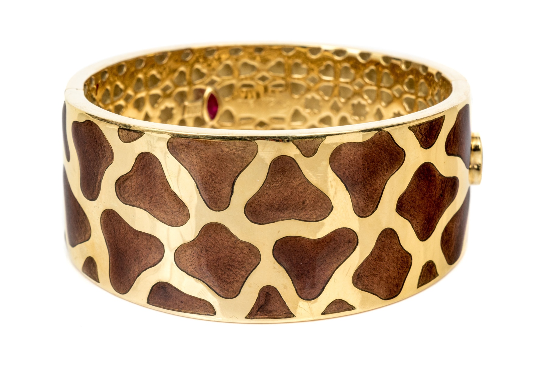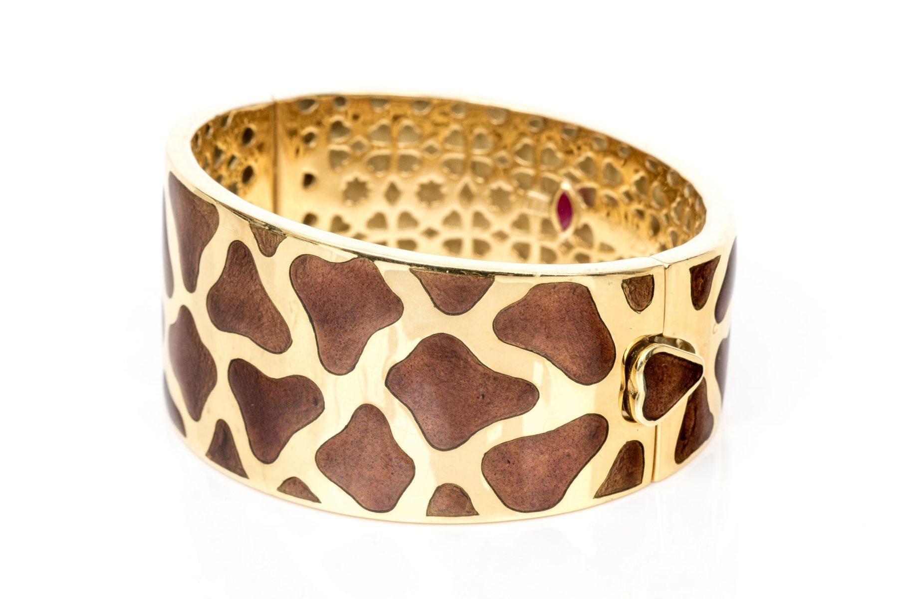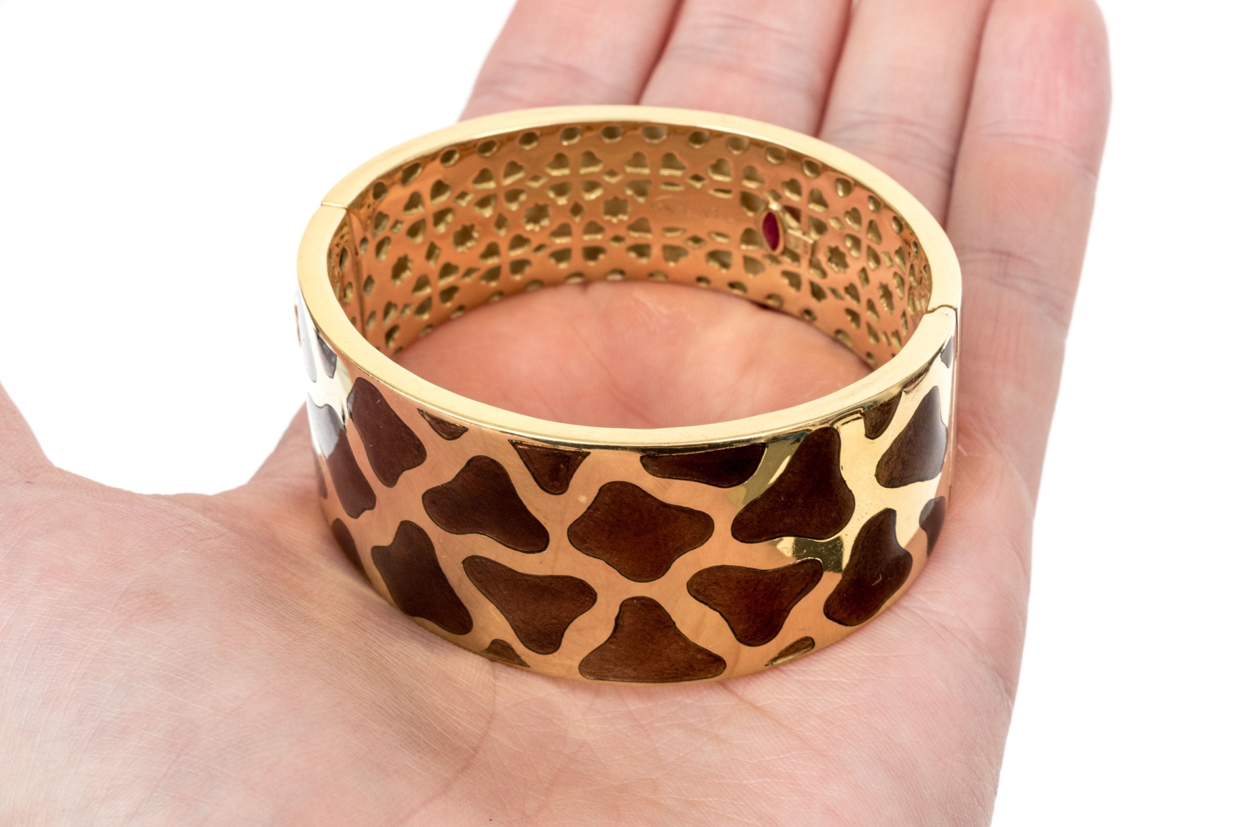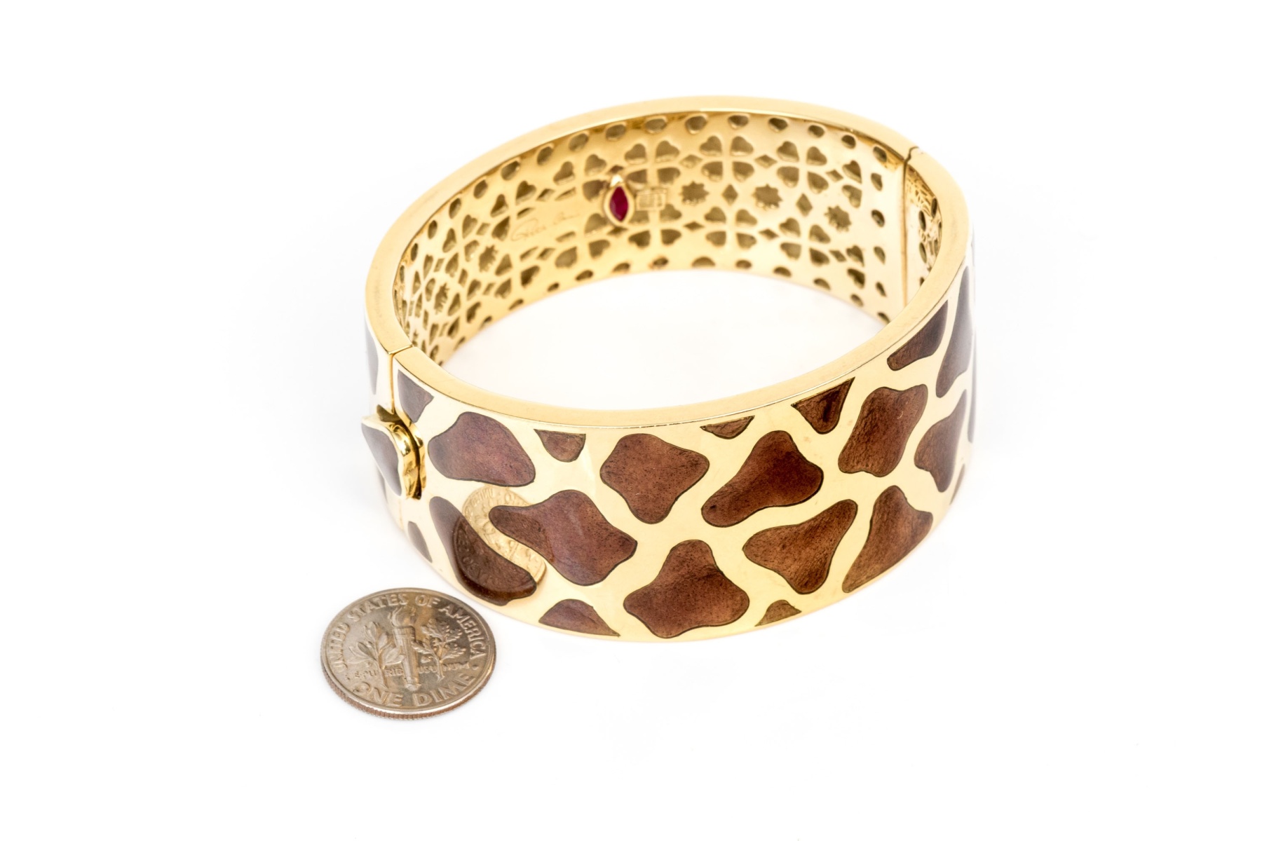 Roberto Coin 18k yellow gold magnificent ultra wide giraffe patterned bangle bracelet. This stunning bangle bracelet features a graceful taper, decorated with brown enamel giraffe patterned spots and is finished with a discreet push button clasp. The iconic Roberto Coin ruby is set within the inside of the bracelet.