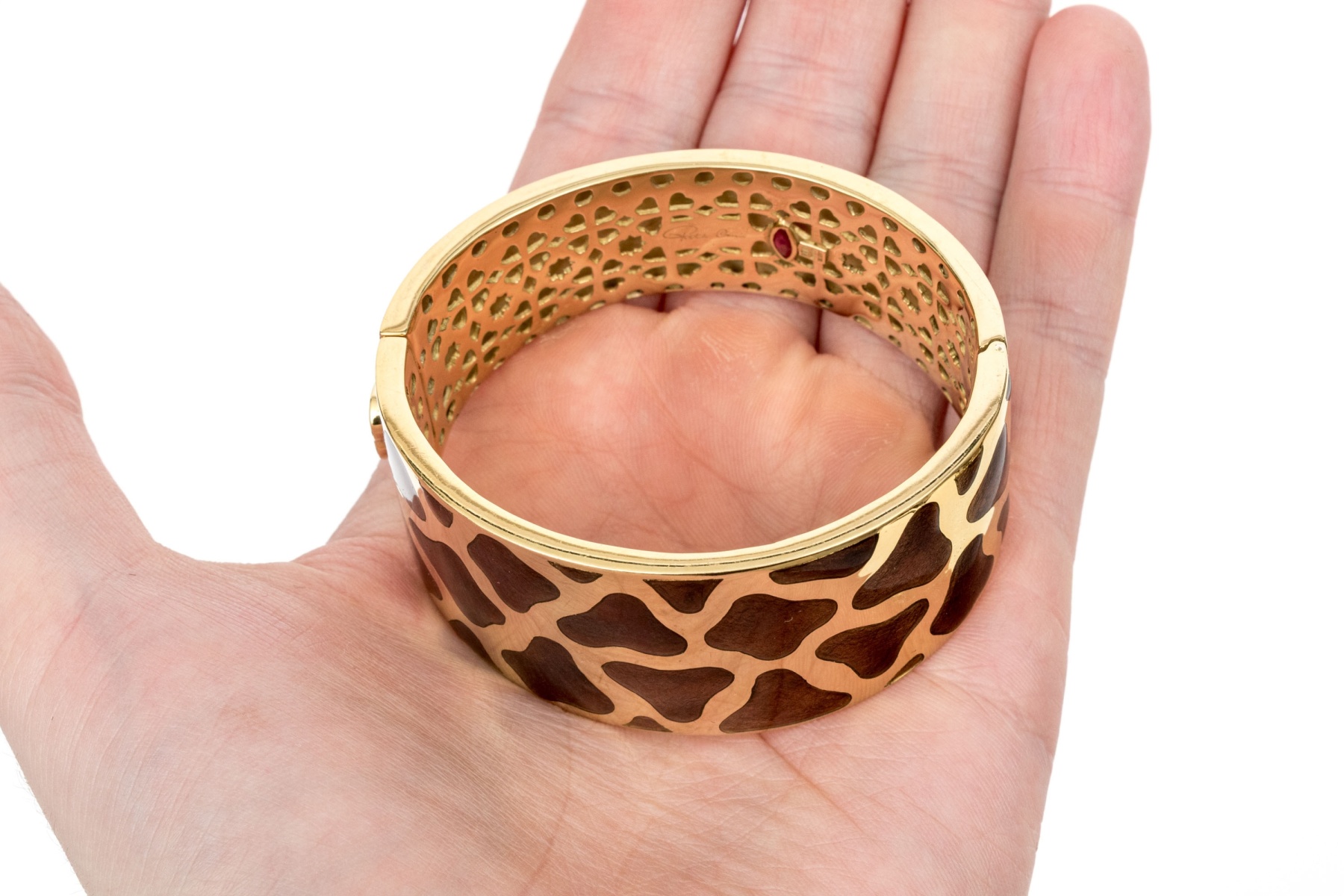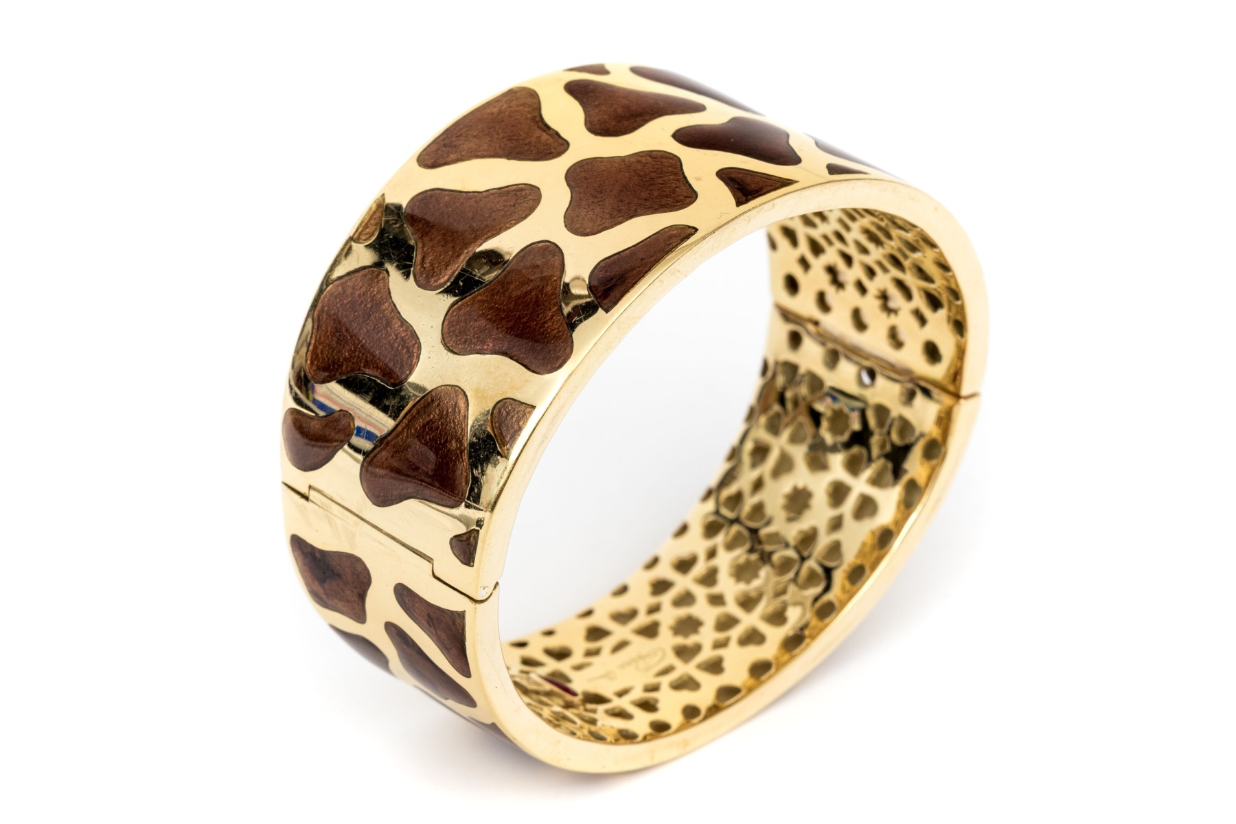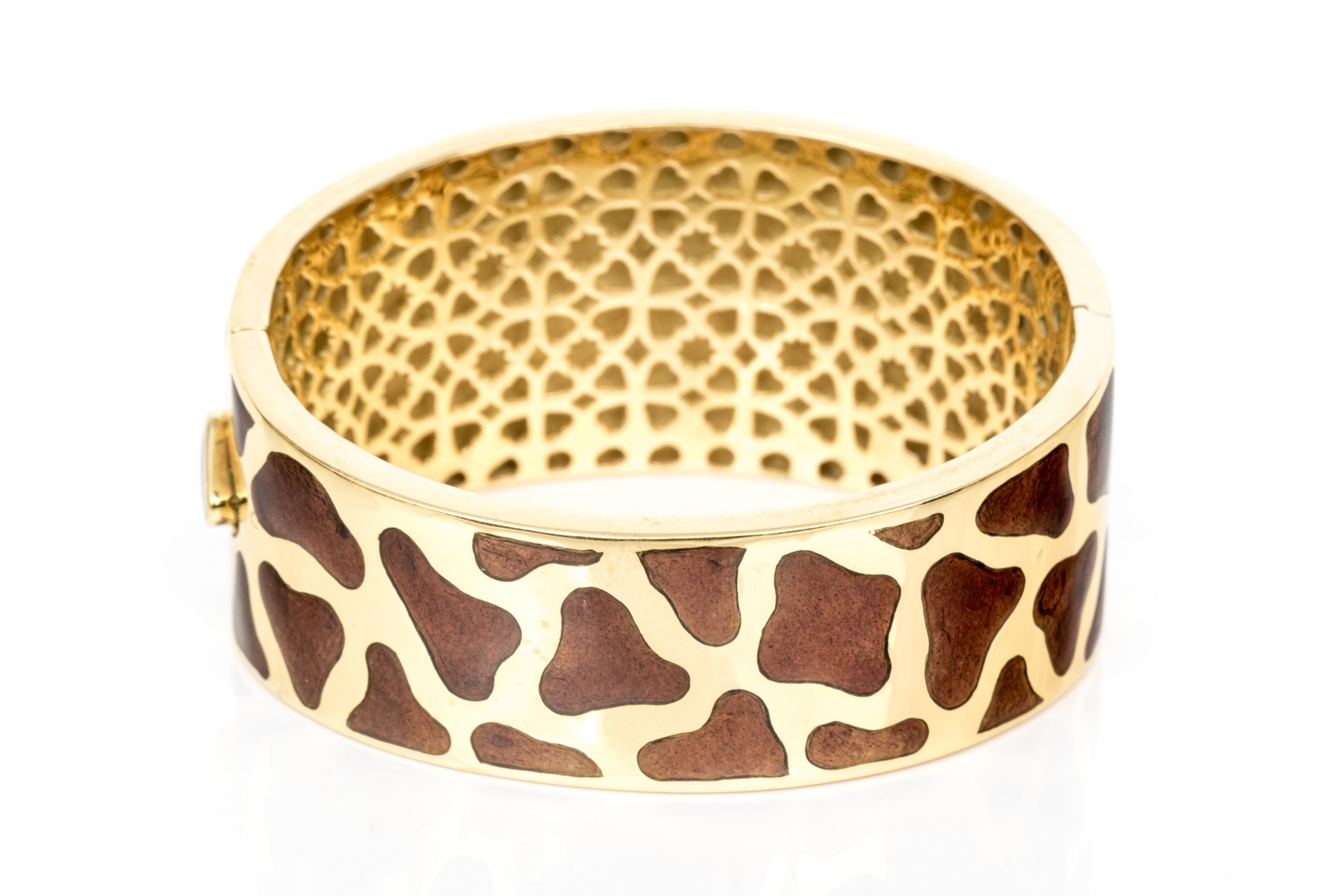 Roberto Coin 18k yellow gold magnificent ultra wide giraffe patterned bangle bracelet. This stunning bangle bracelet features a graceful taper, decorated with brown enamel giraffe patterned spots and is finished with a discreet push button clasp. The iconic Roberto Coin ruby is set within the inside of the bracelet.
