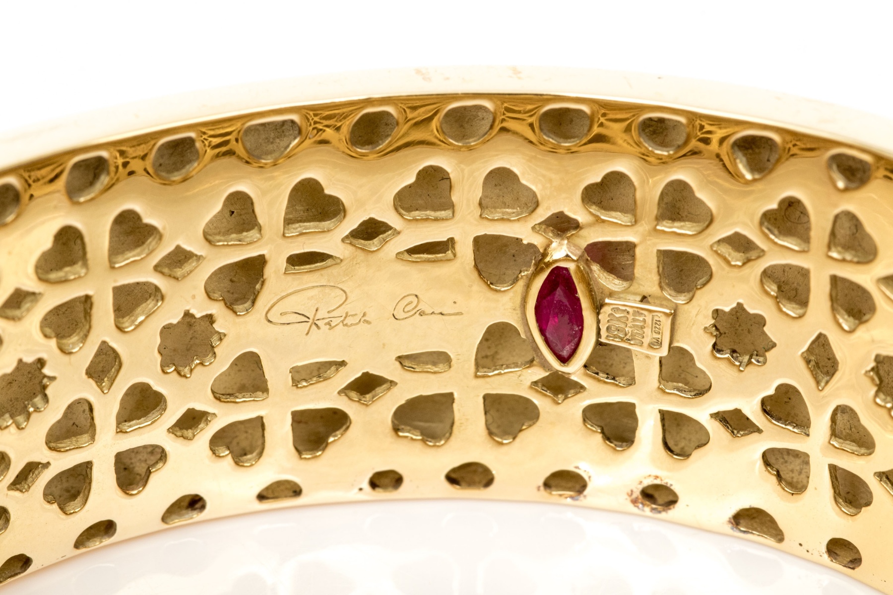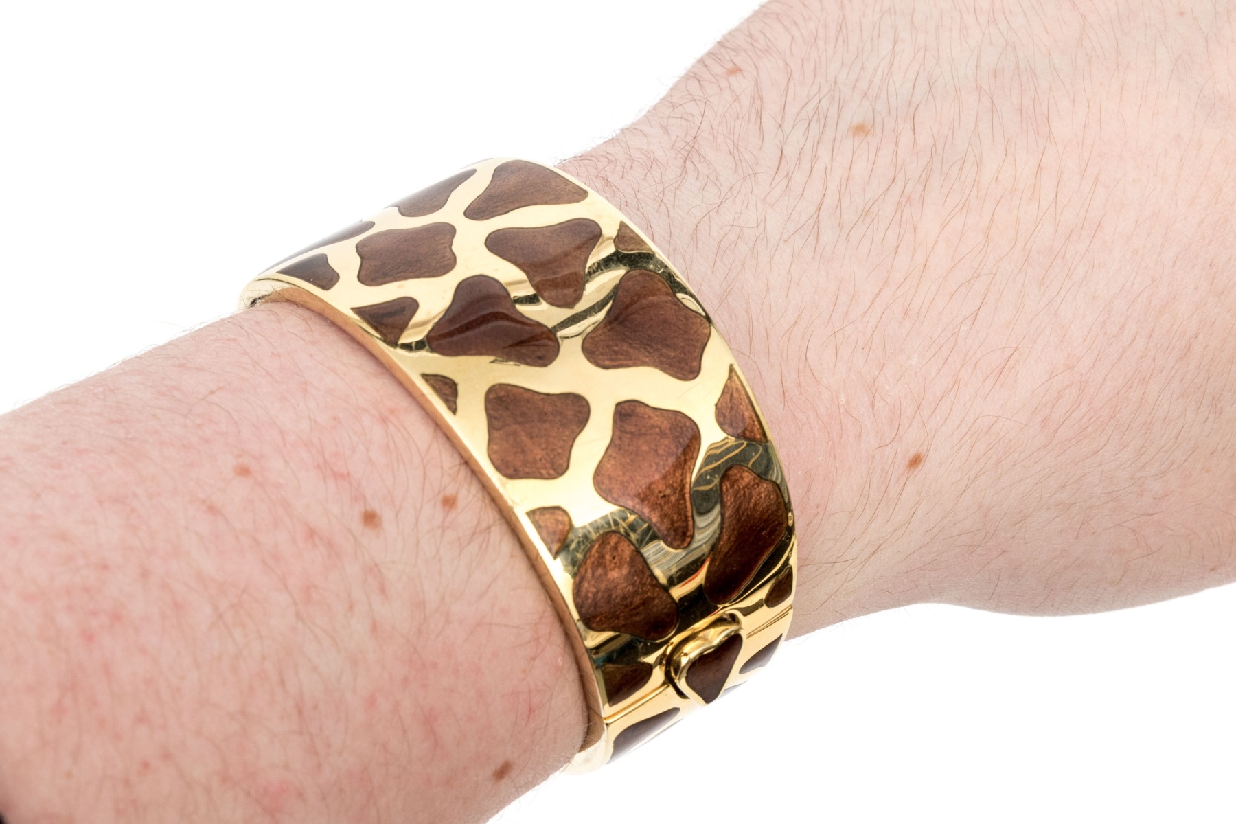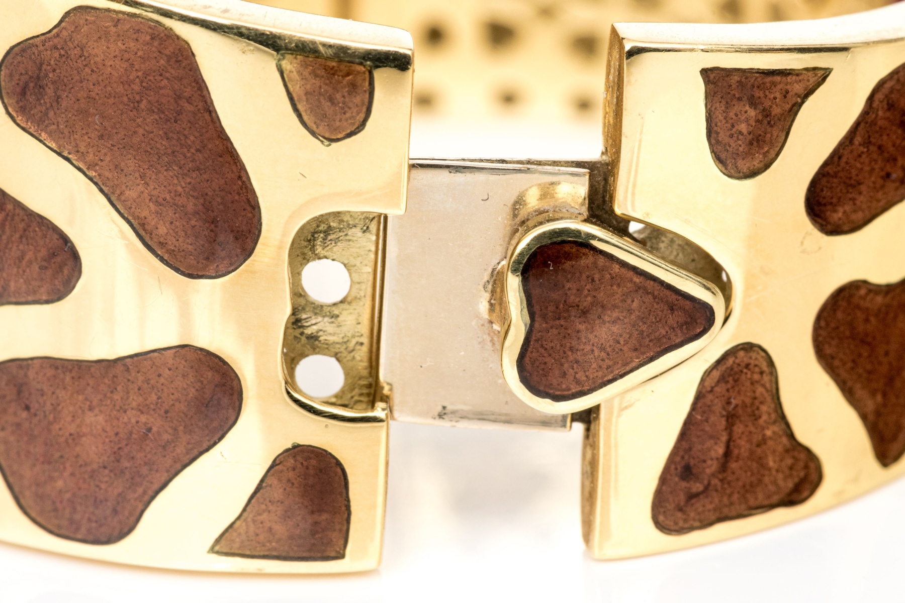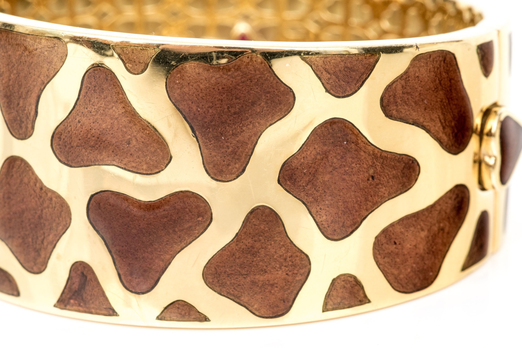 Roberto Coin 18k yellow gold magnificent ultra wide giraffe patterned bangle bracelet. This stunning bangle bracelet features a graceful taper, decorated with brown enamel giraffe patterned spots and is finished with a discreet push button clasp. The iconic Roberto Coin ruby is set within the inside of the bracelet.