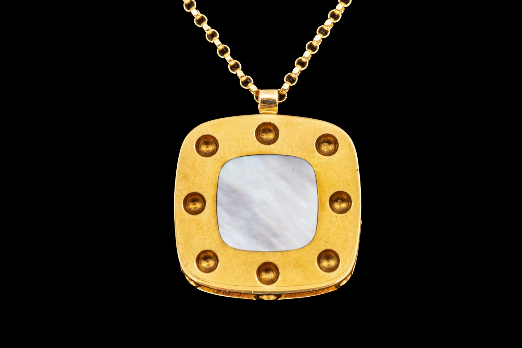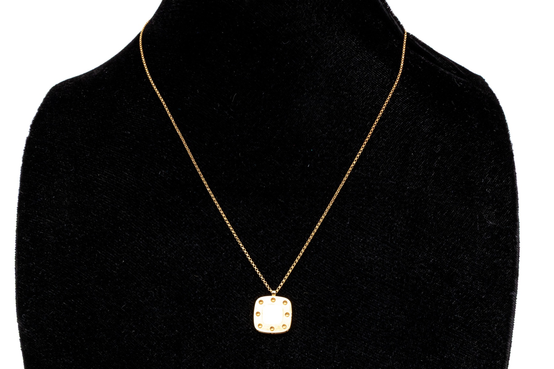 Roberto Coin 18k yellow gold "Pois Moi" mother-of-pearl necklace, with box. This striking necklace features a rounded mother-of-pearl center, bordered by a dimpled border and displayed on a fine rolo style chain and finished with a lobster claw style clasp. Accompanied by the box