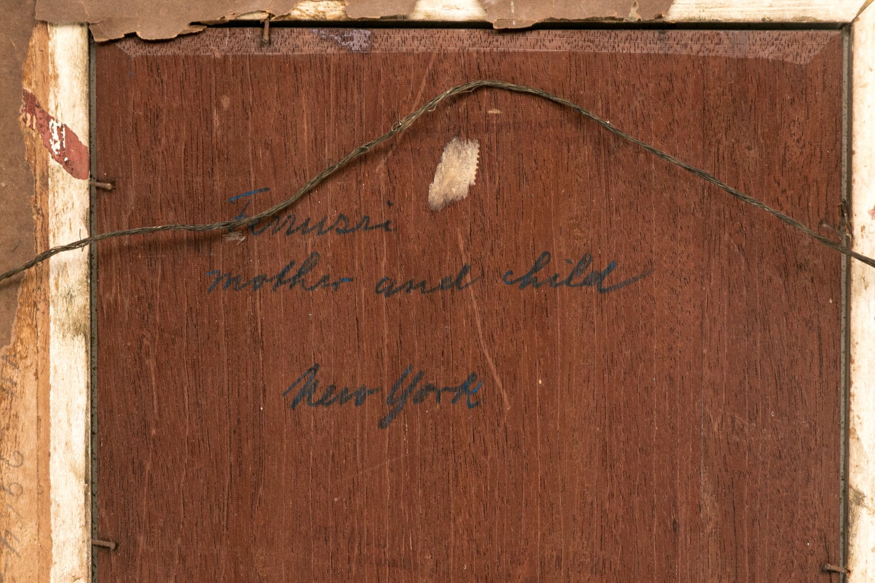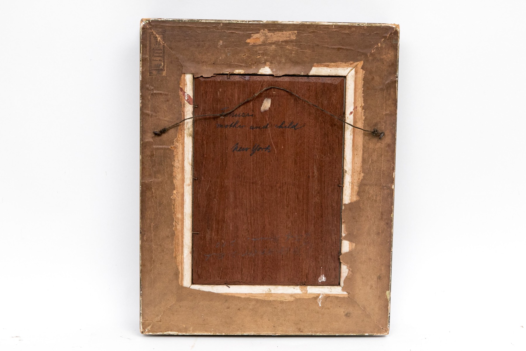 Signed lower left and on verso, New York, and title. The image is that of "Madonna of the Streets" that the artist was known for. A somber composition with a mother holding her sleeping child outside a building. Presented in an antique carved and dark gilt frame.