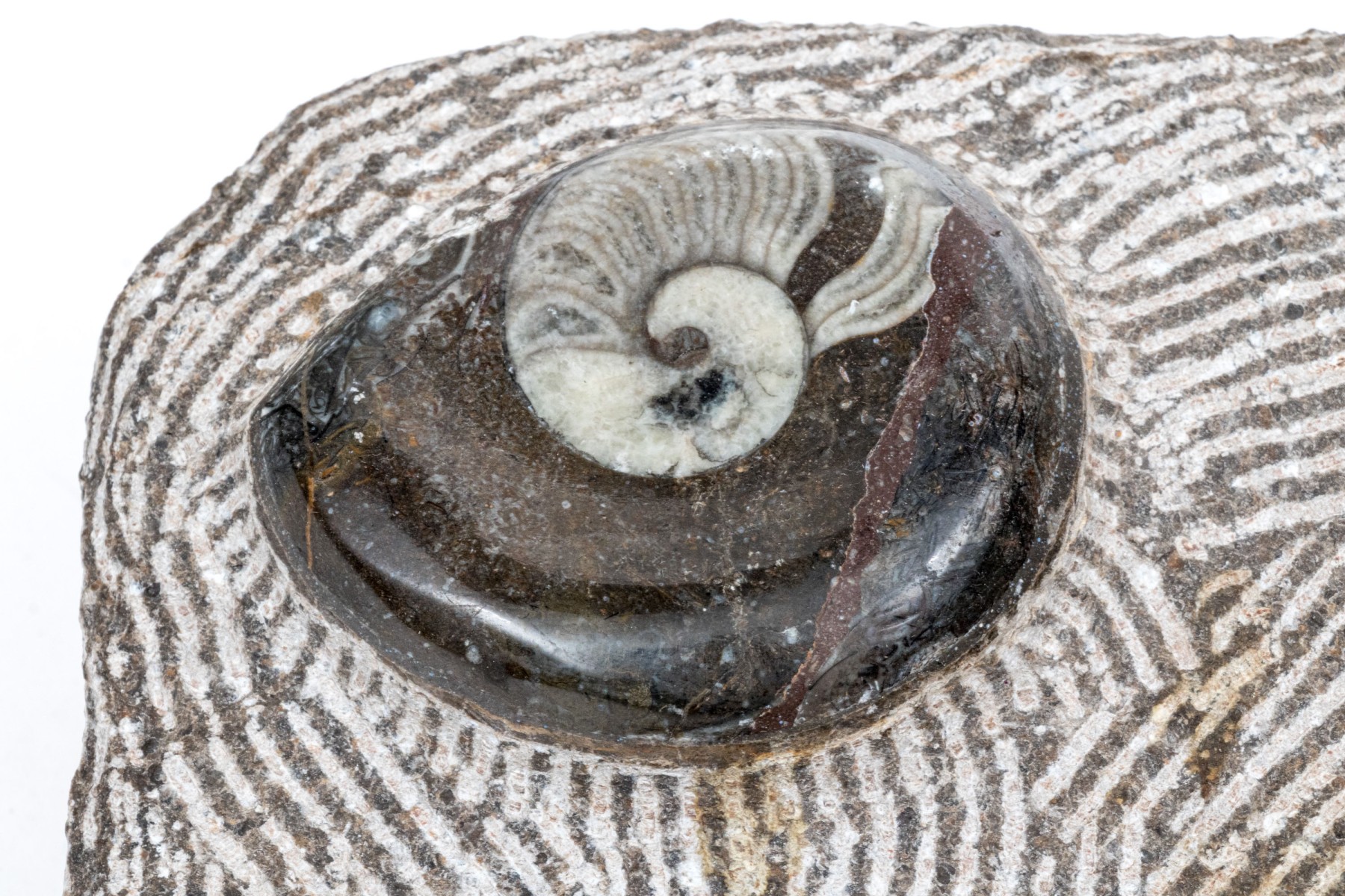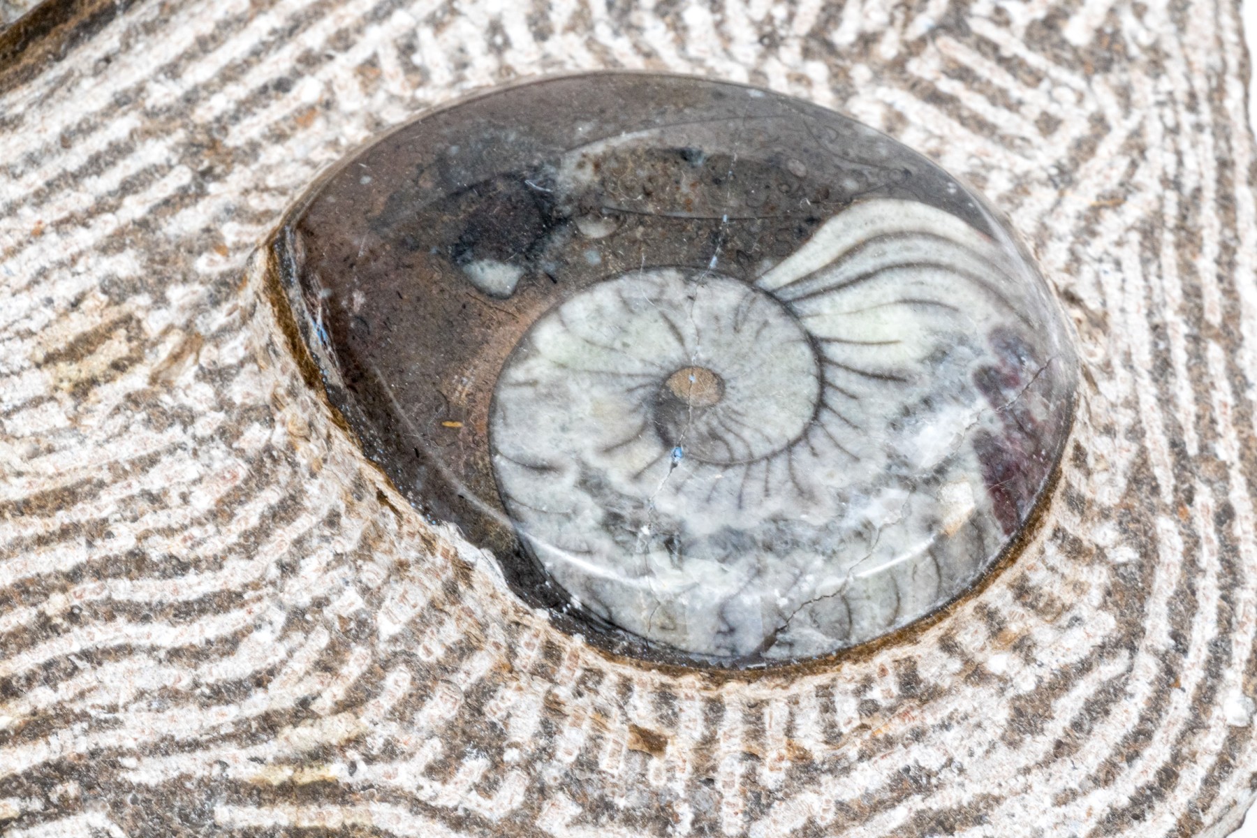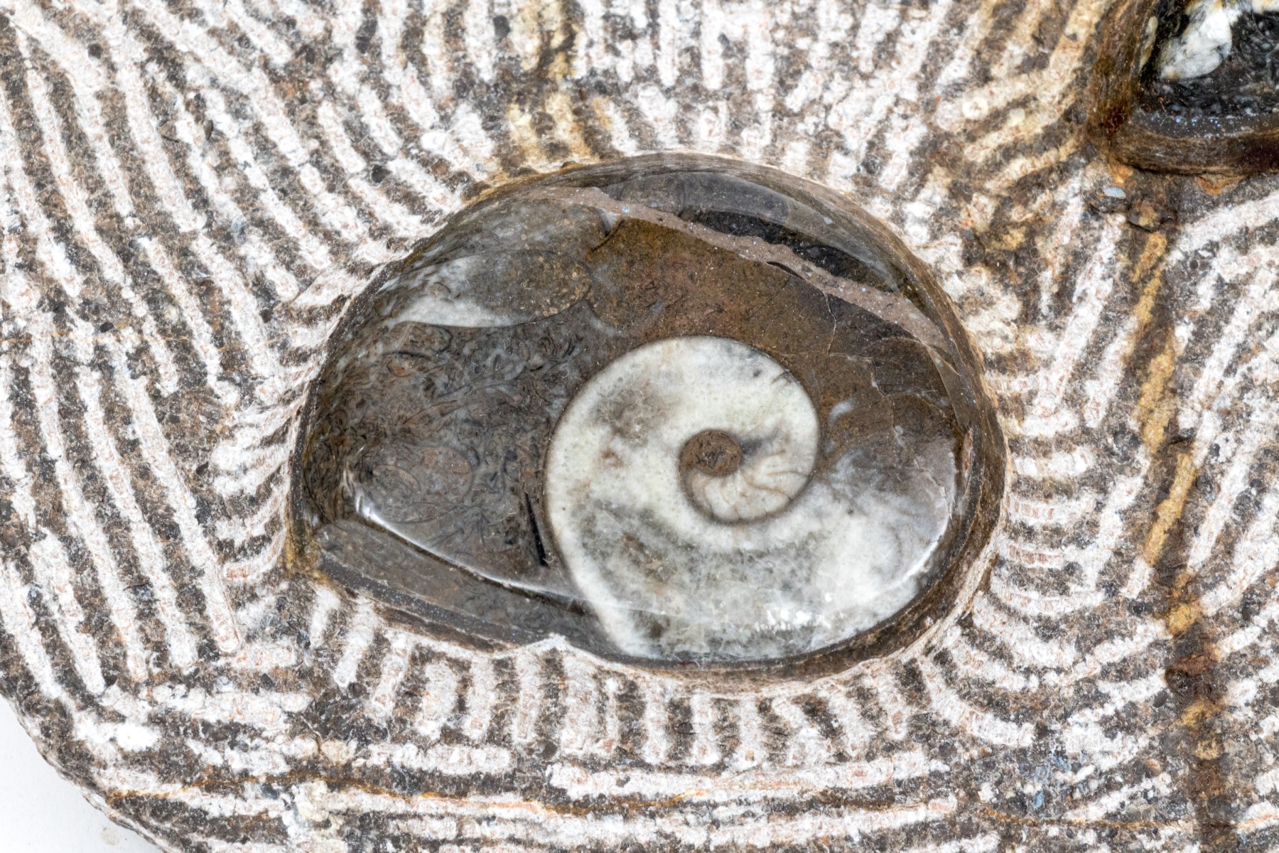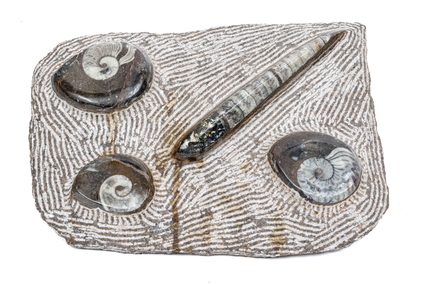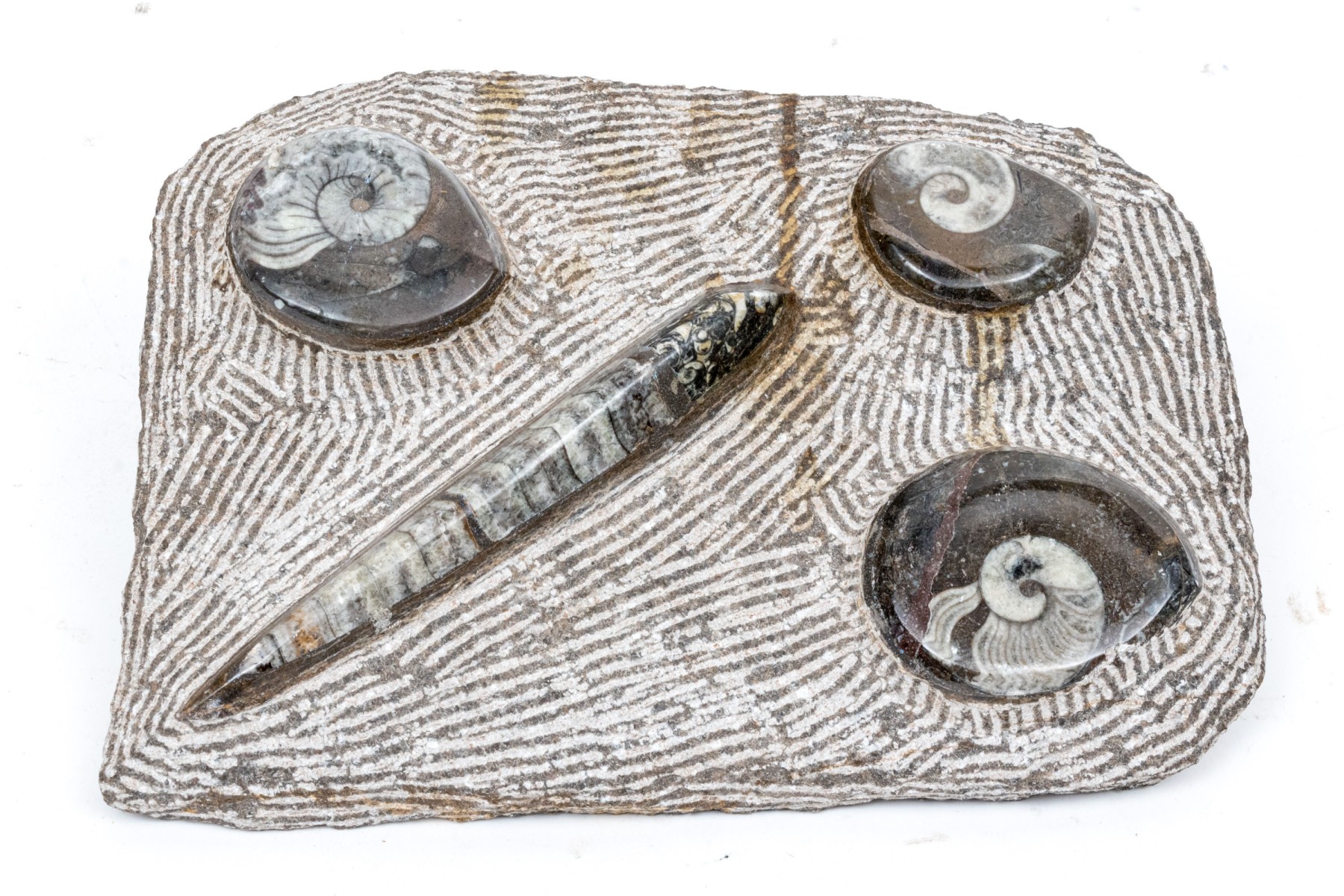 An irregular gray ridged stone with three polished possible ammonite fossils along with a single tubular one. Repair lines across the stone and along the tube.