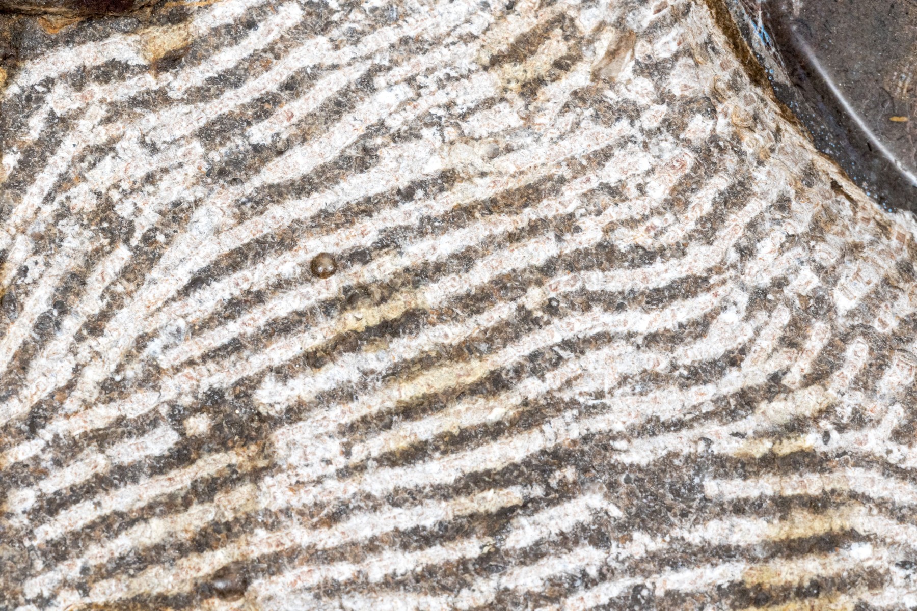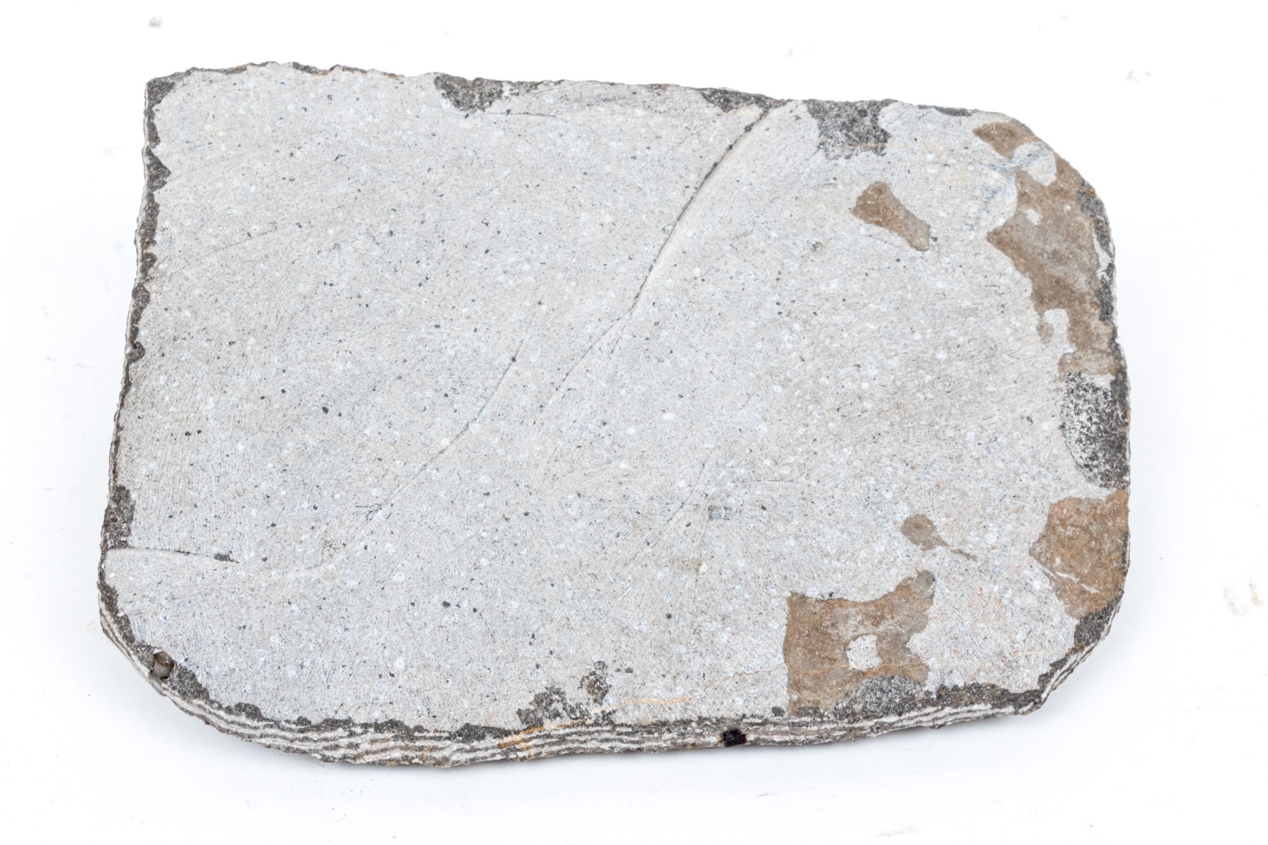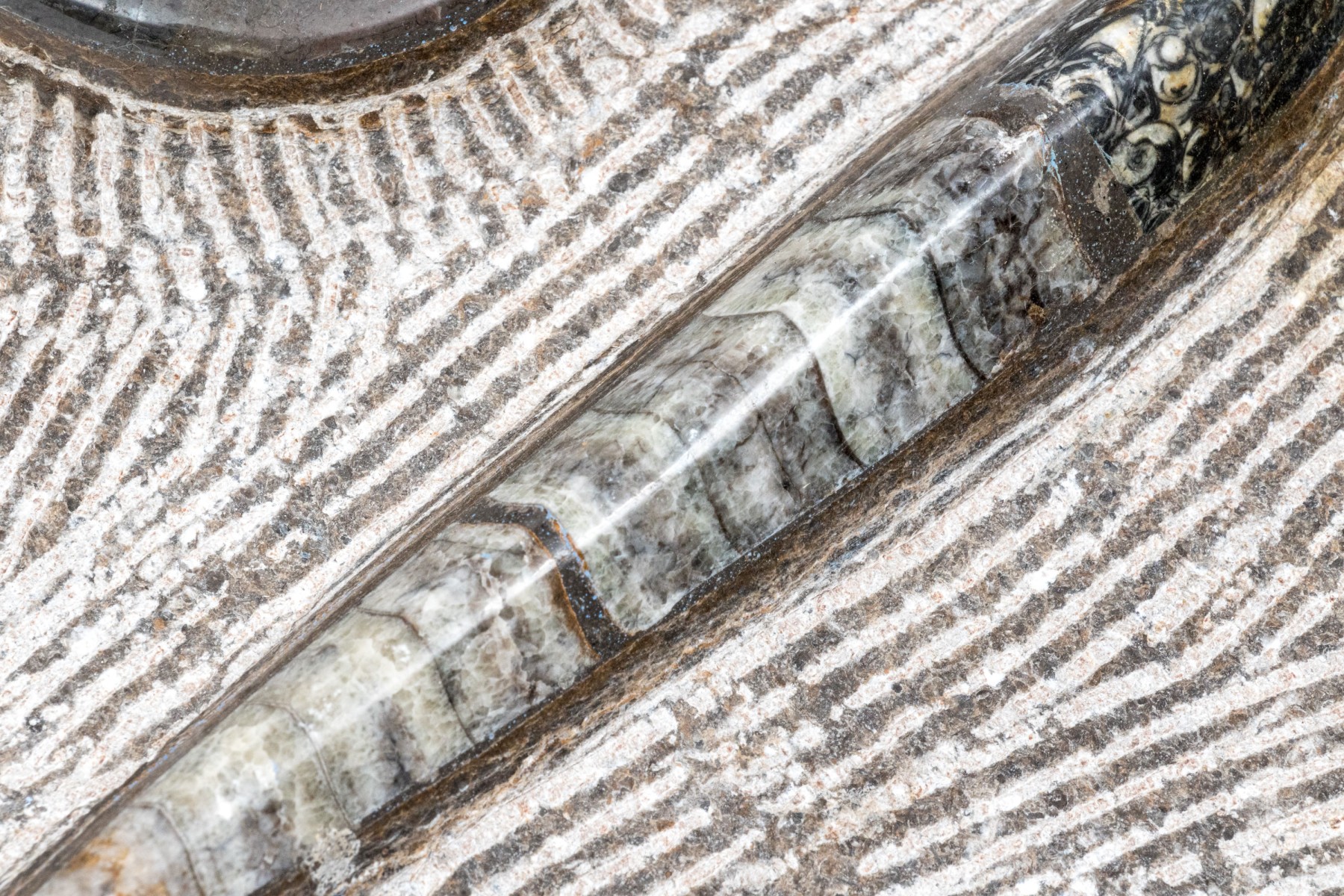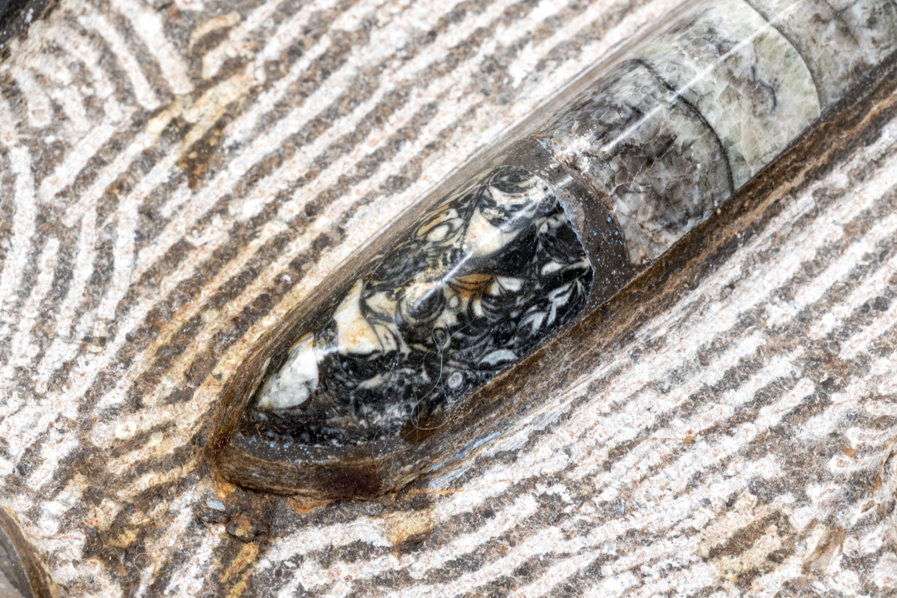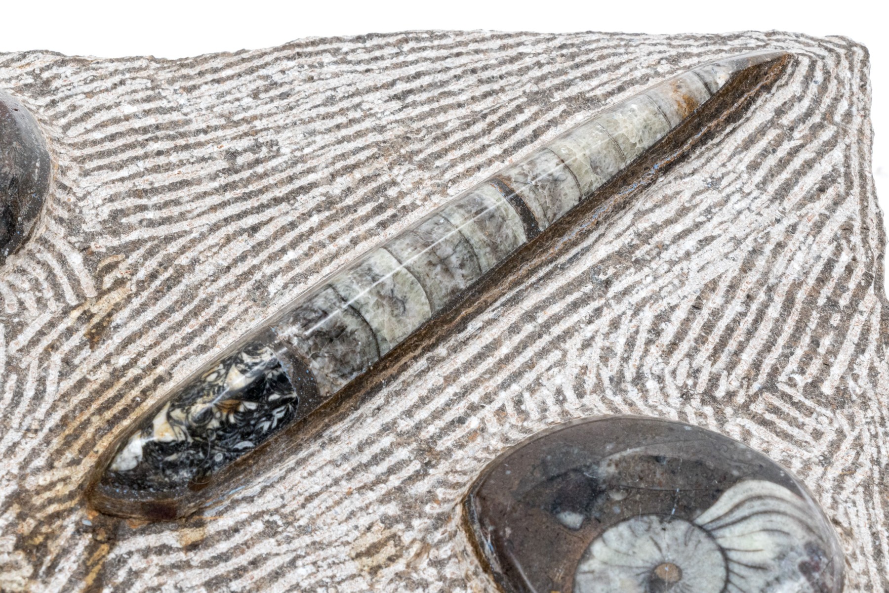 An irregular gray ridged stone with three polished possible ammonite fossils along with a single tubular one. Repair lines across the stone and along the tube.