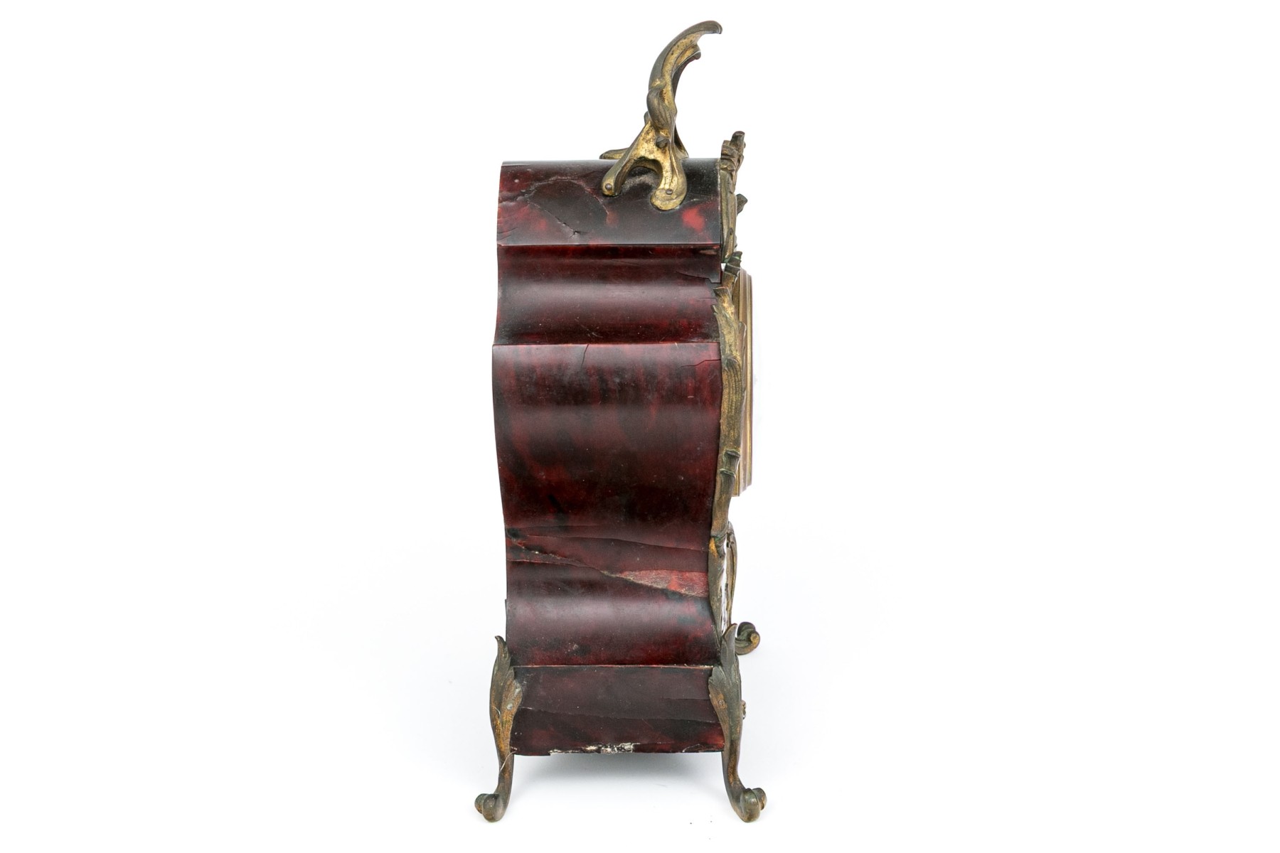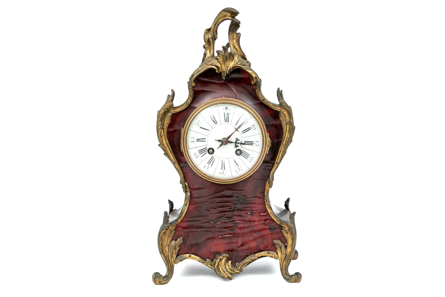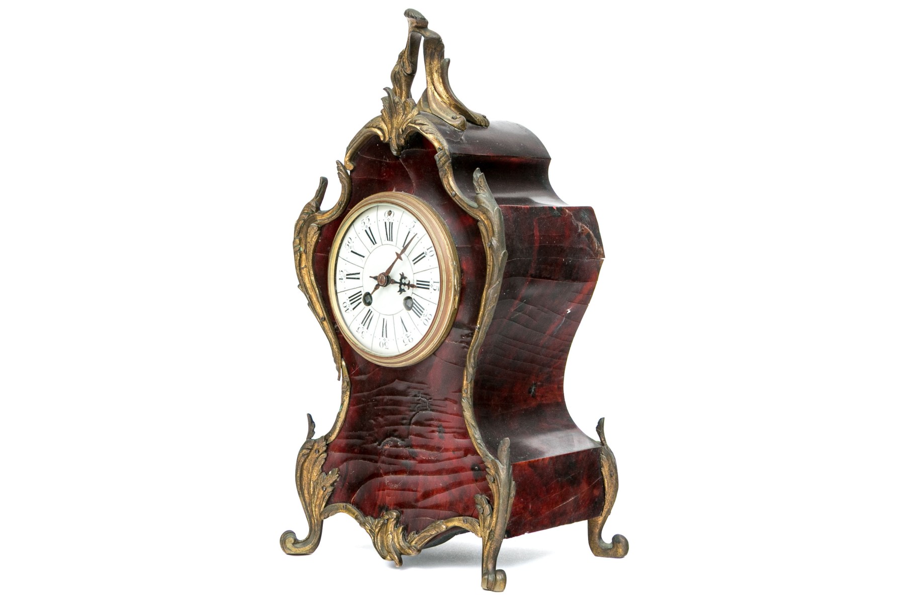 An elegantly designed antique mantel clock sporting a white dial with Roman numeral and Arabic numerals in a shapely red-brown veneered case with gilt bronze foliate trims raised on flourished feet.