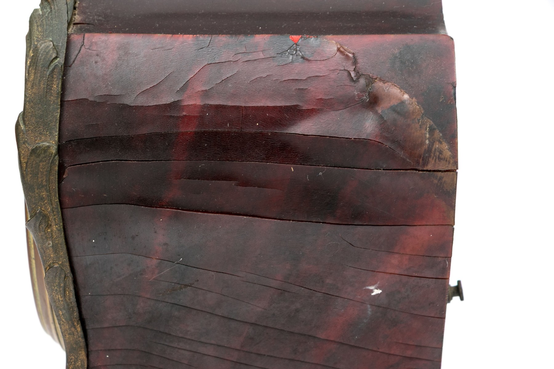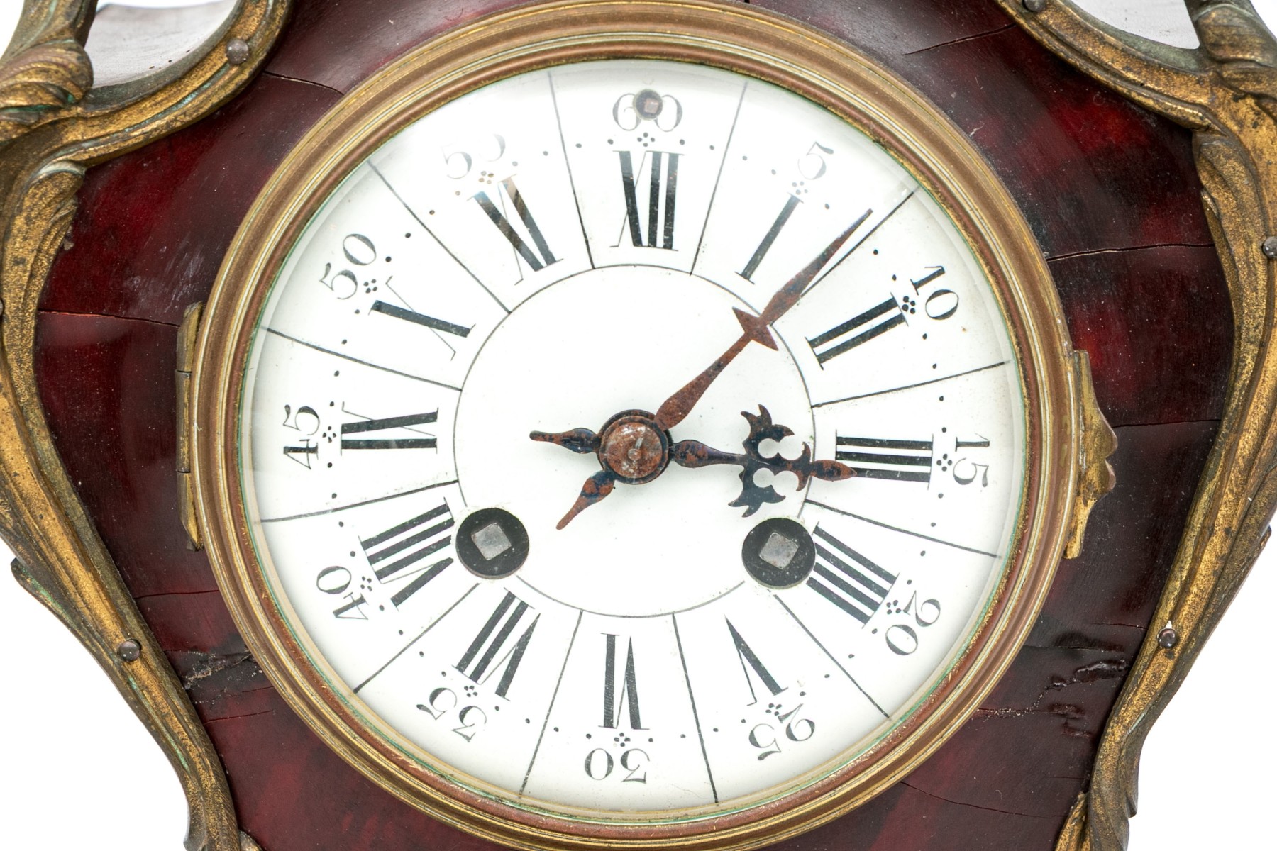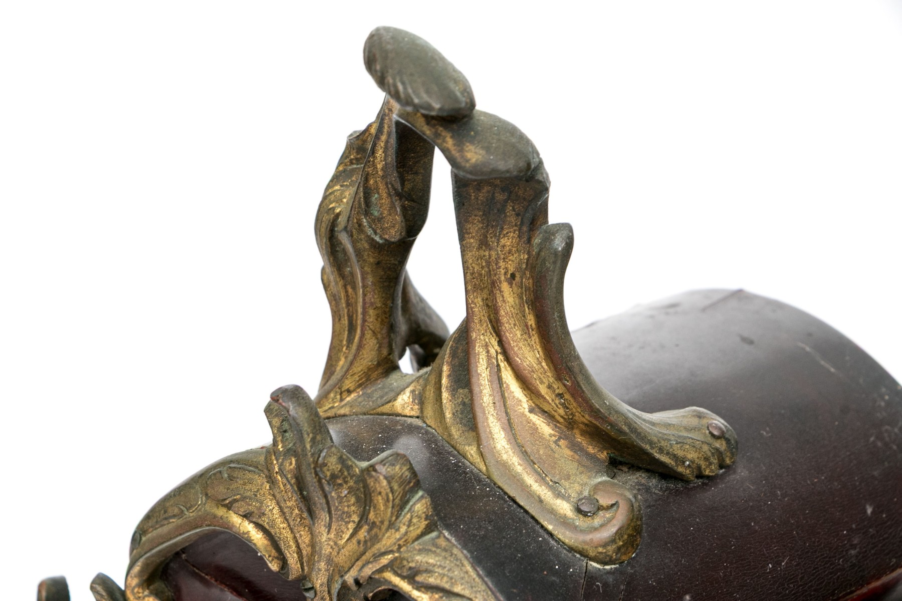 An elegantly designed antique mantel clock sporting a white dial with Roman numeral and Arabic numerals in a shapely red-brown veneered case with gilt bronze foliate trims raised on flourished feet.