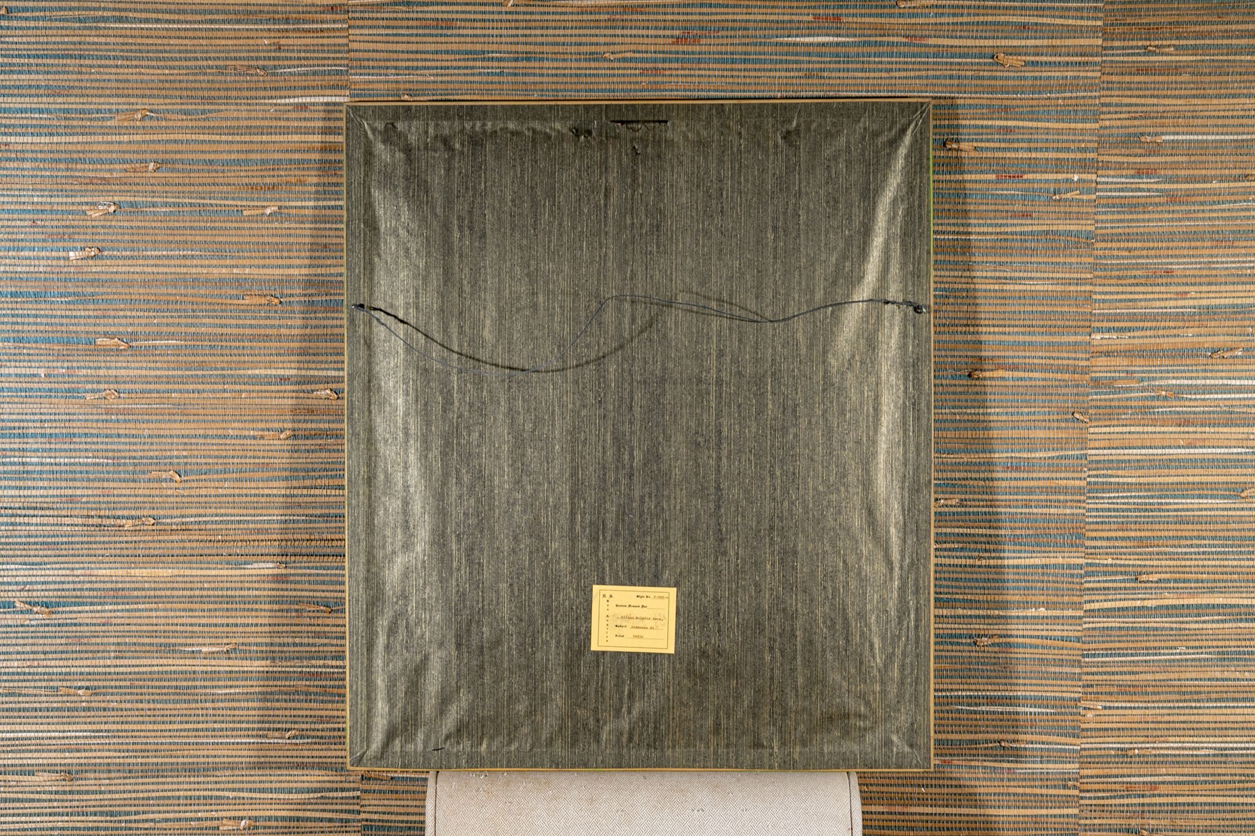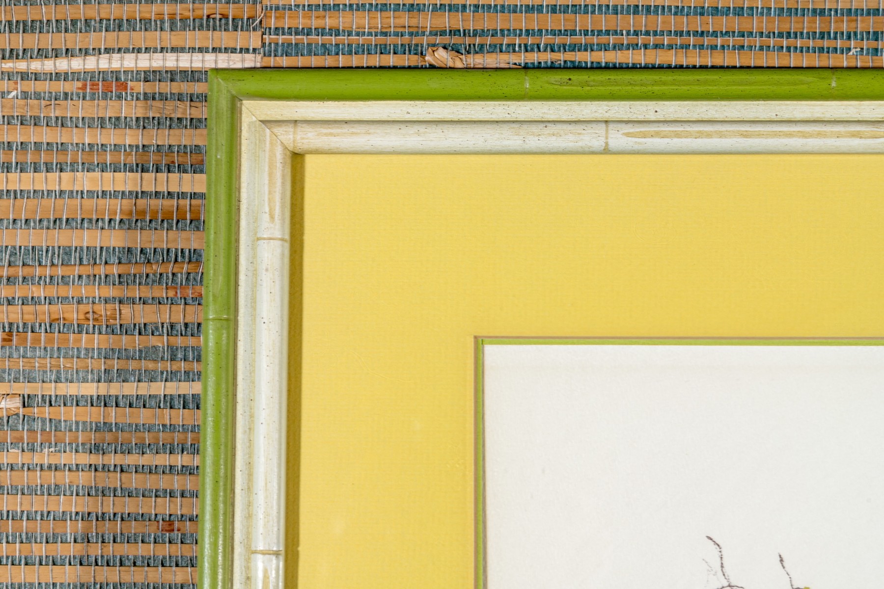 Presented in a bamboo form frame in green and cream paint, matted and glazed.