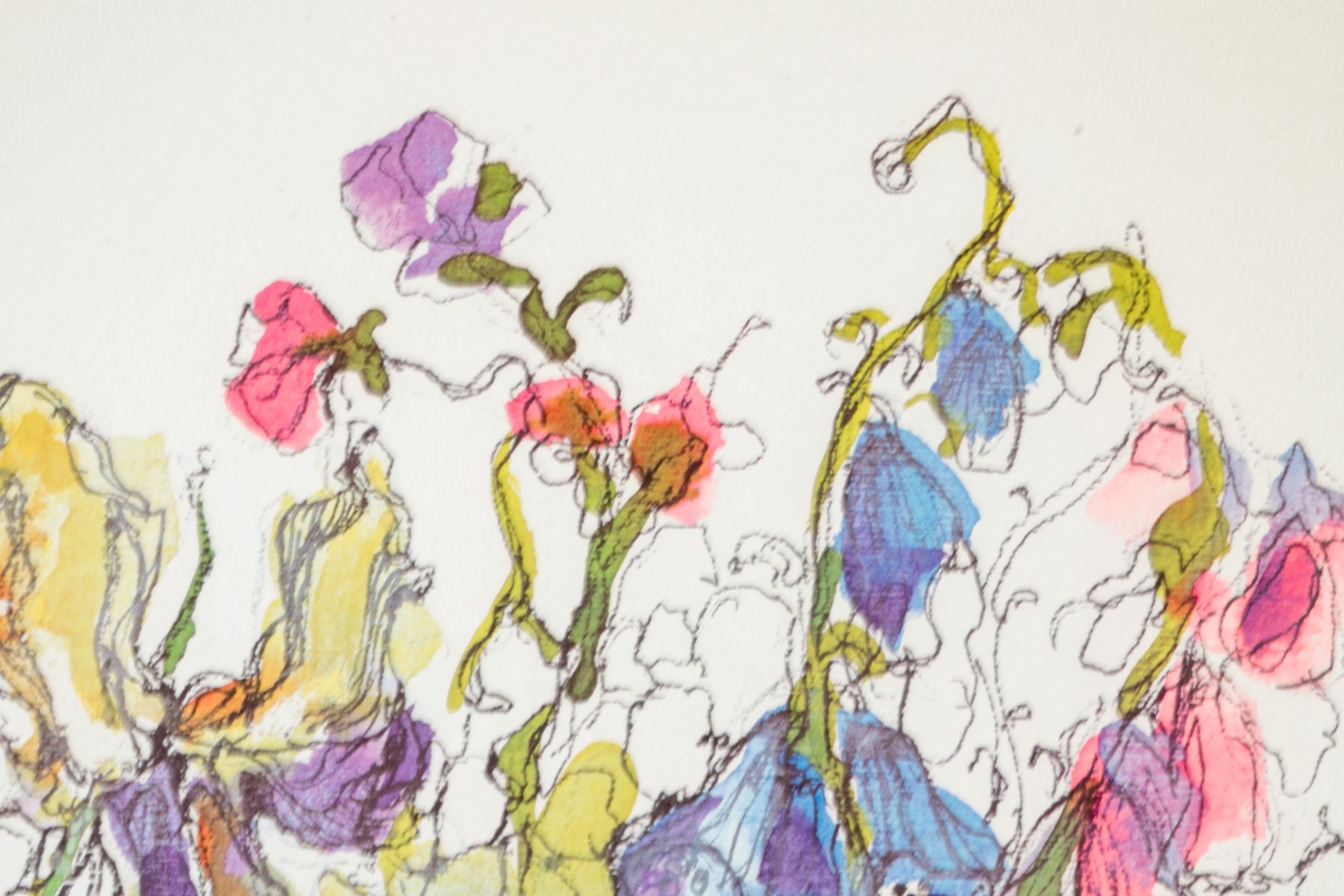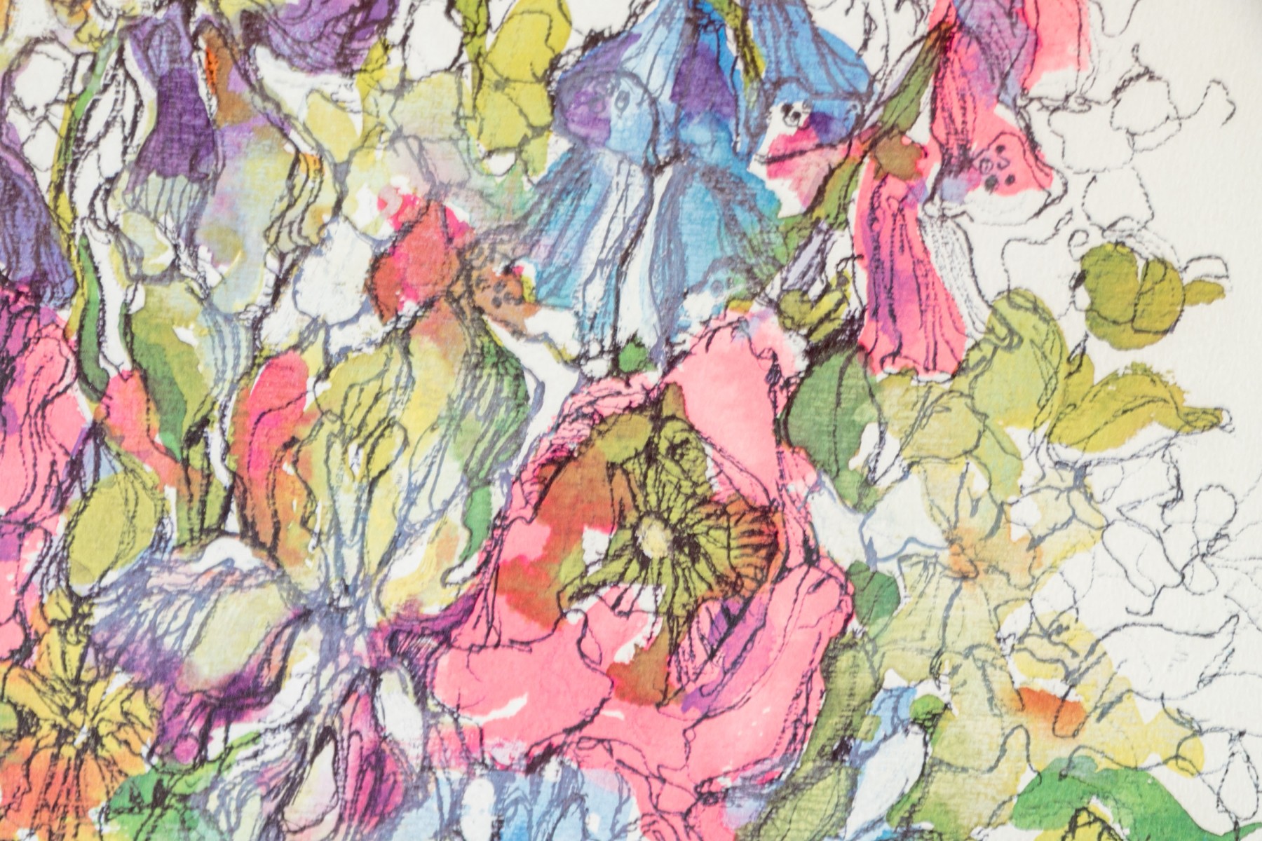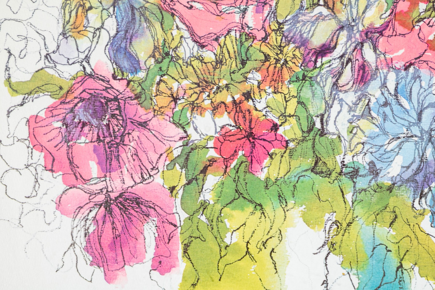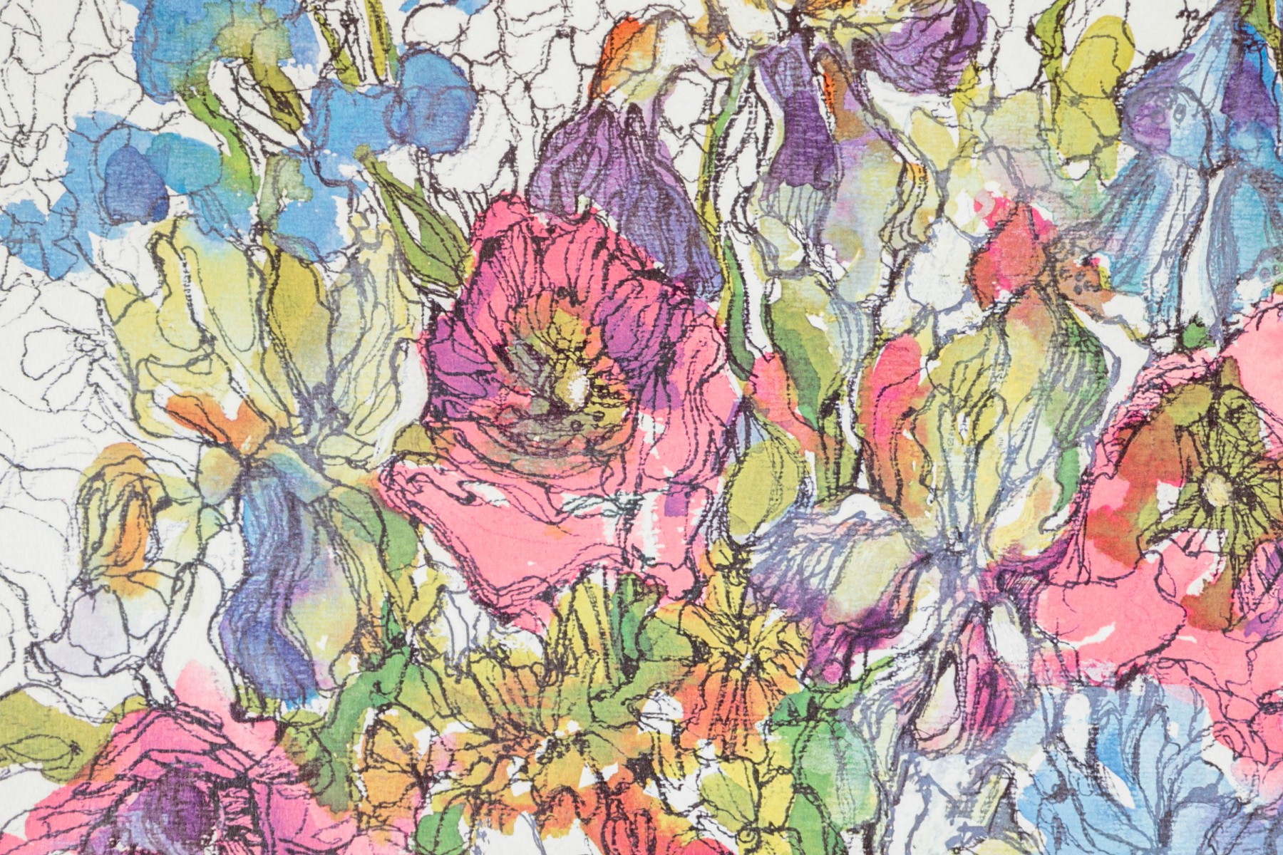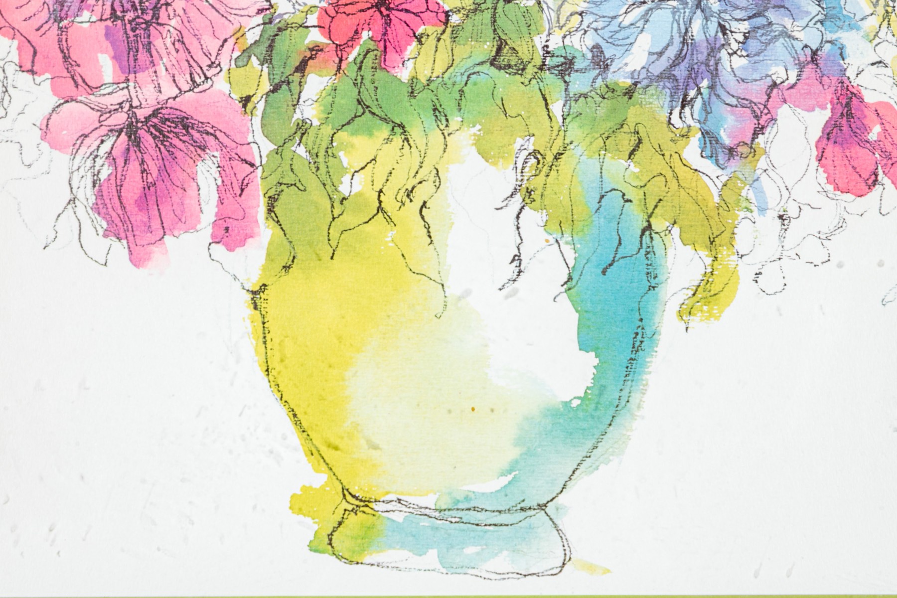 Decorative floral still life depicting a bouquet of colorful anemones along with other flowers in a vase on a table top surface.