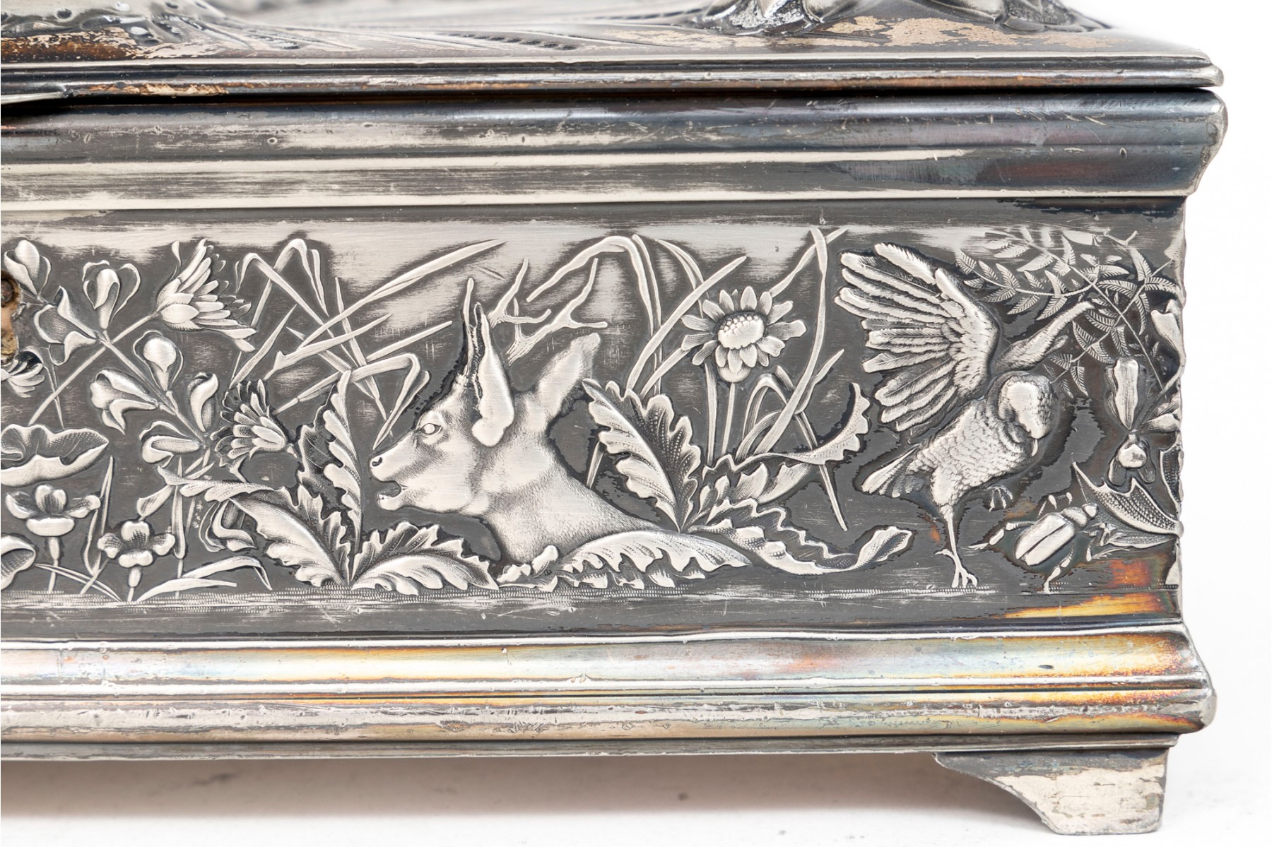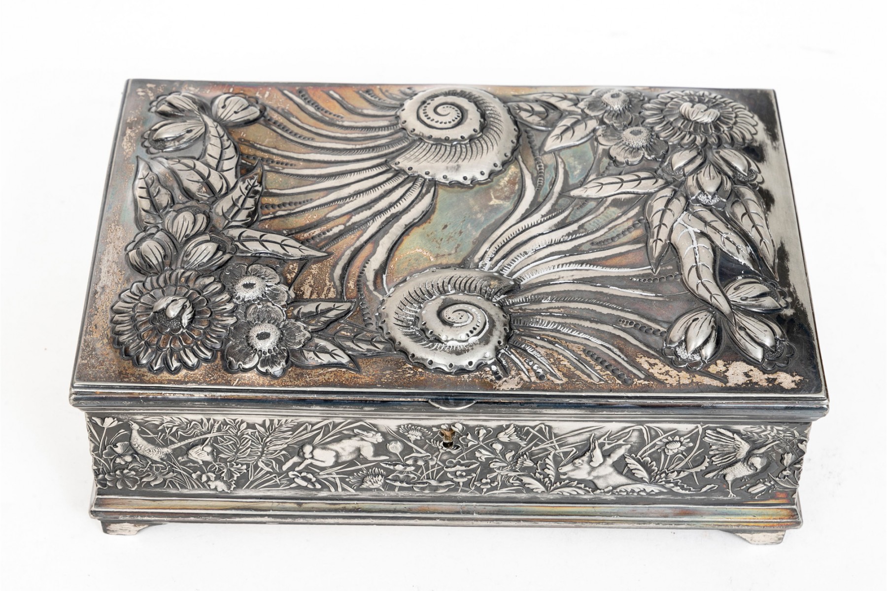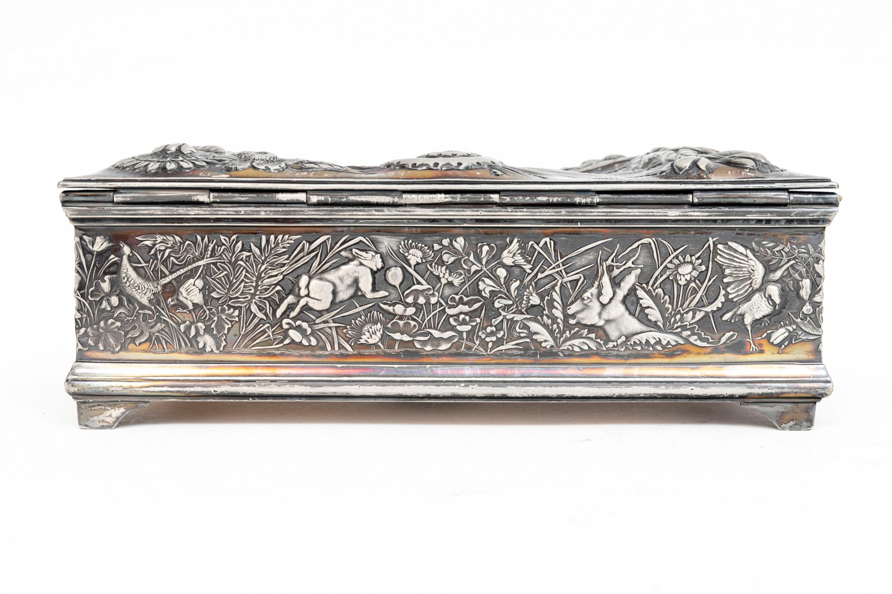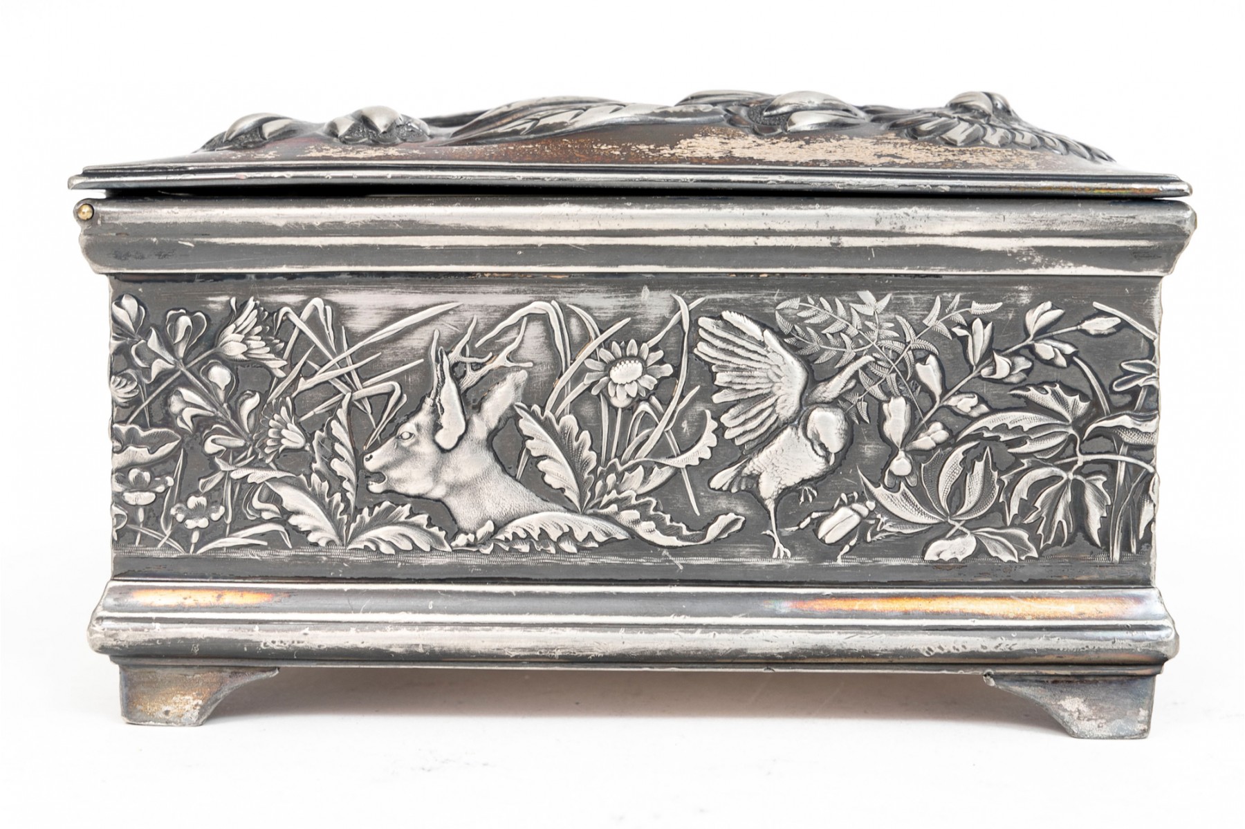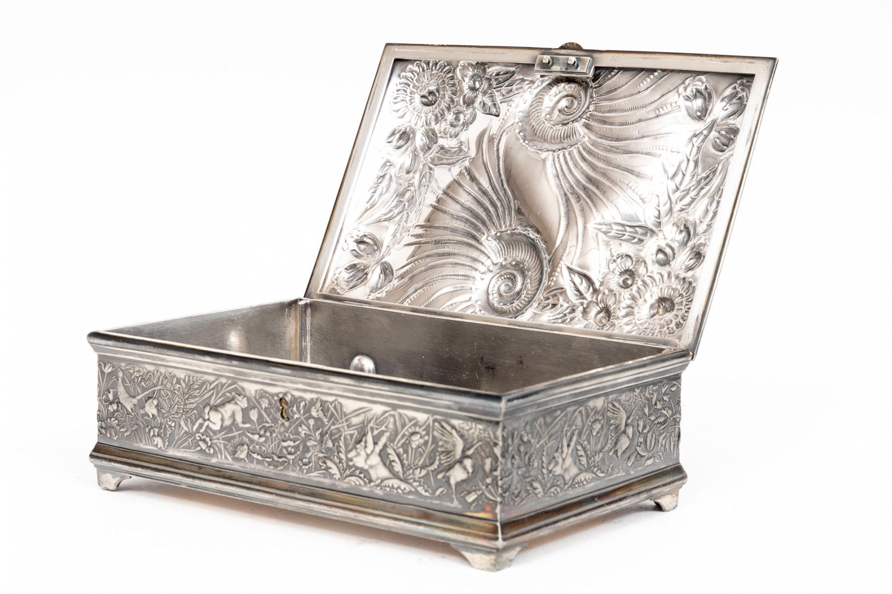 A 19th century American silver plated dresser box, heavily repousse in aquatic and floral motifs. The banded apron repousse is a woodland motif with animals. Rogers Brothers