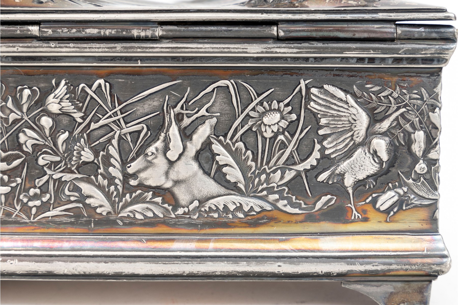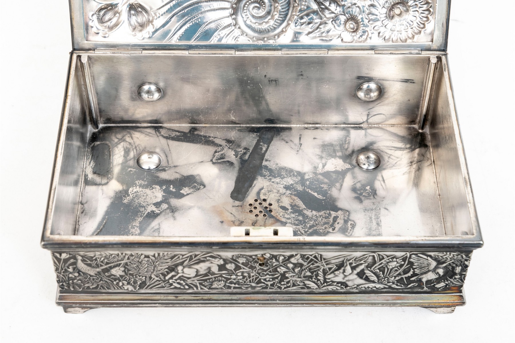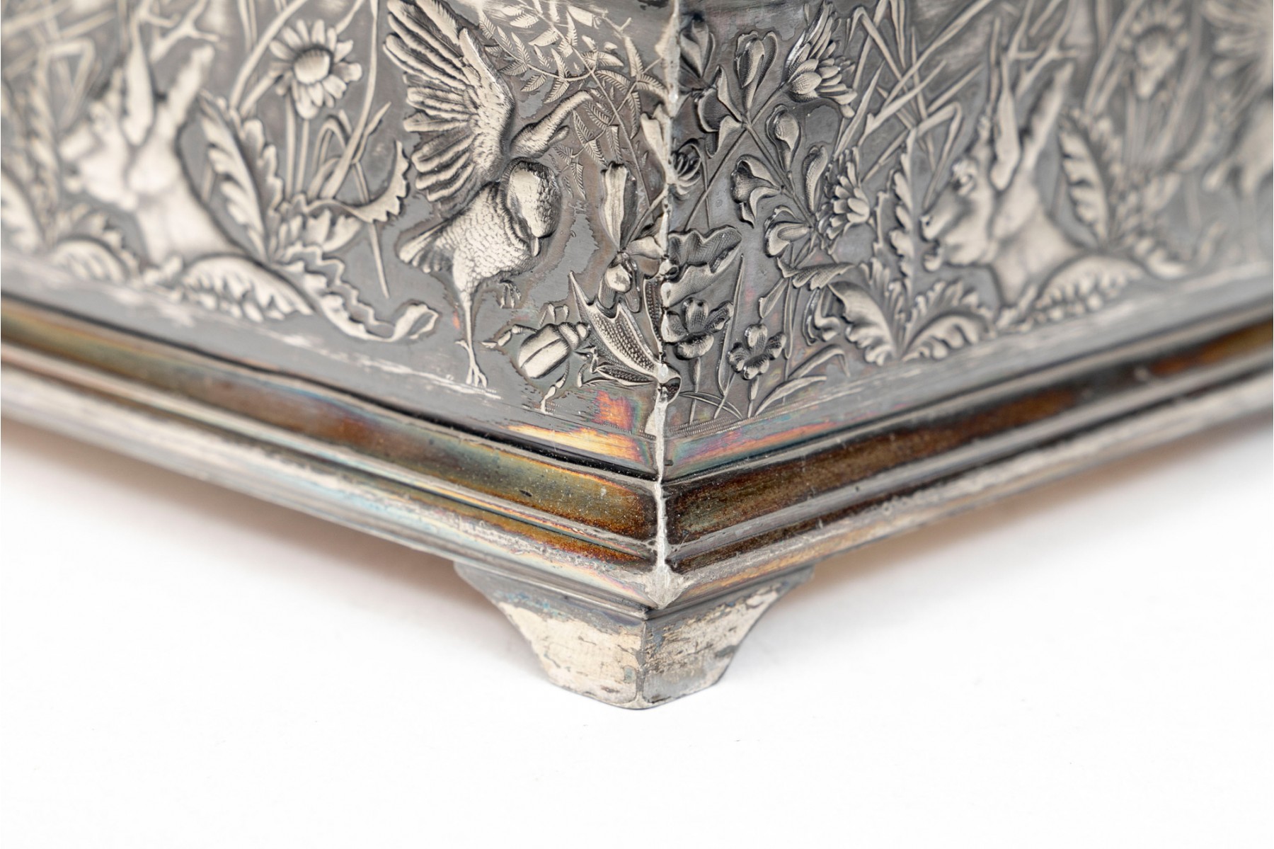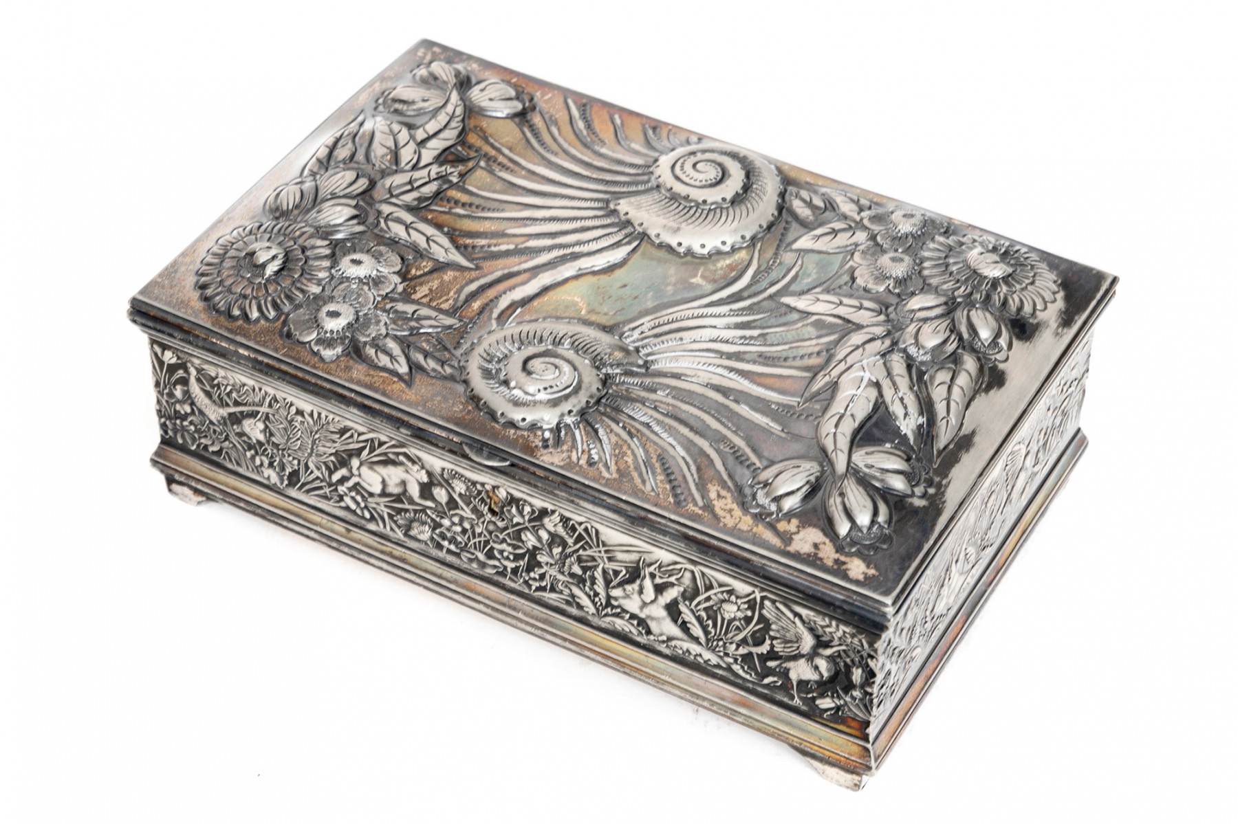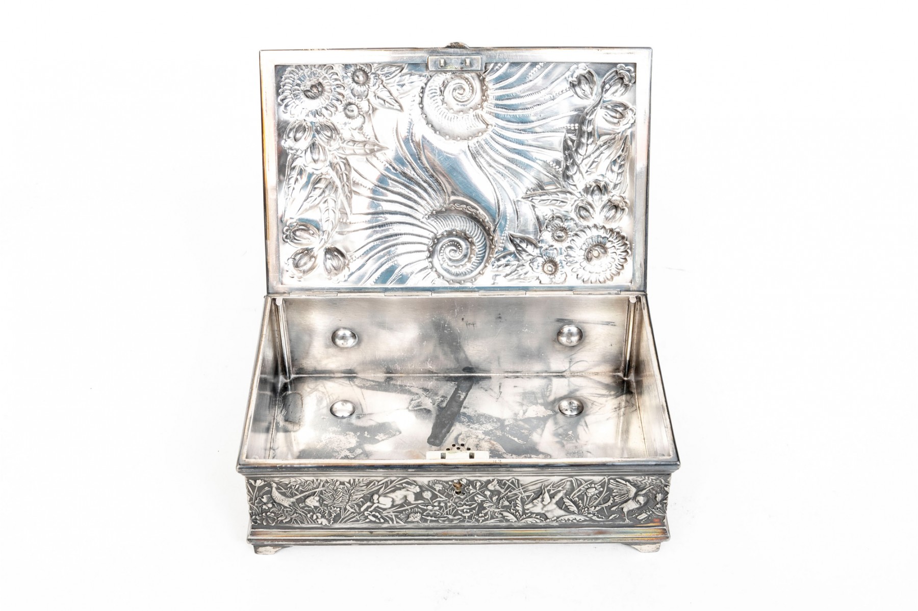 A 19th century American silver plated dresser box, heavily repousse in aquatic and floral motifs. The banded apron repousse is a woodland motif with animals. Rogers Brothers