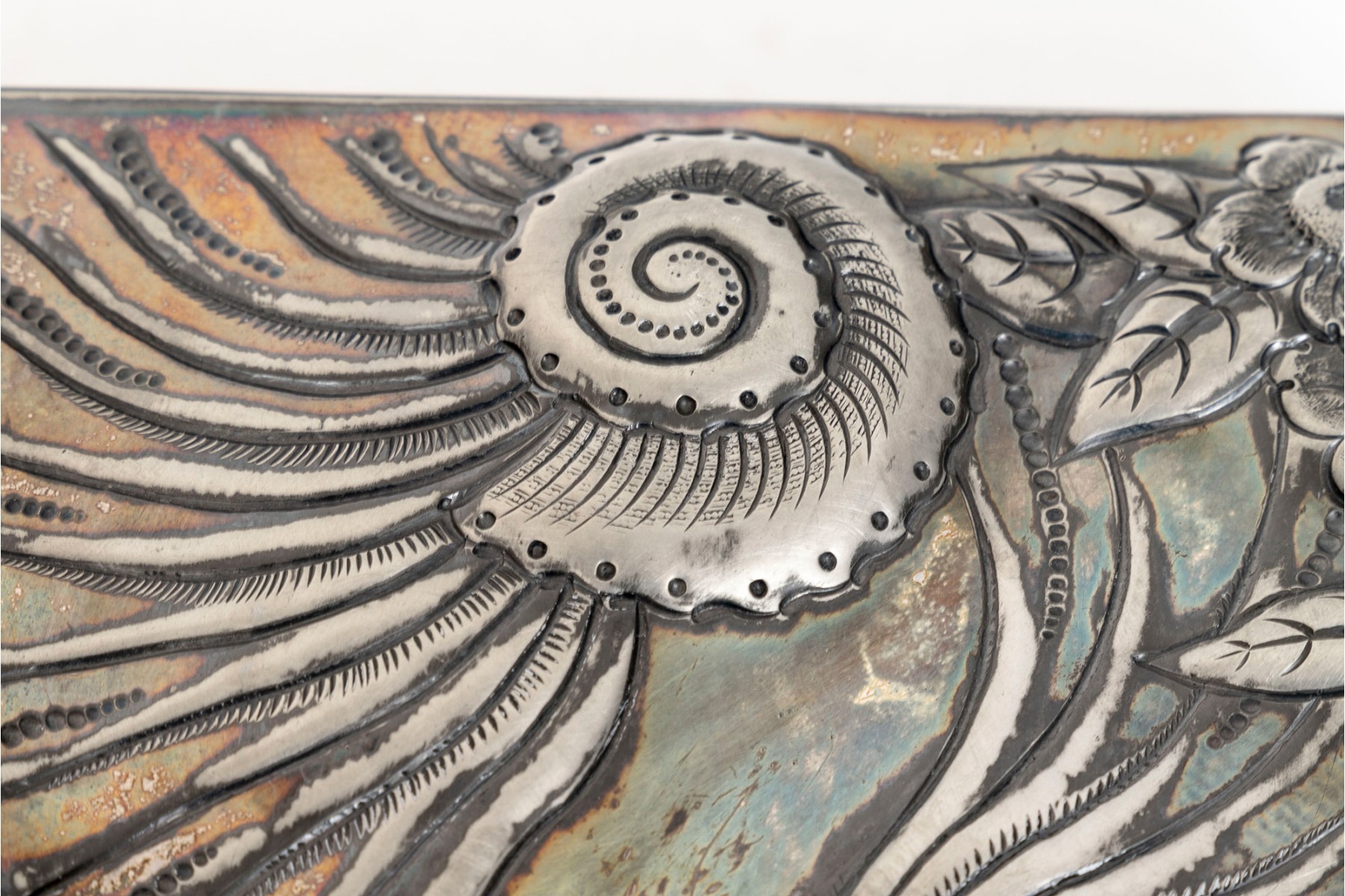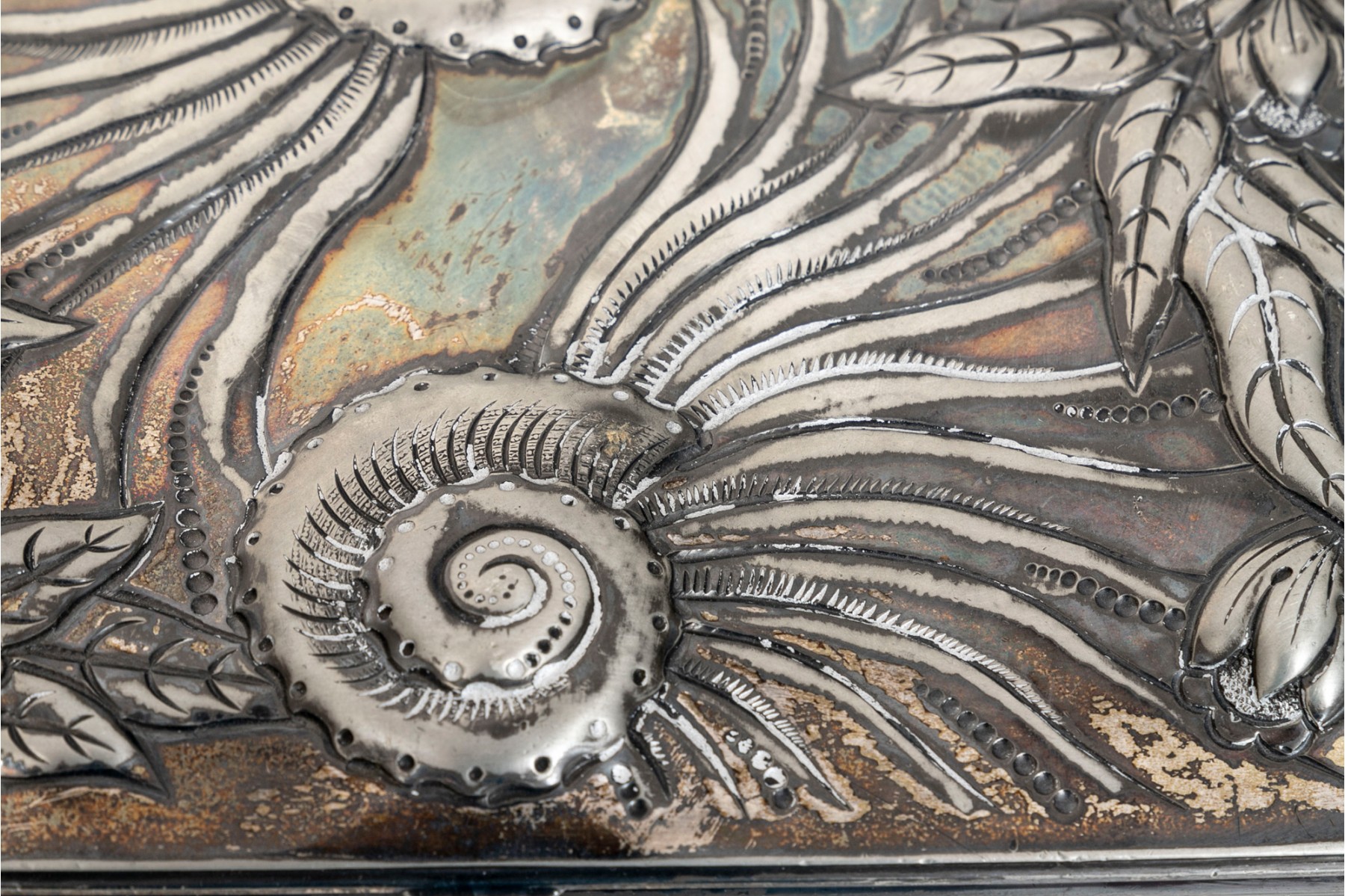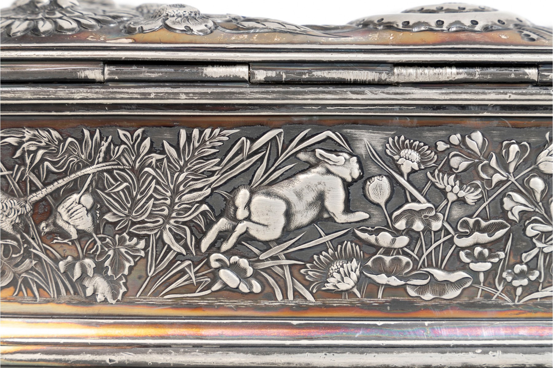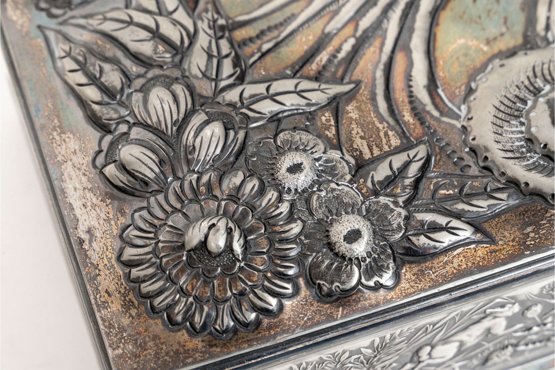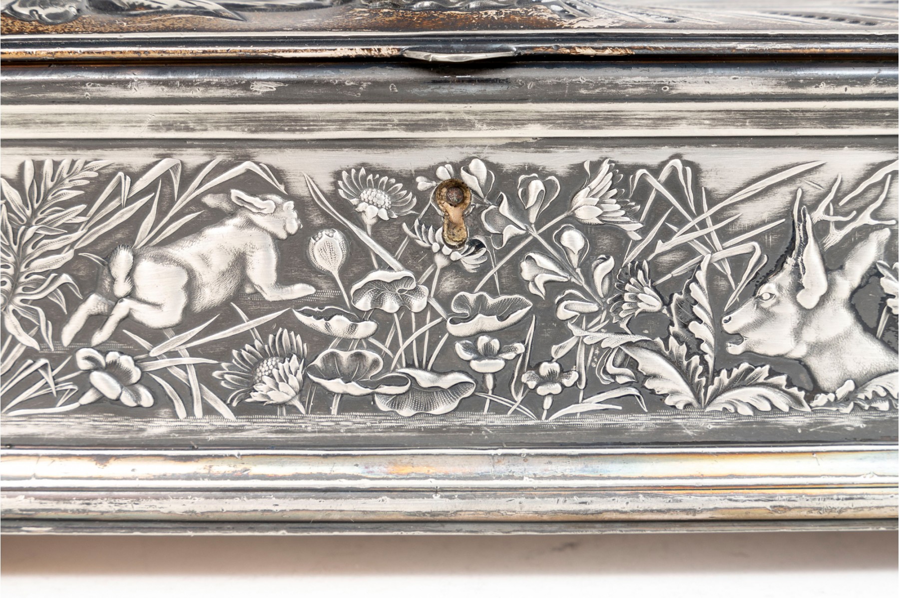 A 19th century American silver plated dresser box, heavily repousse in aquatic and floral motifs. The banded apron repousse is a woodland motif with animals. Rogers Brothers
