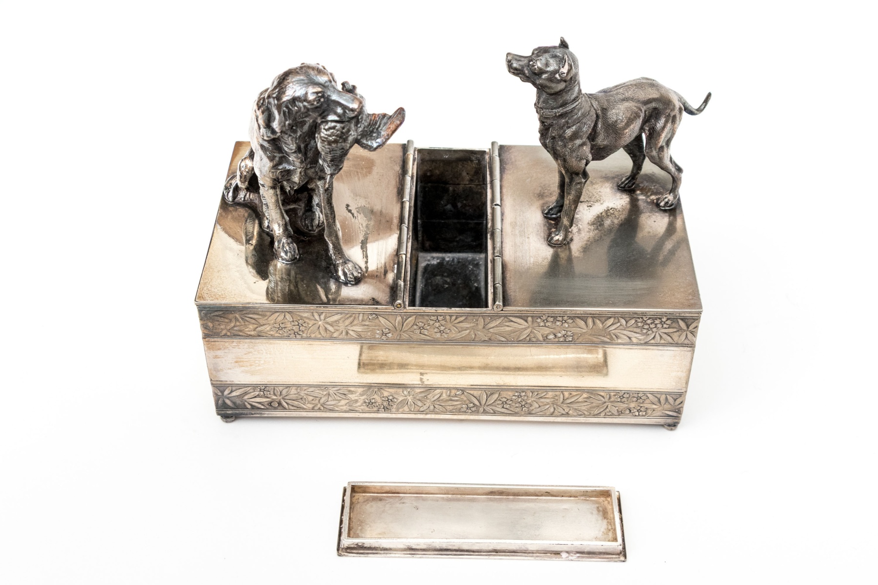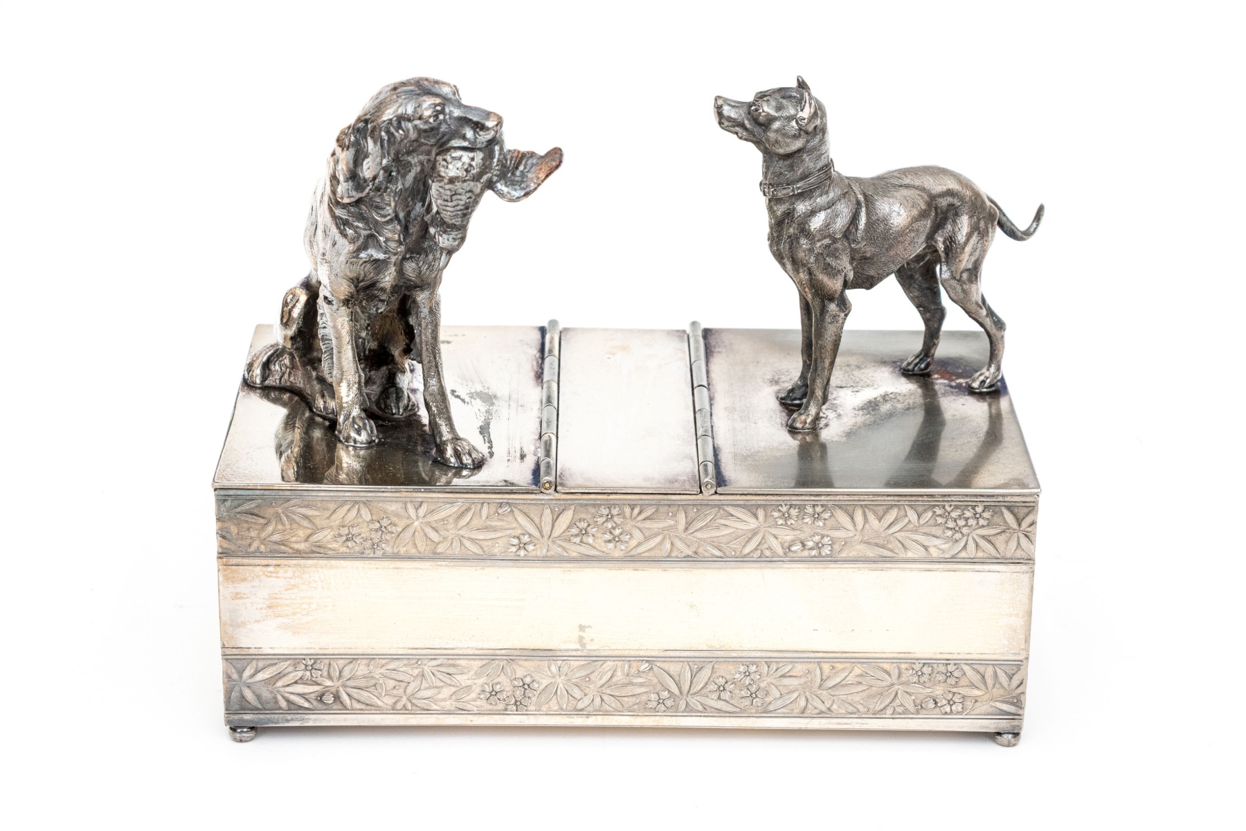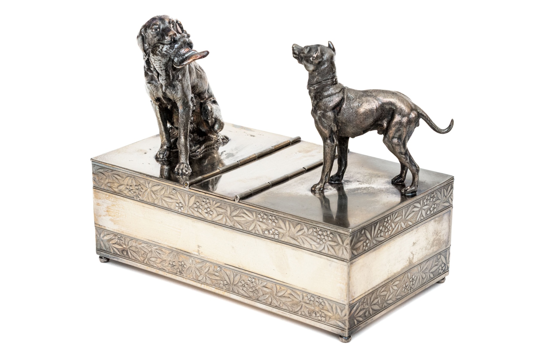 A charming 19th century Rogers Smith & Co. Meriden silver plated humidor showcasing two dogs on two larger lidded compartments flanking a thinner rectangular center. The body is beautifully decorated by bands of foliate relief and is raised on small circular feet.