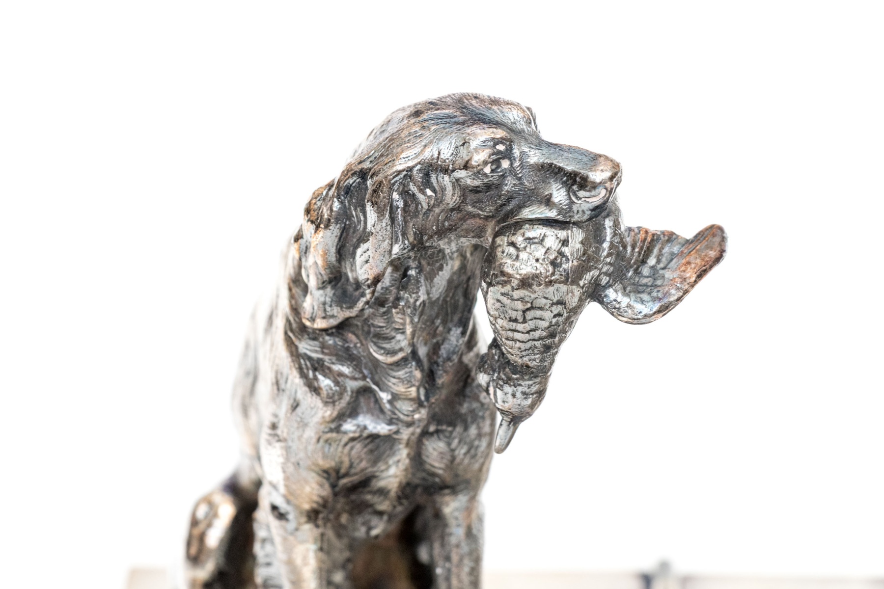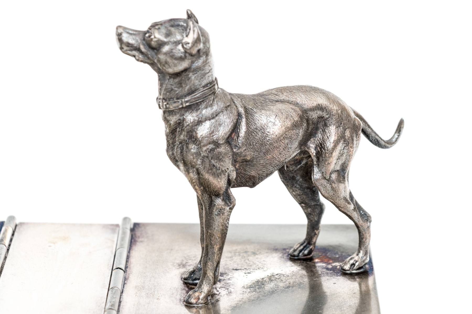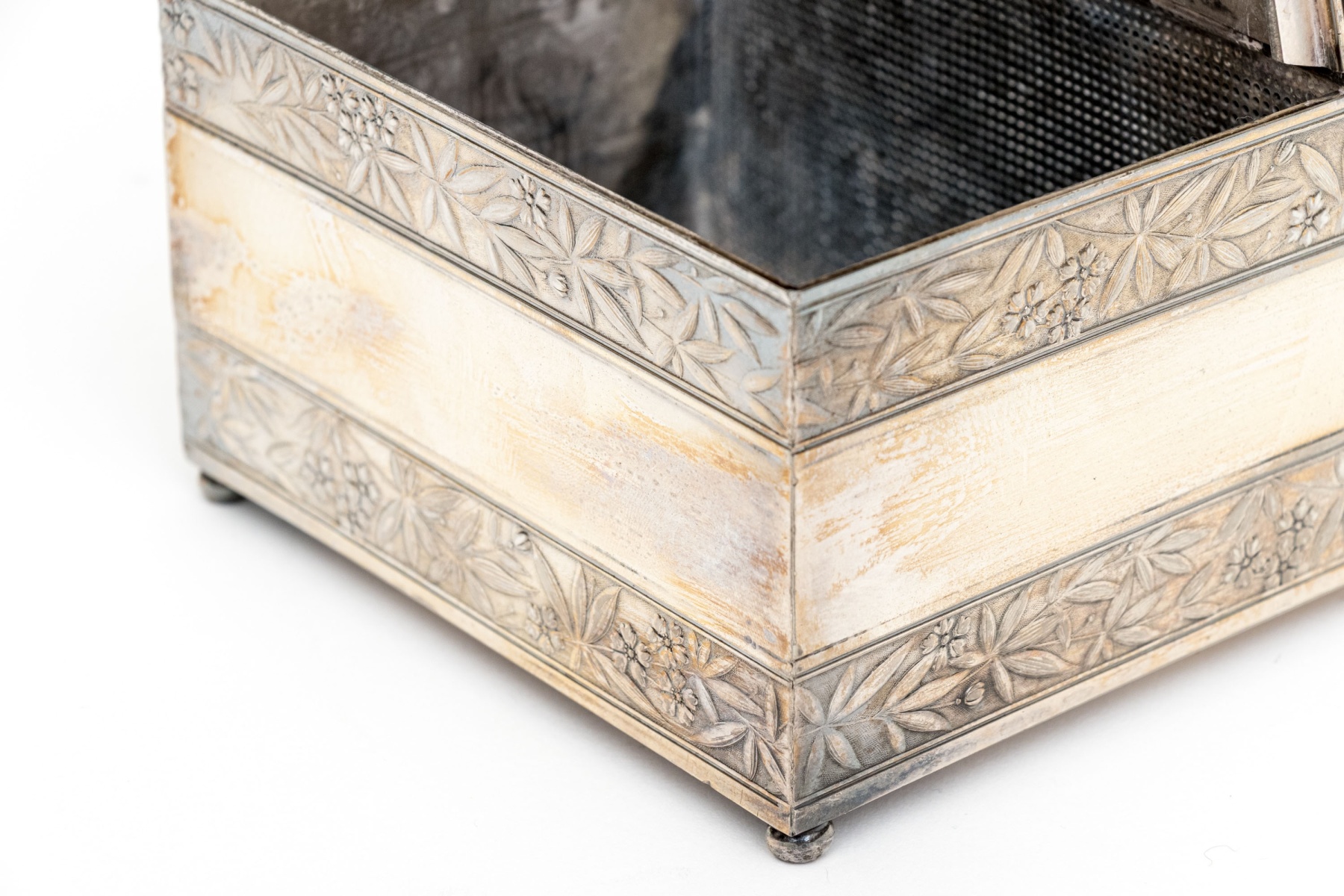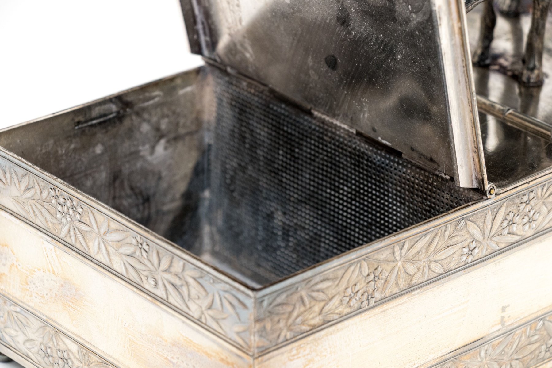 A charming 19th century Rogers Smith & Co. Meriden silver plated humidor showcasing two dogs on two larger lidded compartments flanking a thinner rectangular center. The body is beautifully decorated by bands of foliate relief and is raised on small circular feet.